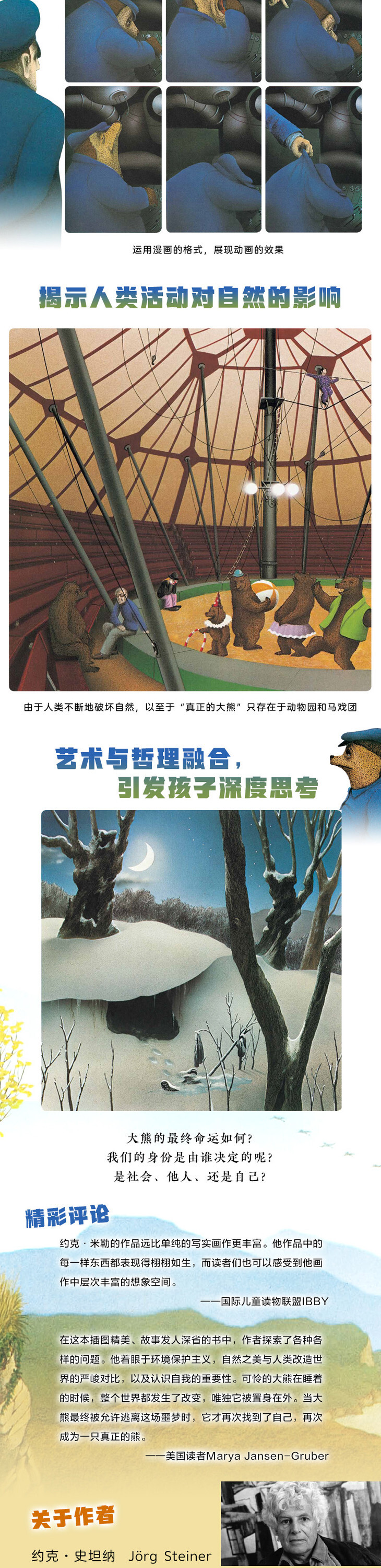 除了克里斯·范·奥尔斯伯格和谢尔·希尔弗斯坦的作品,很少有人会评价一本儿童读物改变了他们看世界的方式,但我还会加上约克·米勒和约克·史坦纳的作品。《森林大熊》《再见,小兔子》和《推土机年年作响,乡村变了》涉及了一些***微妙的话题,例如自我发现,动物福利,工作自由的概念VS关在笼子里的舒适,以及城市发展对环境的影响。孩子们可以通过这样的方式来理解并讨论这些深刻的话题。——美国读者McYa