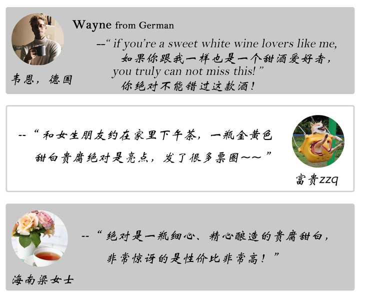 配餐:宜用作餐前酒,亦适宜配鹅肝、白肉、奶酪。