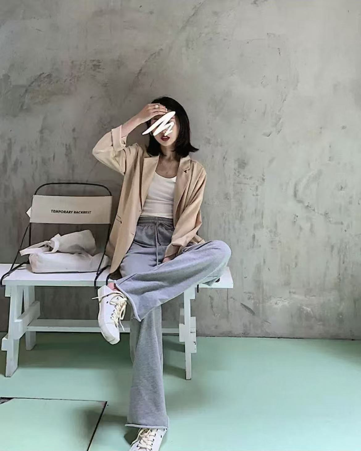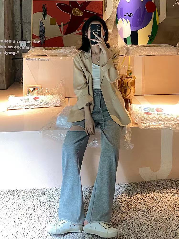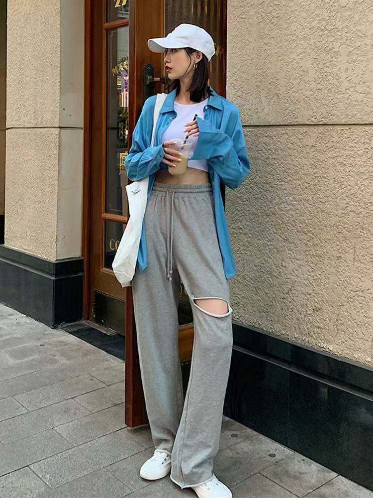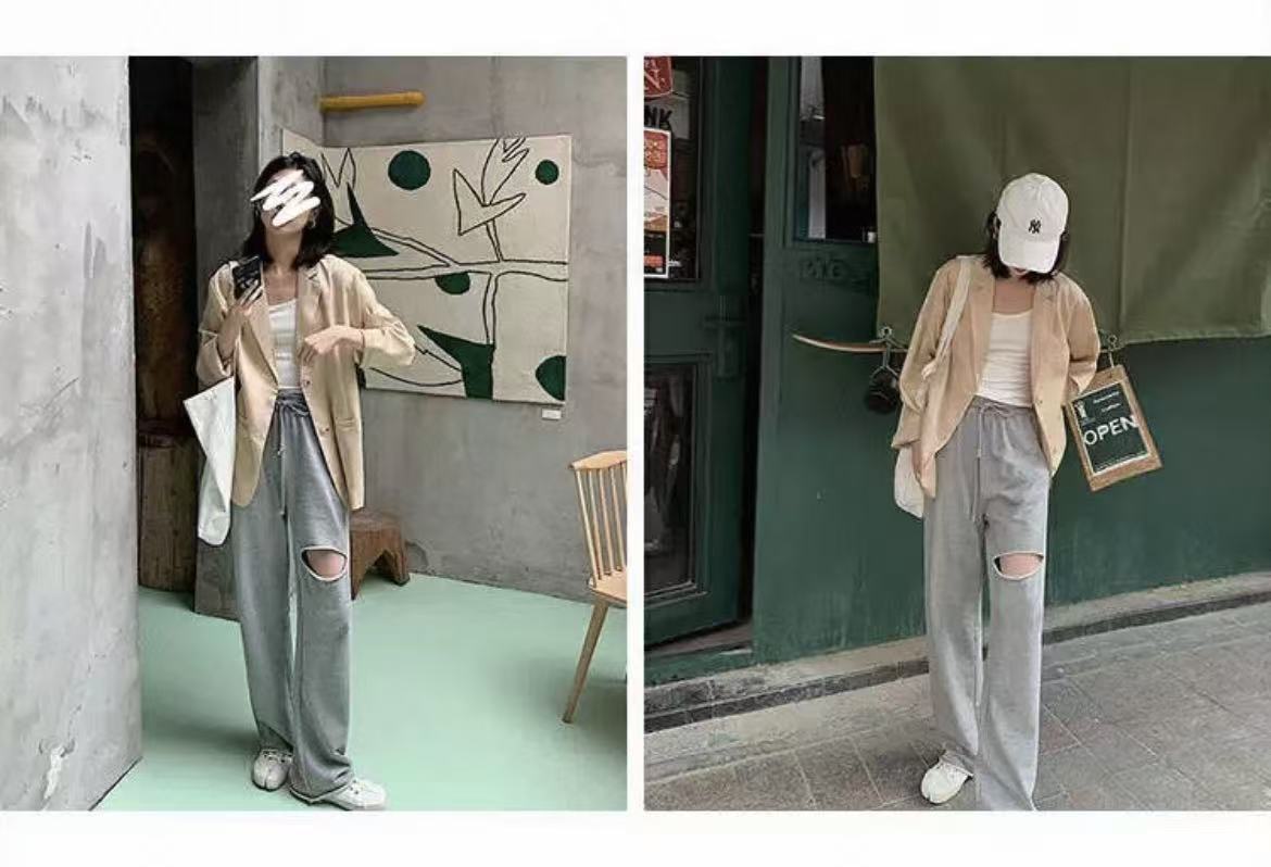 11.11直降到底!!【秋上新】卫裤系列灰色破洞卷边毛圈加长款卫裤-喜出