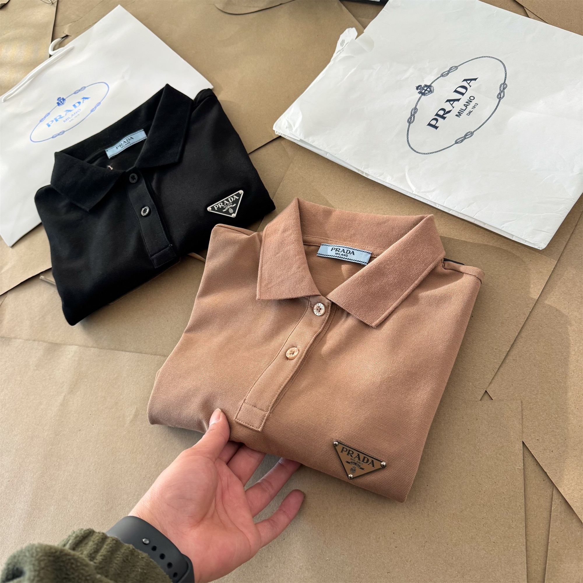 穿上普拉达的这款宽松短袖,才知道什么是人间太值得!专为都市精英量身定制的POLO领短袖!每个人都能找到自己特别喜欢的颜色!搭配牛仔裤或休闲裤 裙子 任何组合都超有气质!胸前简约的三角标志大气吸睛!自带慵懒状态的自信美!