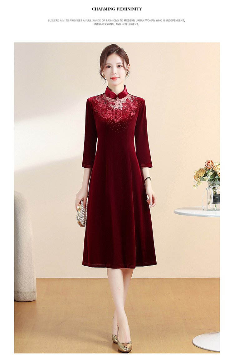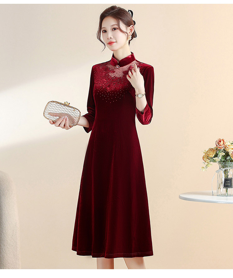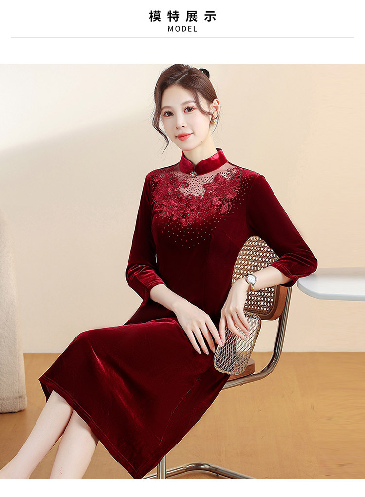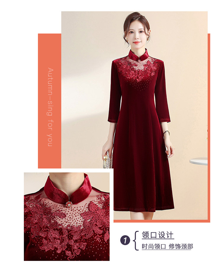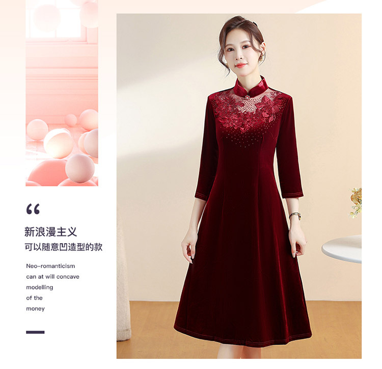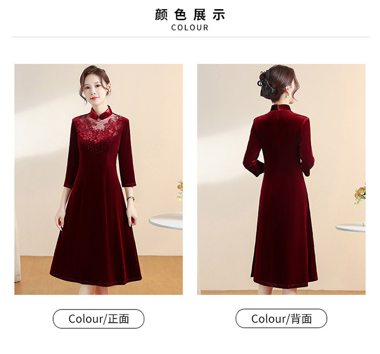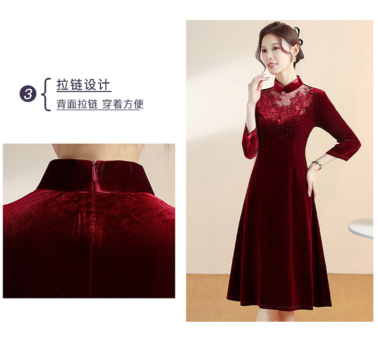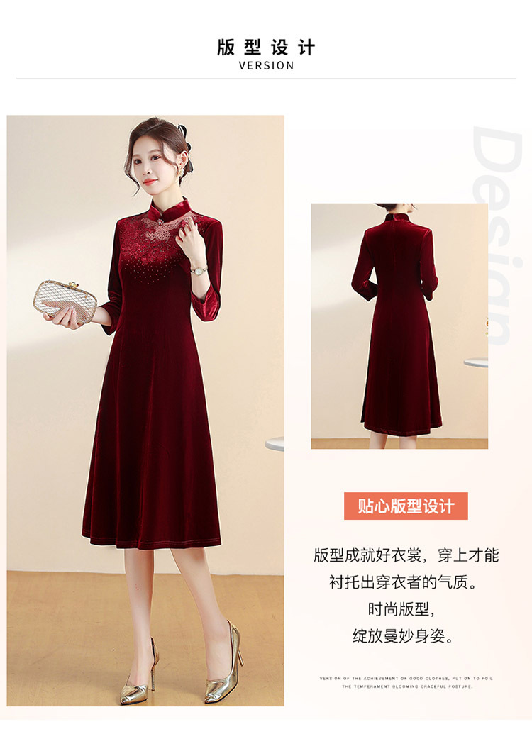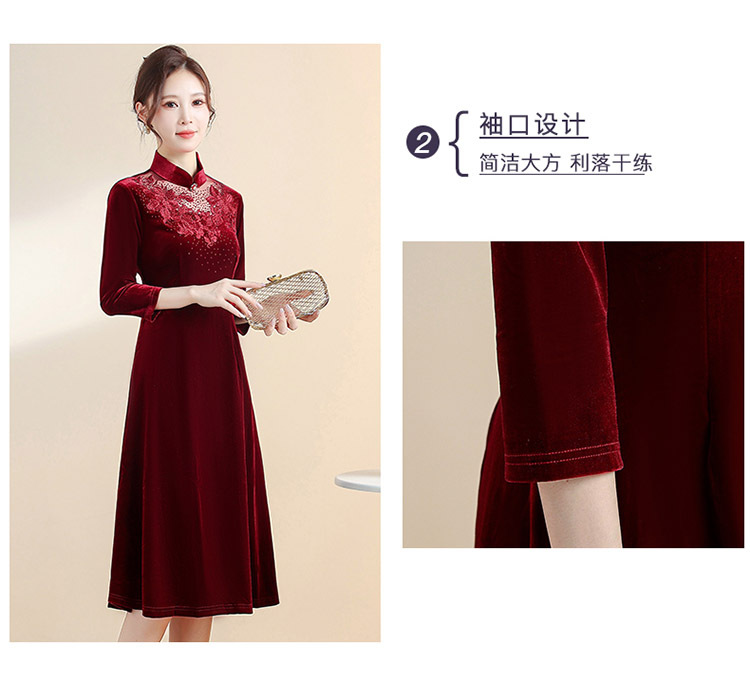 QYM YY2310 -Y时尚金丝绒旗袍连衣裙镶钻气质优雅A字裙