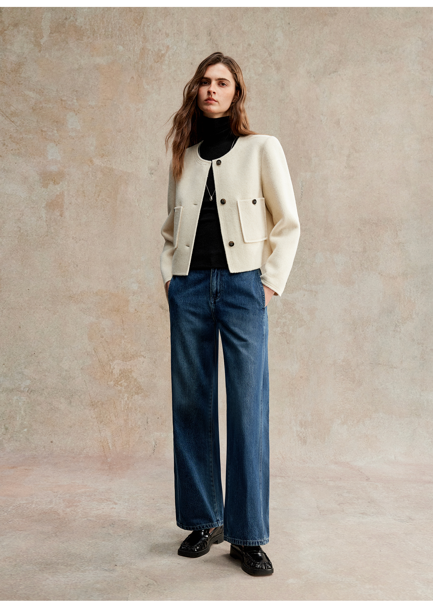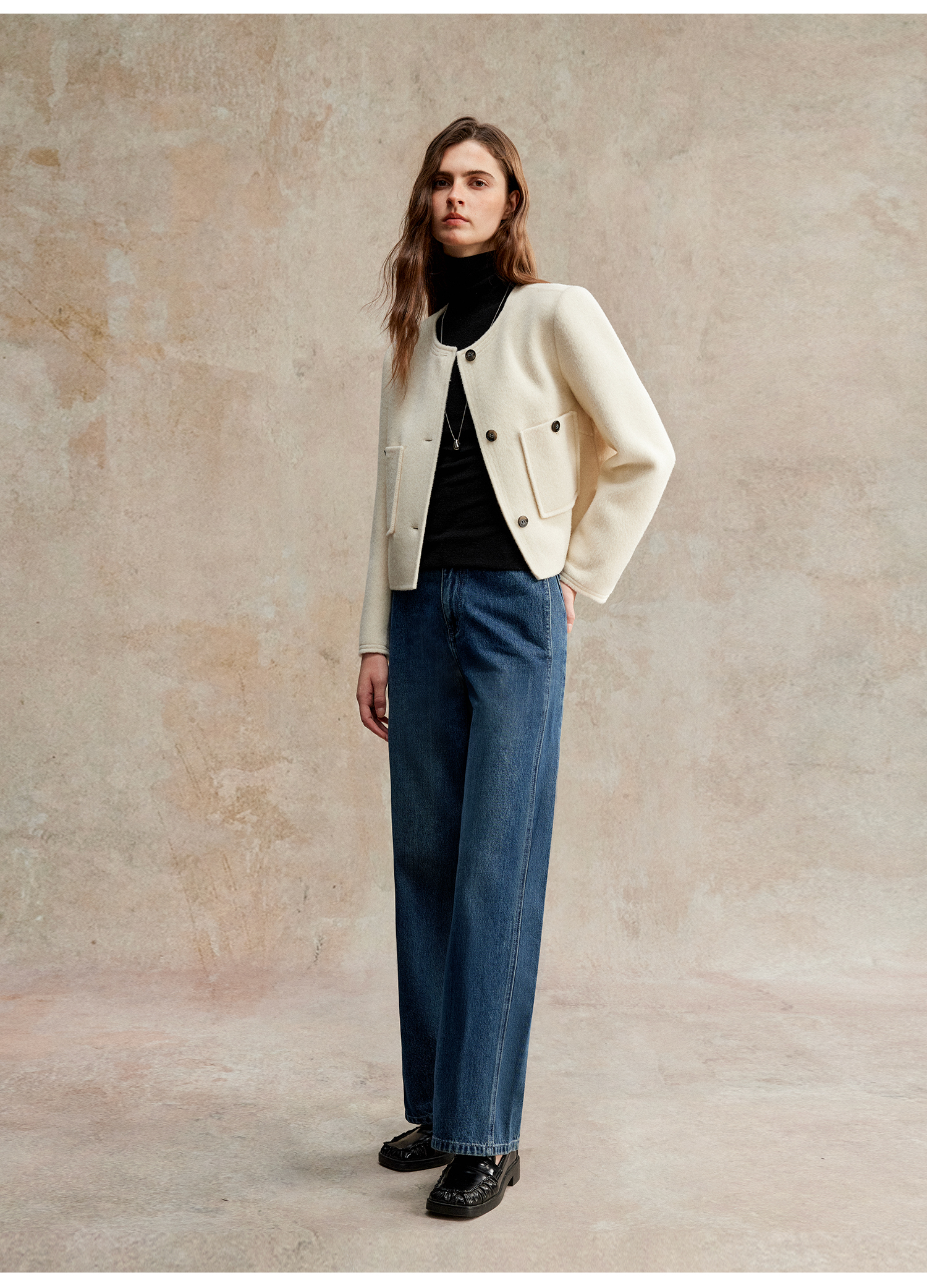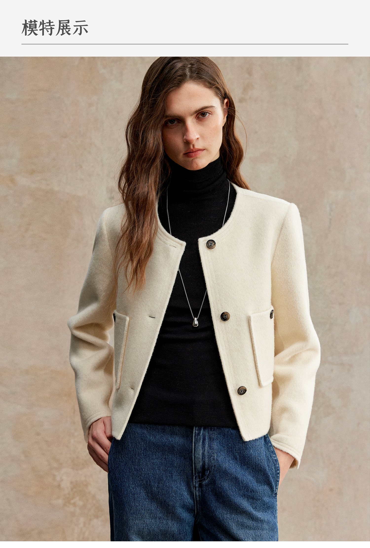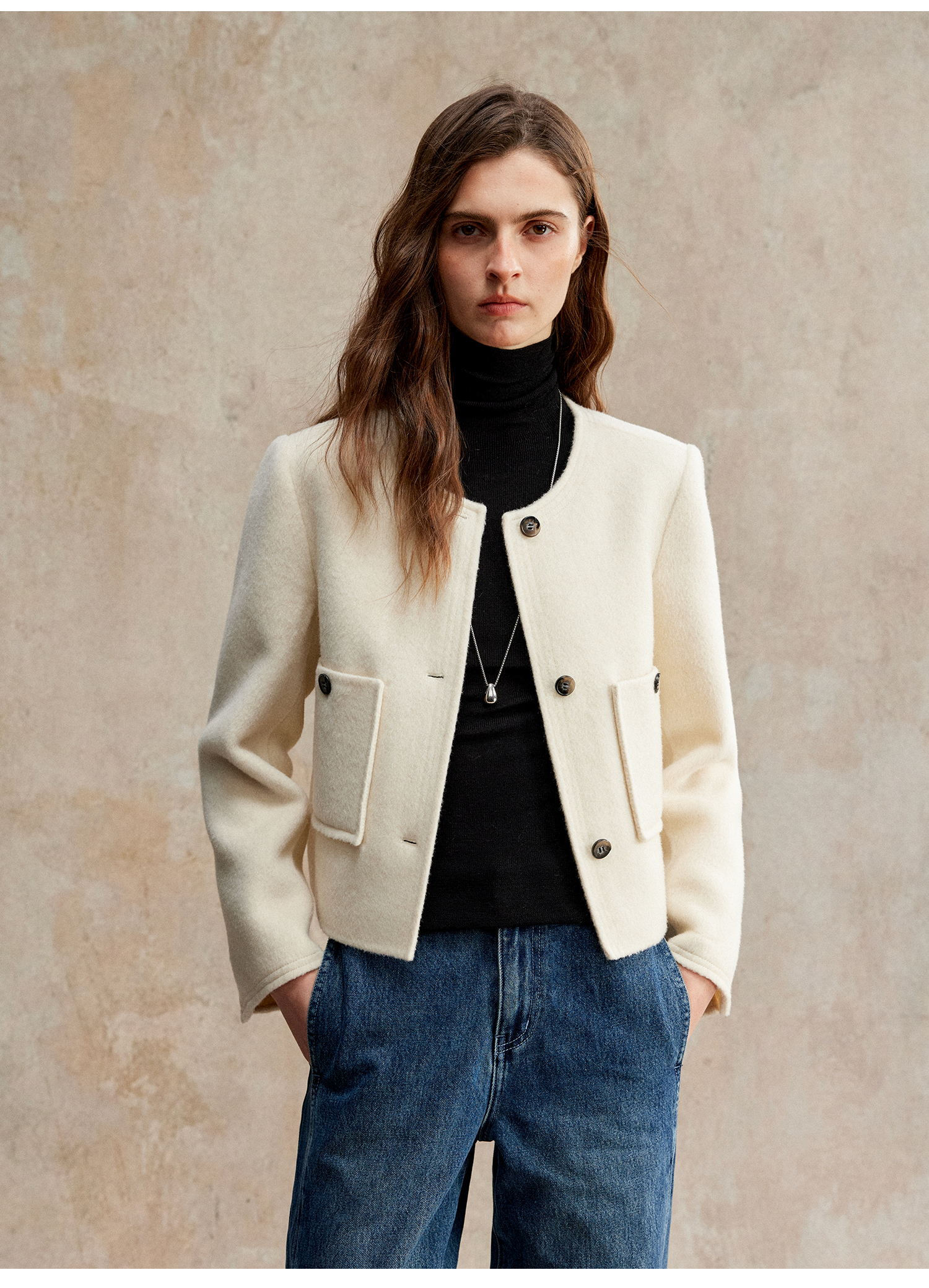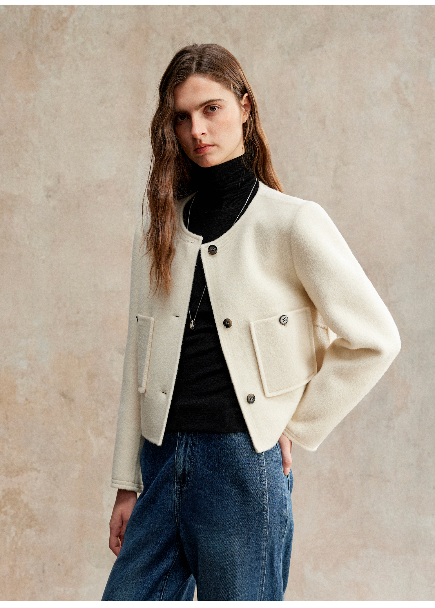 C+IMPRESS/西嘉美利奴羊毛 经典箱型小香风短款圆领双面毛呢外套