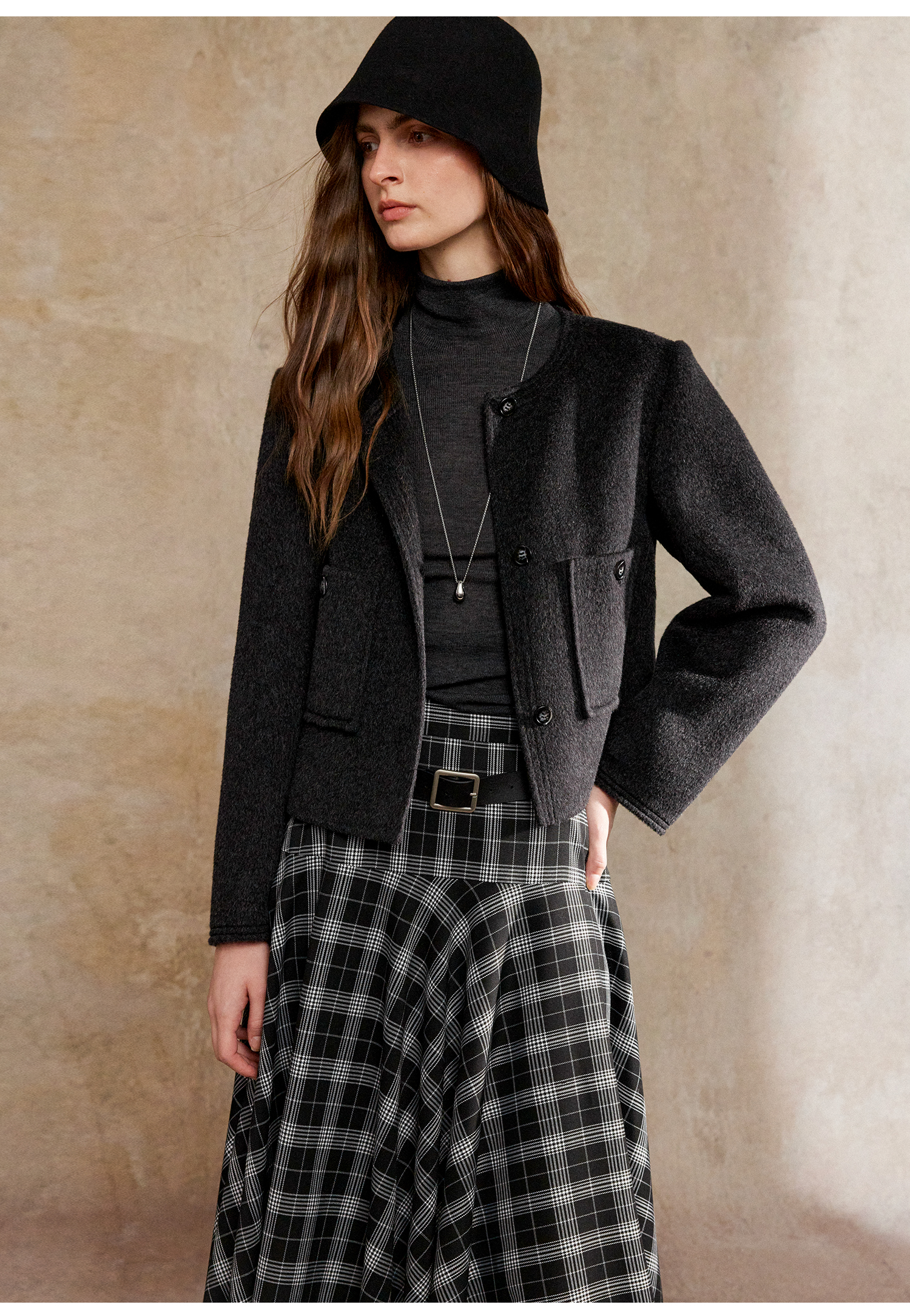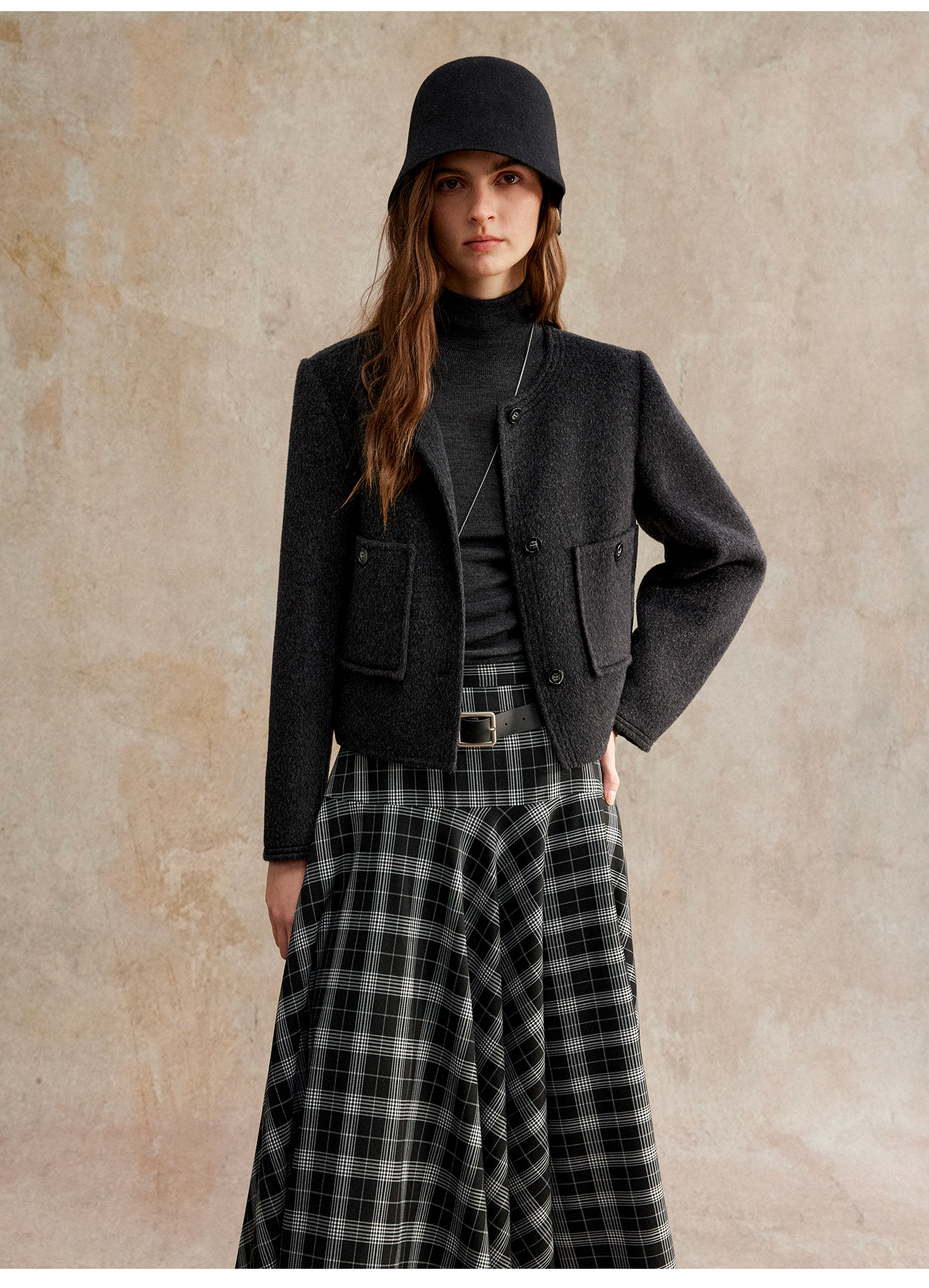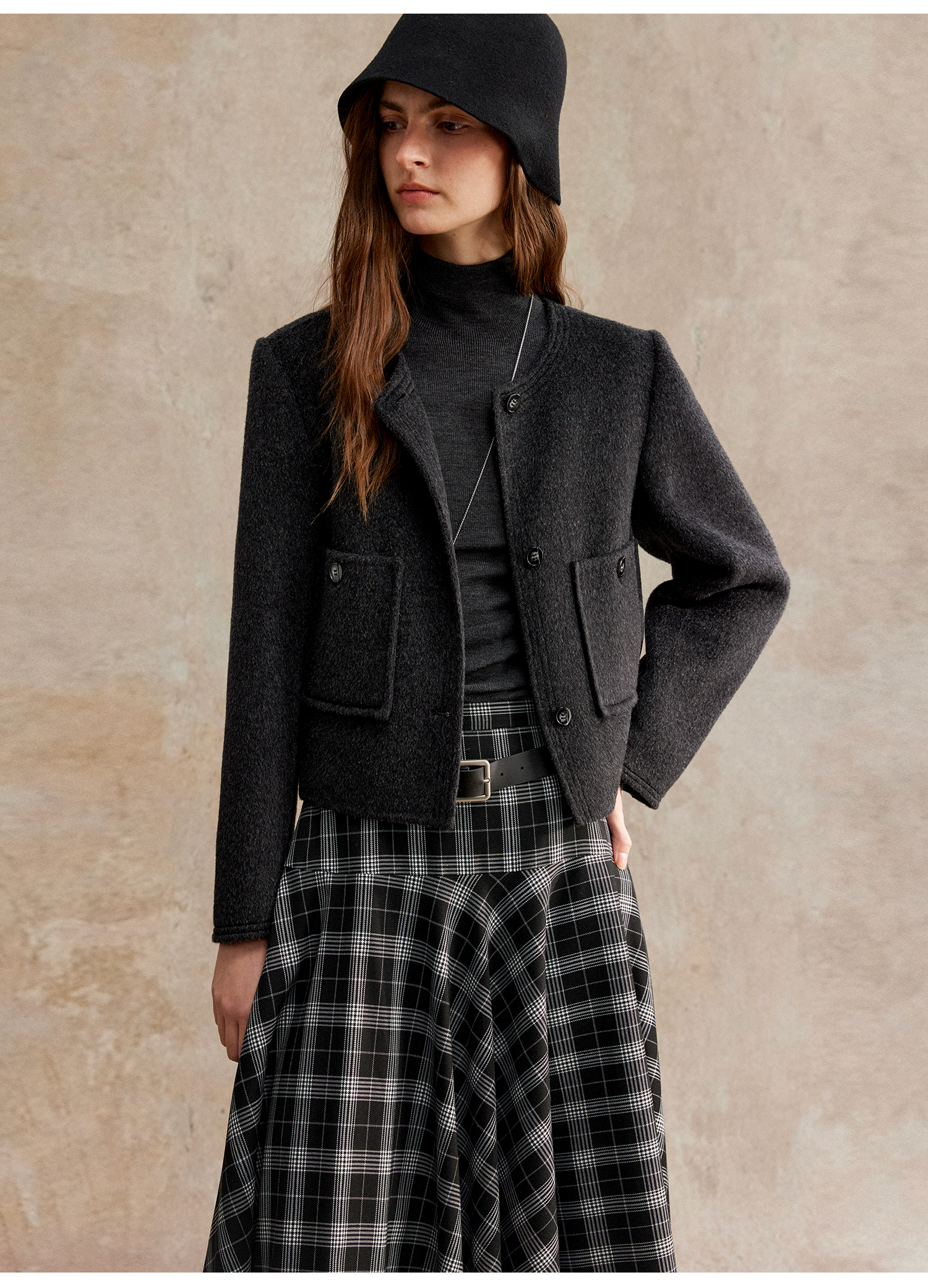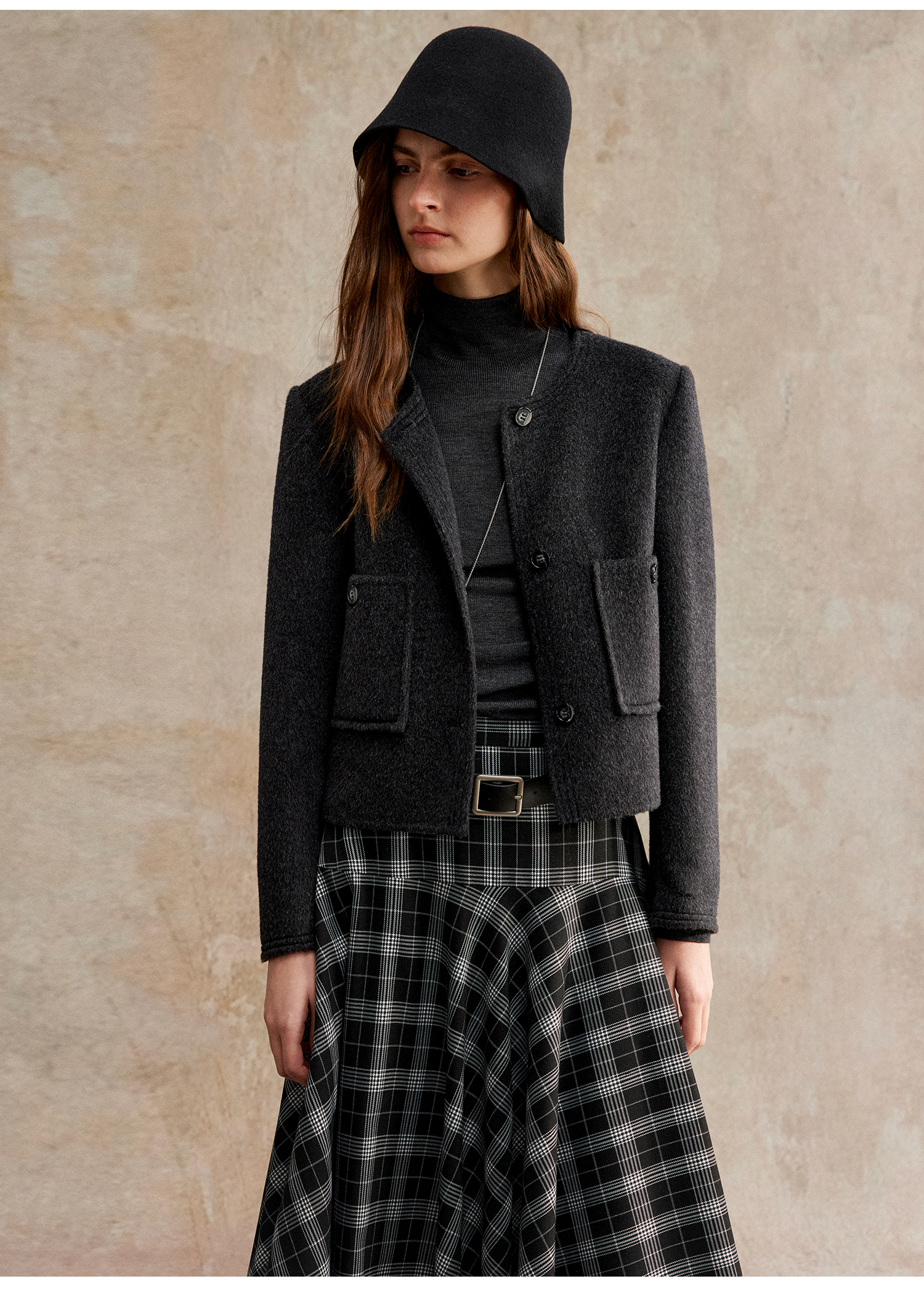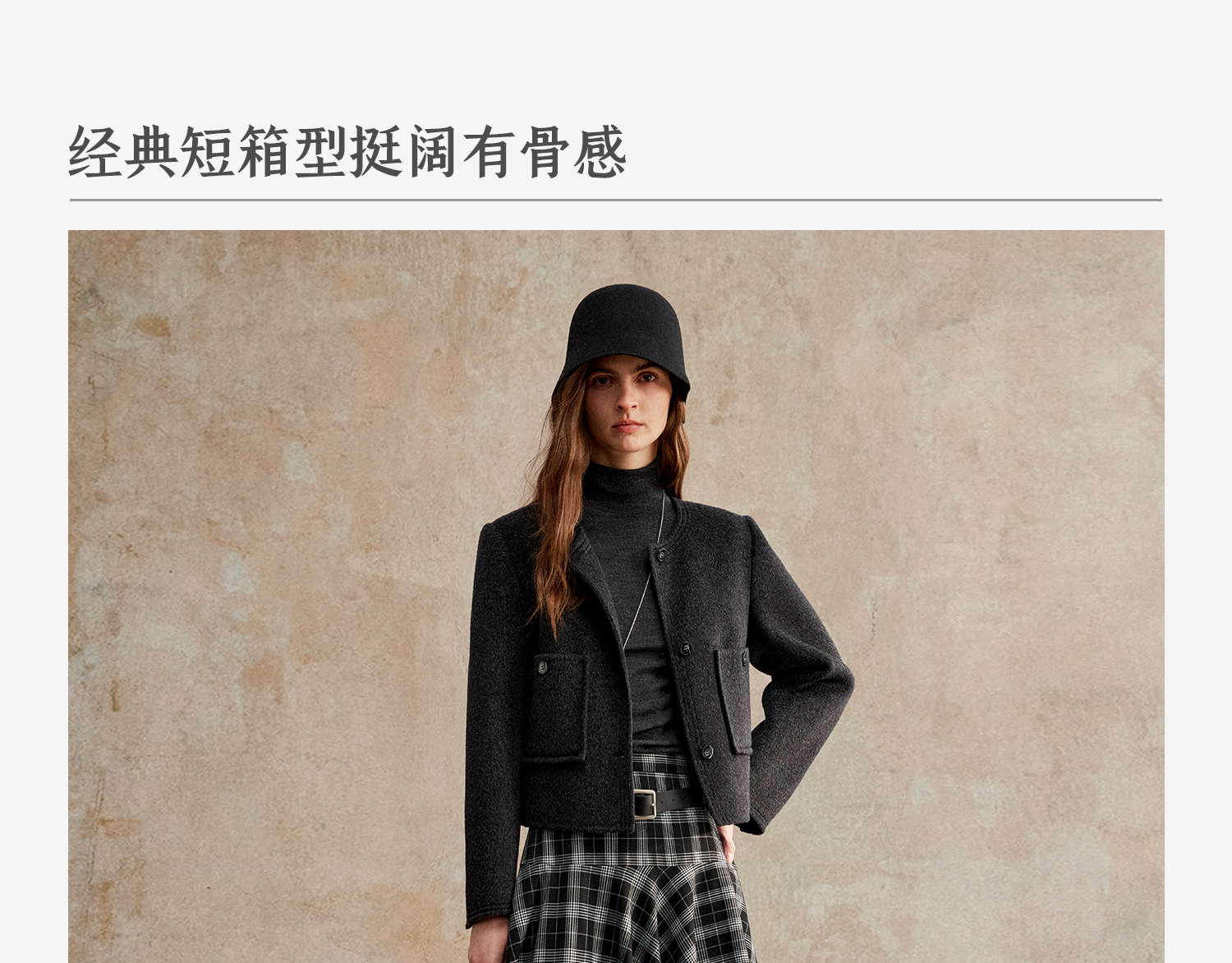 C+IMPRESS/西嘉美利奴羊毛 经典箱型小香风短款圆领双面毛呢外套