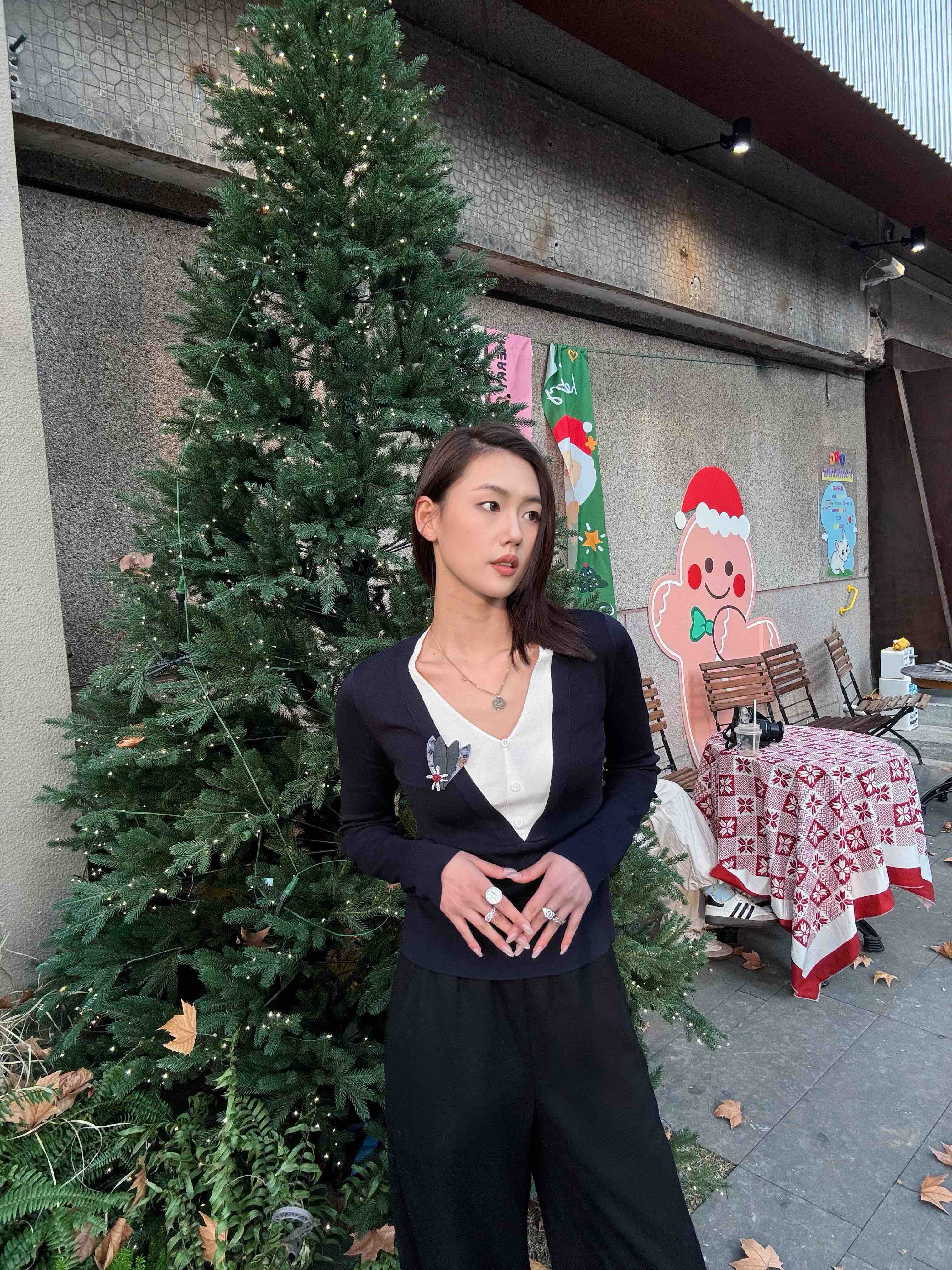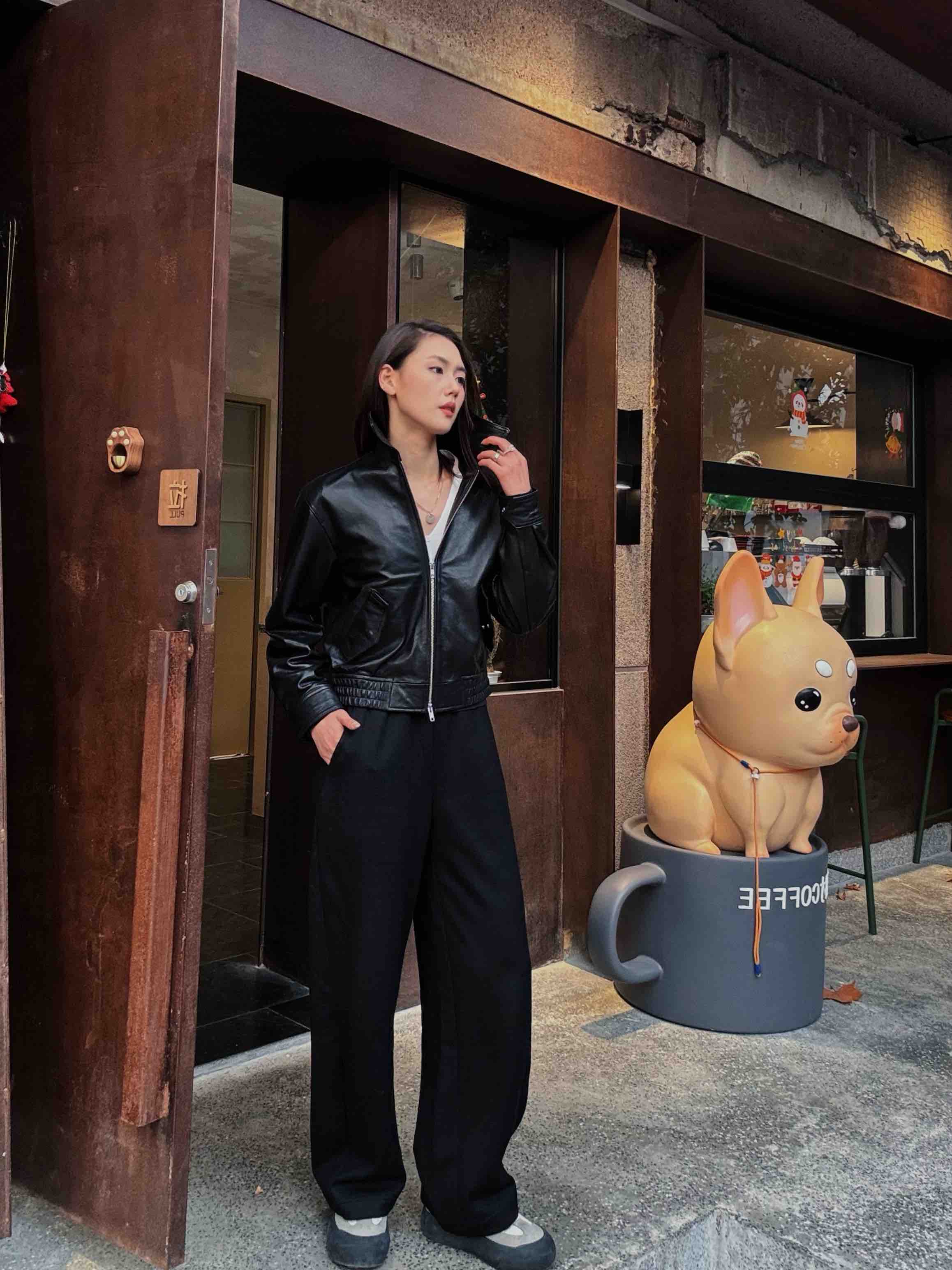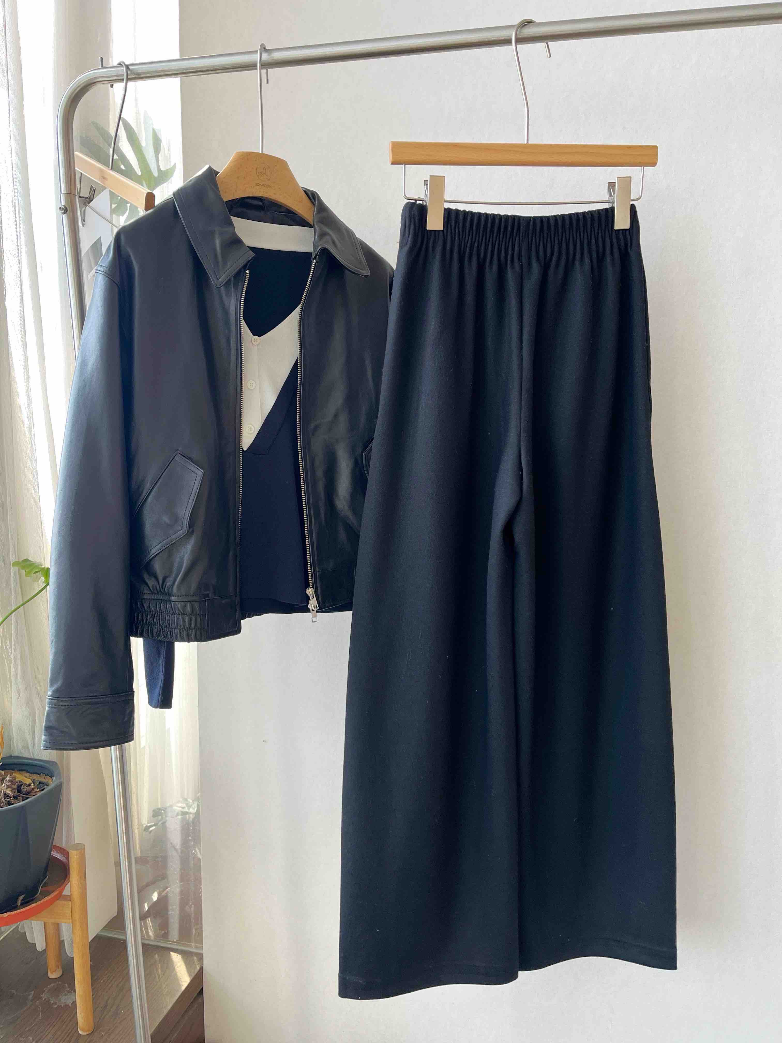 · 【显瘦王者版型】 经典黑色结合垂顺宽腿剪裁,配合毛呢肌理,视觉强力收窄身形,重塑"竹竿腿"比例。
