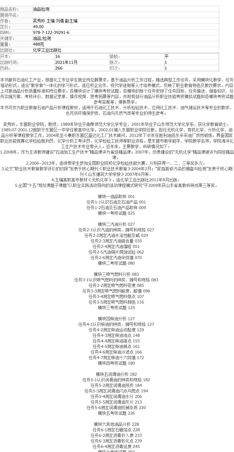 油品检测 吴秀玲 油品检测专业书籍 油品取样 汽油分 喷气燃料分析柴油分析润滑油分析其他油品分析 职业教育石油产品分析课程教材