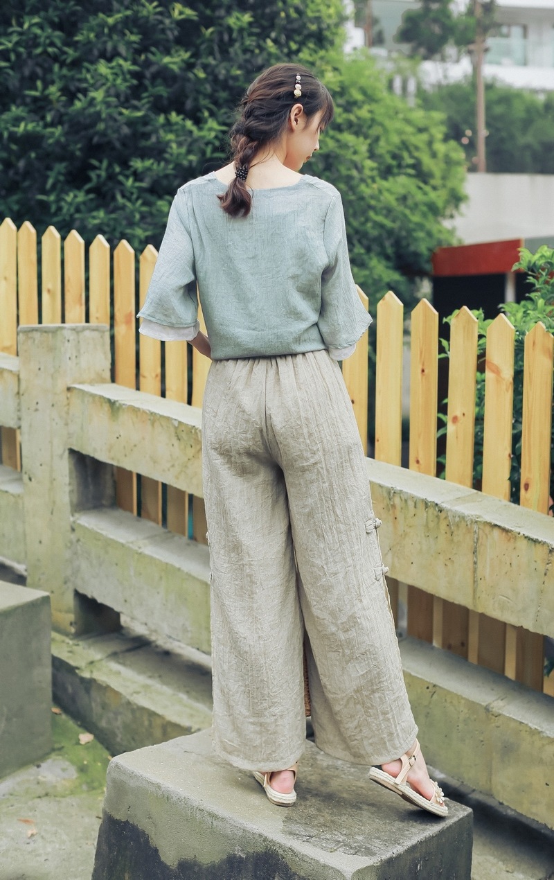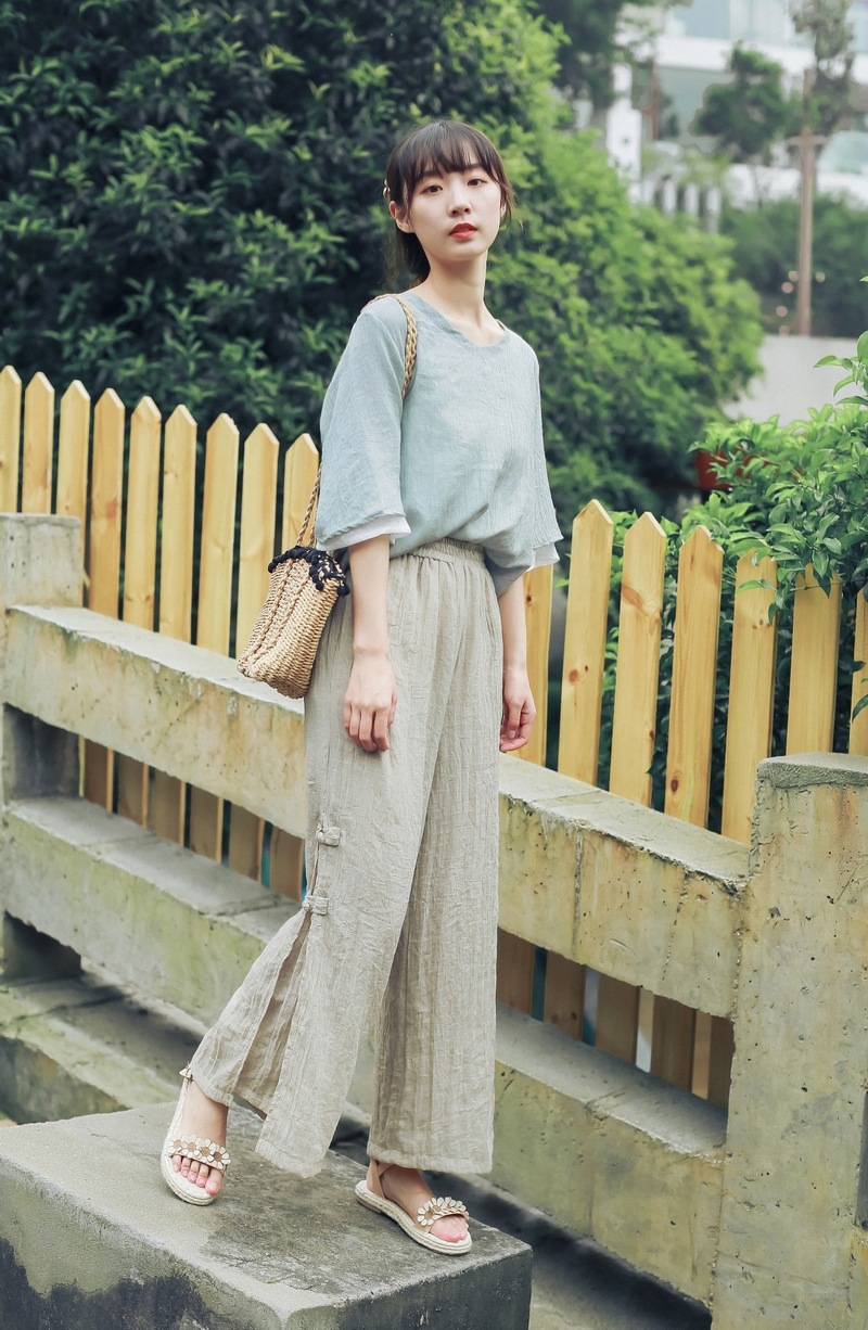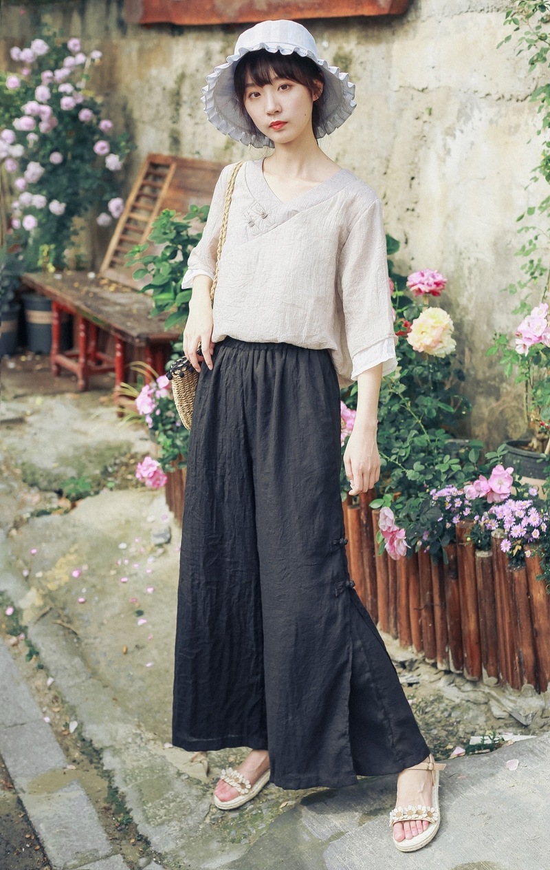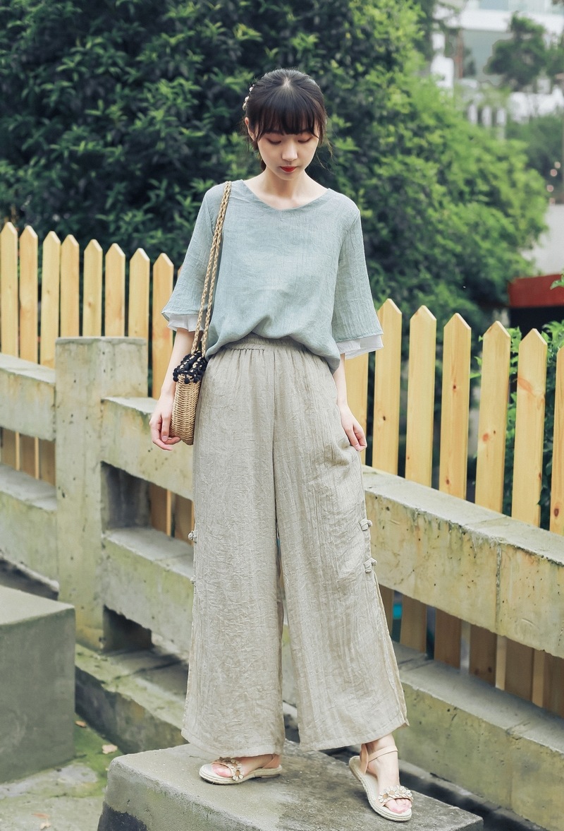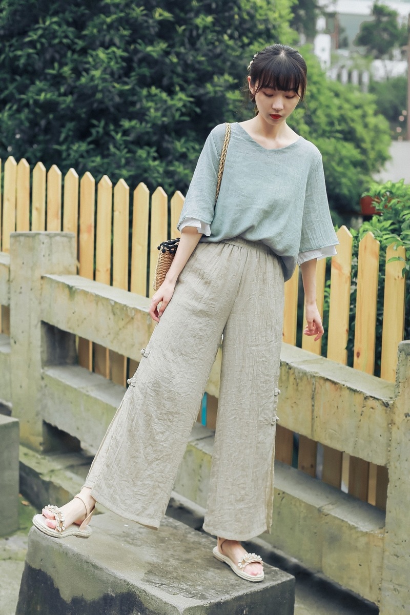 2022年新款文艺范复古双层棉麻阔腿裤女宽松直筒瑜伽休闲裤XYF-882