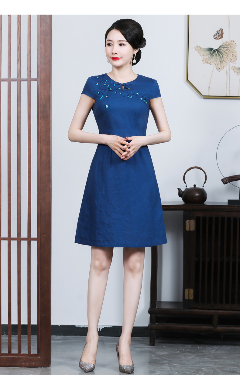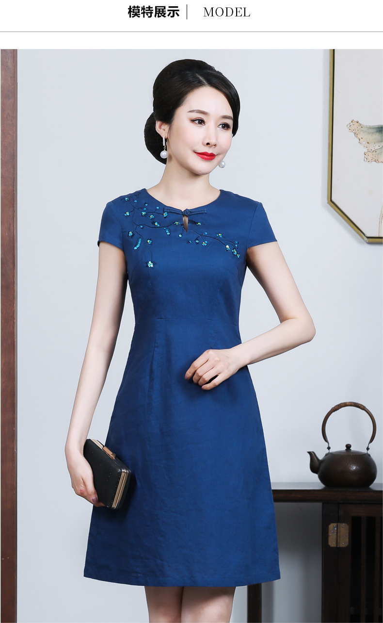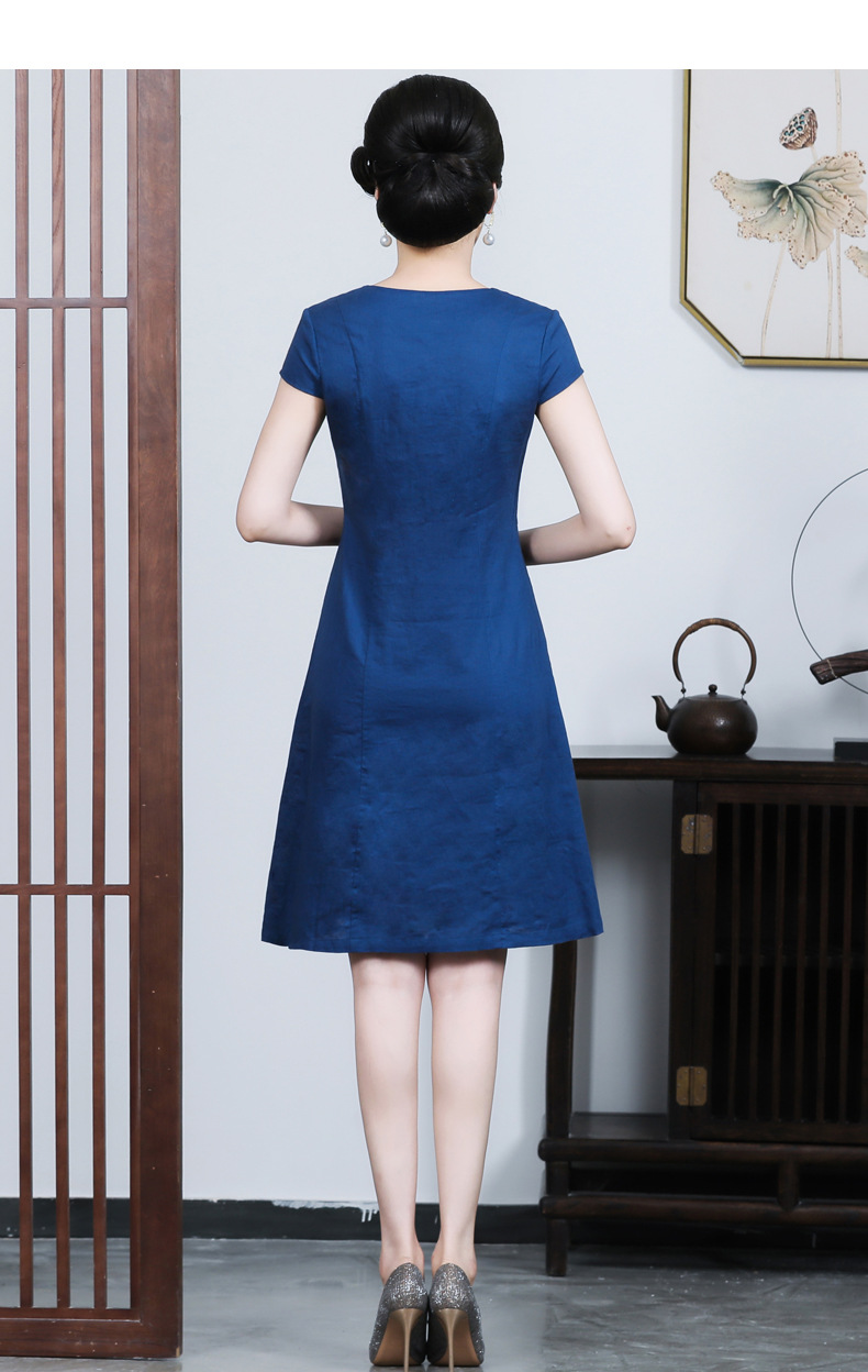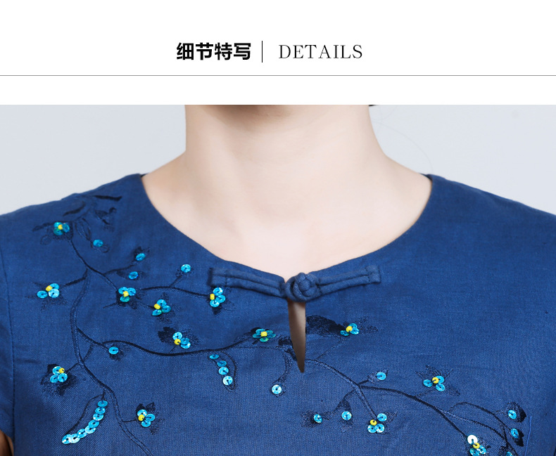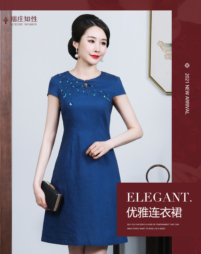 上海旗袍厂JC-JY5059连衣裙夏季短袖新款时尚气质圆领棉麻绣花裙