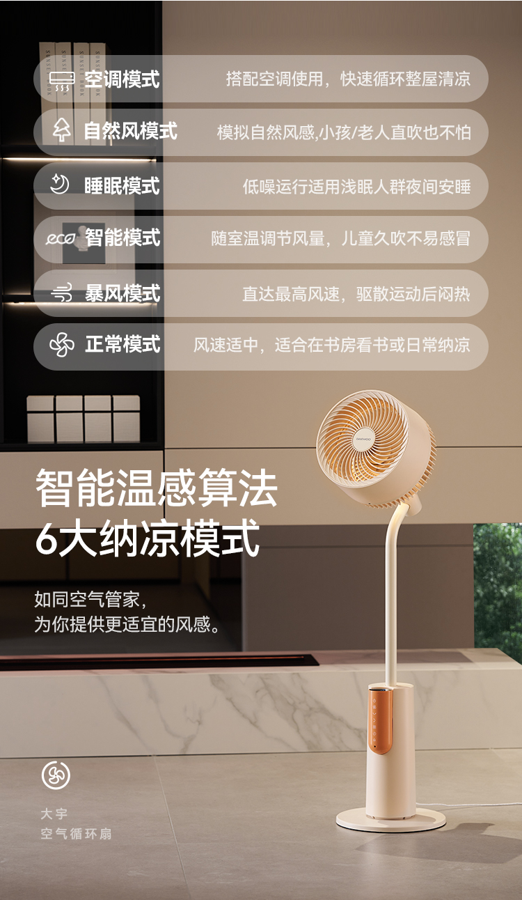 6、【6大模式】:智能感温算法,自动识别冷暖换挡,6大纳凉模式满足多场景适用;