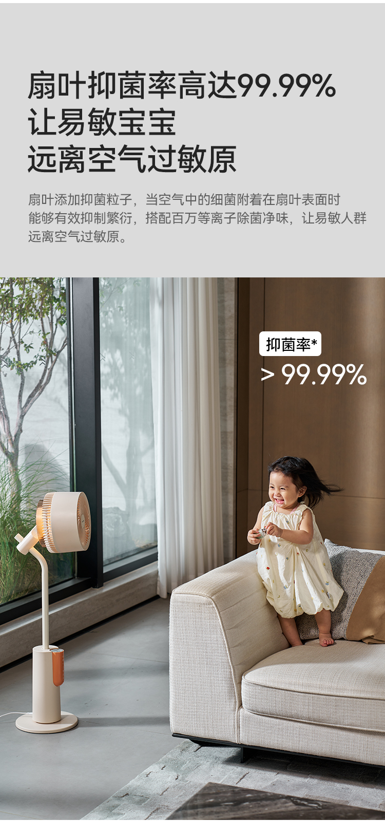4、【百万等离子】:每分钟释放百万级等离子,有效除菌净味,扇叶添加抑菌粒子,抑菌滤达到99.99%;