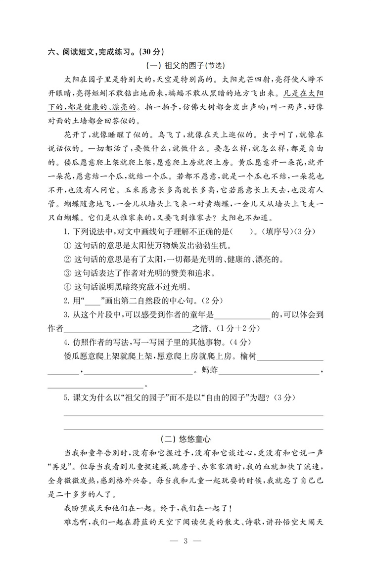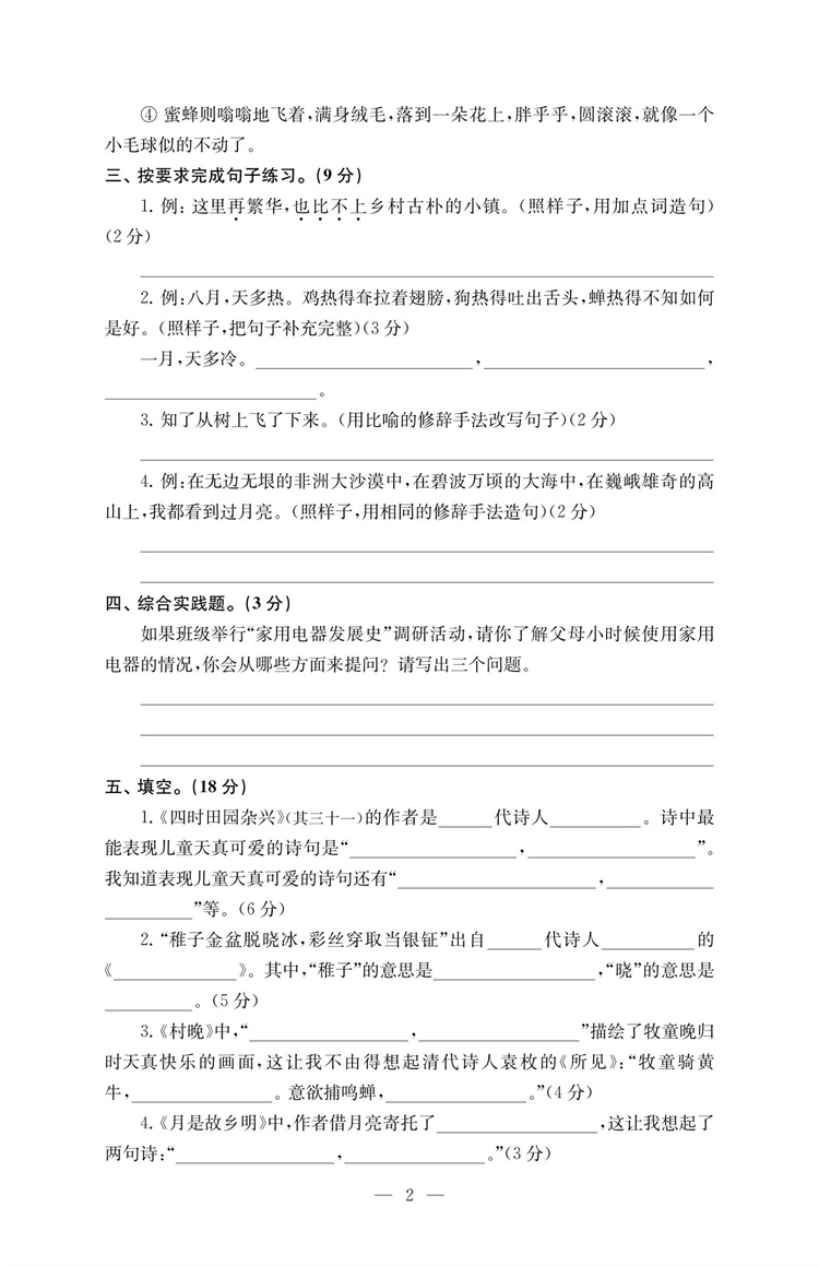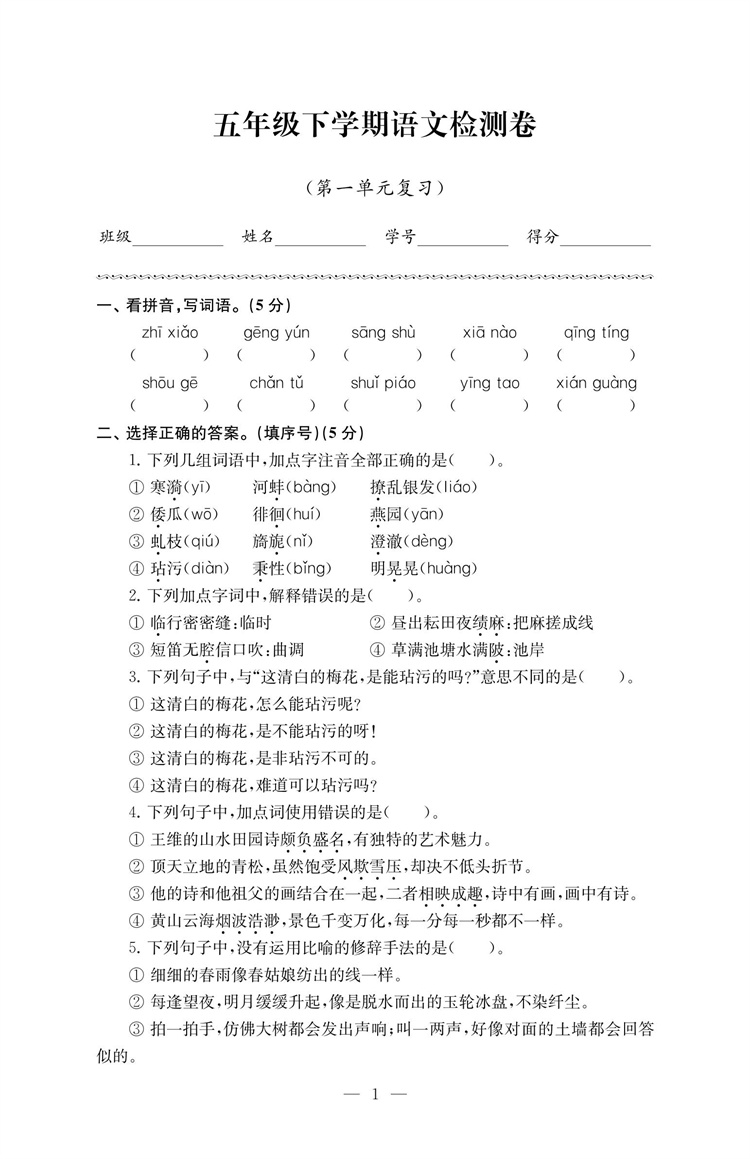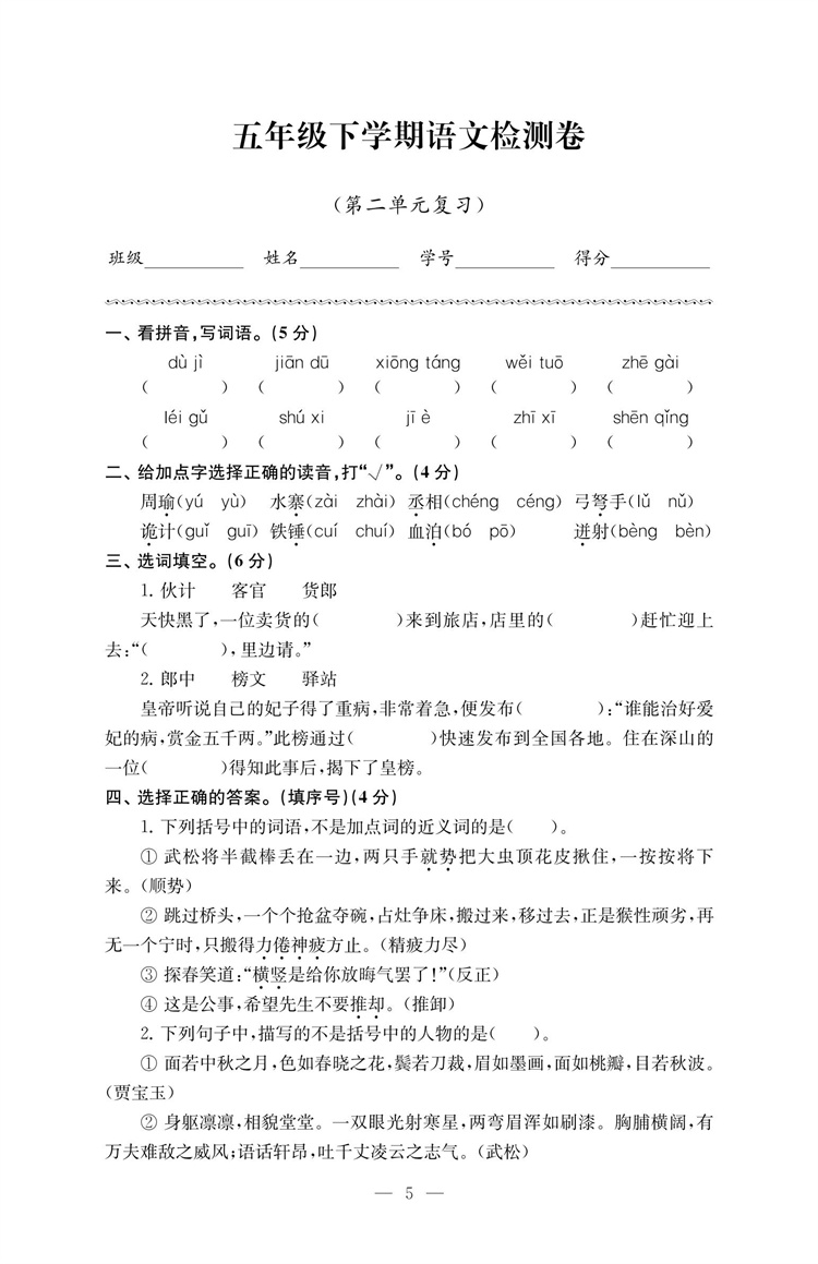 2025年春 小学语文练习与测试检测卷5下 五年级下册 部编人教版 含电子答案 5年级下册 试卷 江苏凤凰教育出版社
