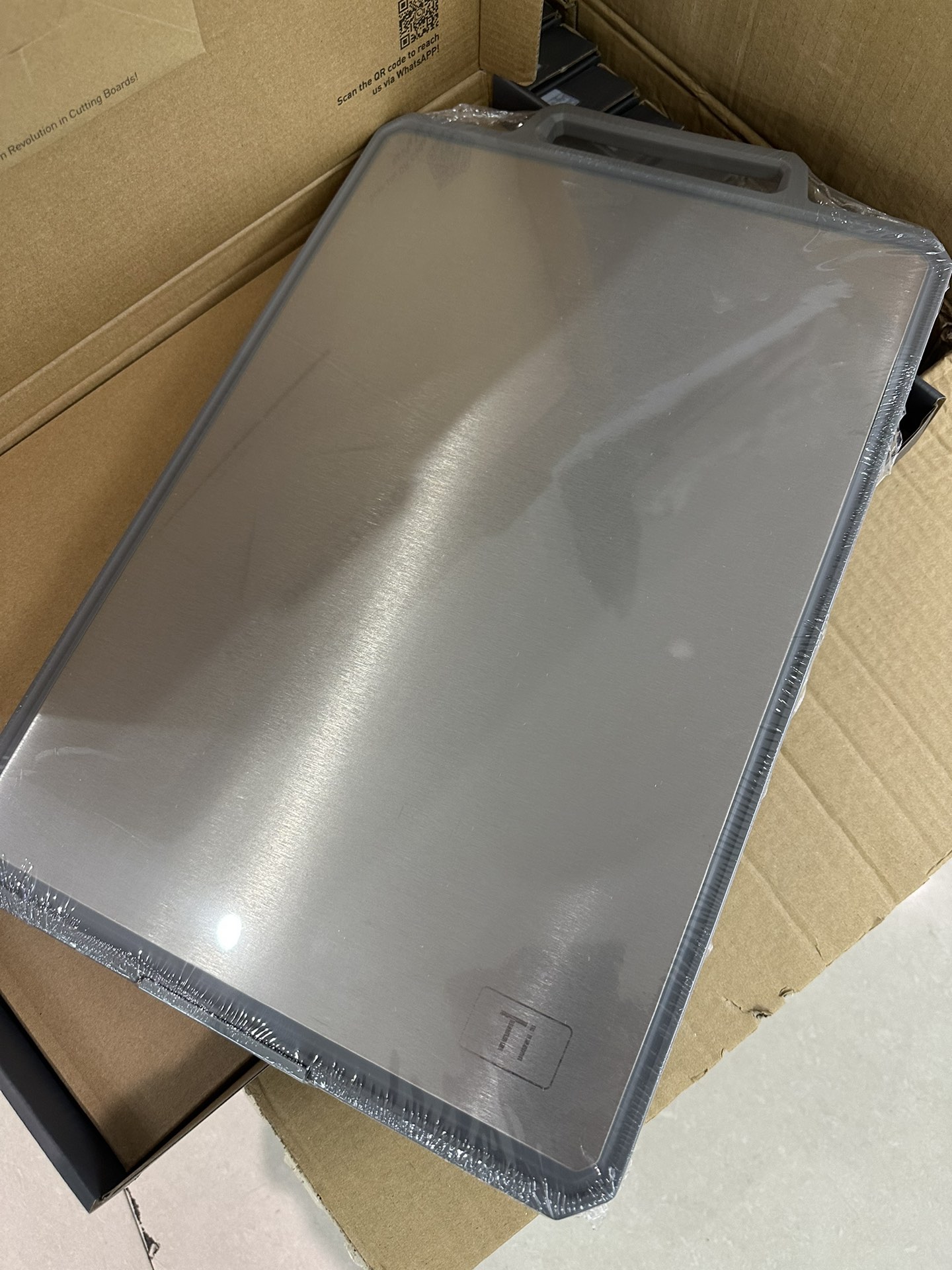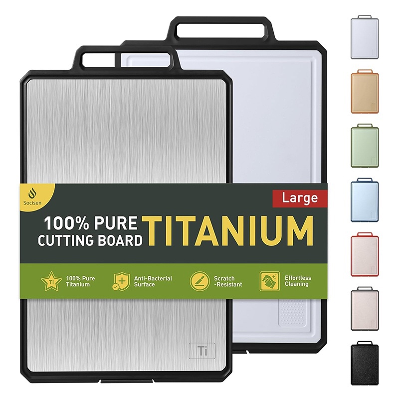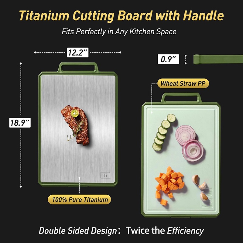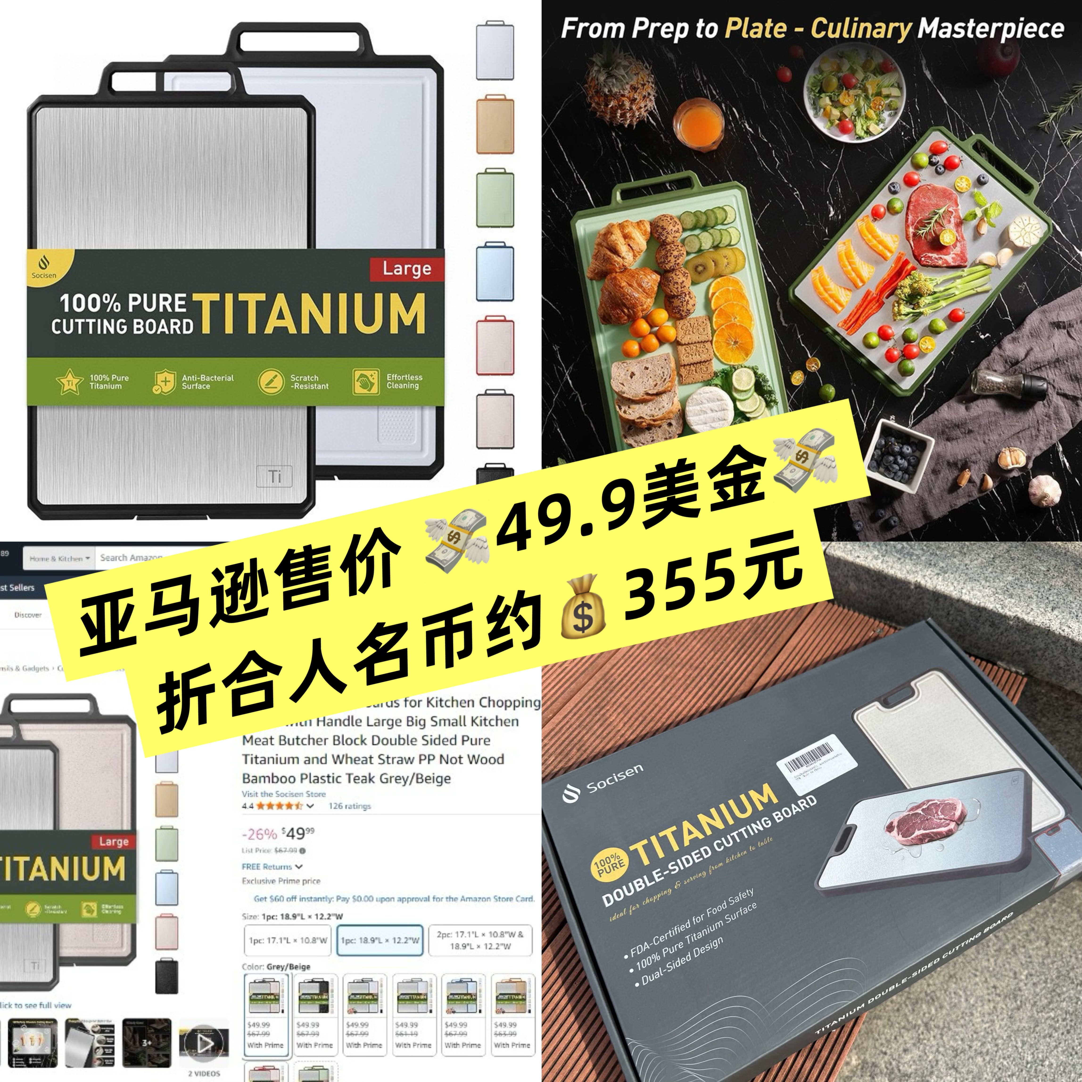 亚马逊售价49.99美金!纯钛!轻痕防滑双面材质抗菌防霉砧板(把手内嵌款大号)大号,48✖️31✖️2.2厘米,一面是pp板的一面是纯钛🉐️99%的钛!