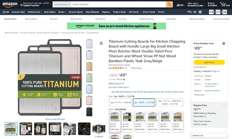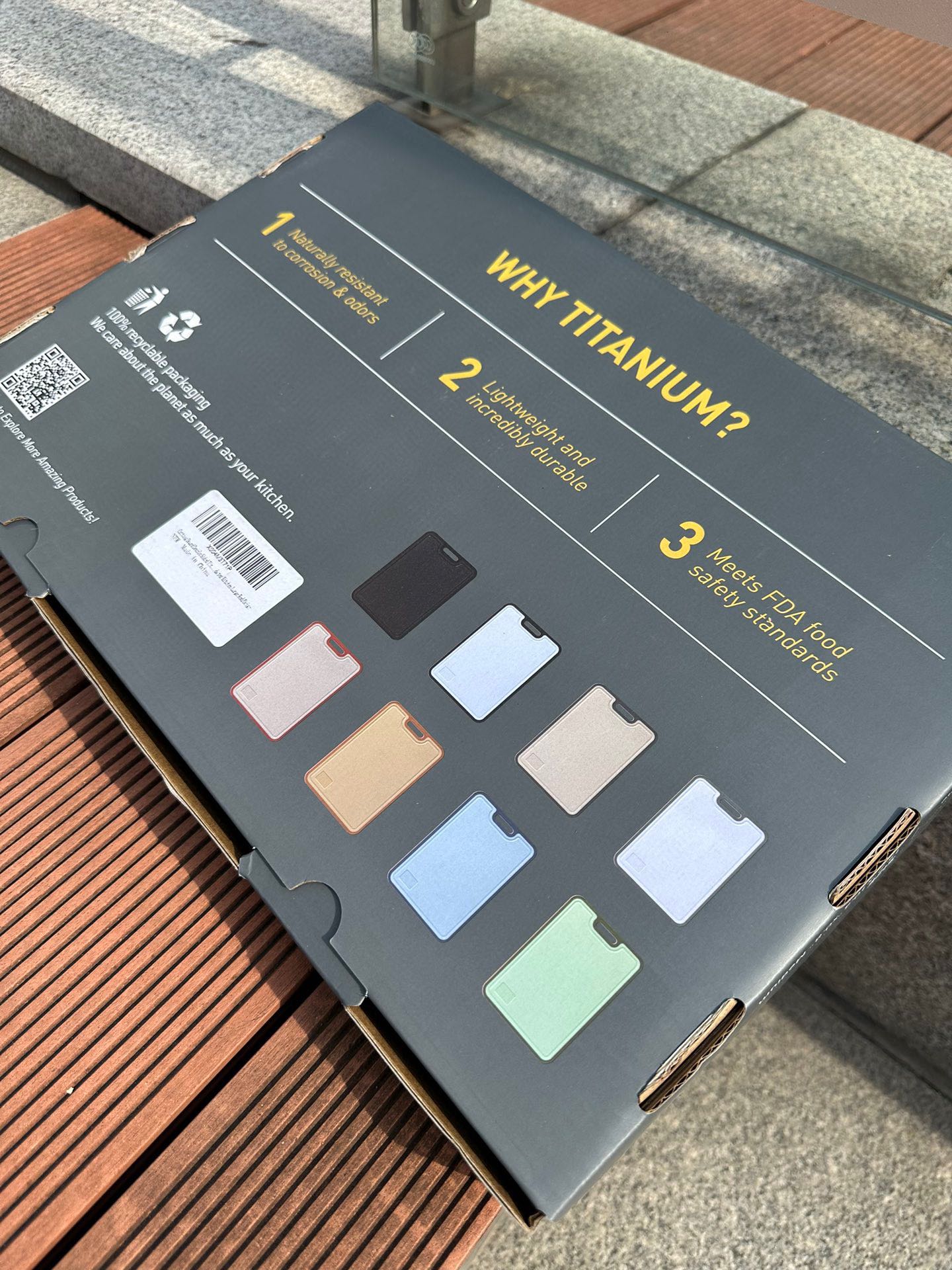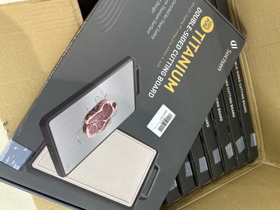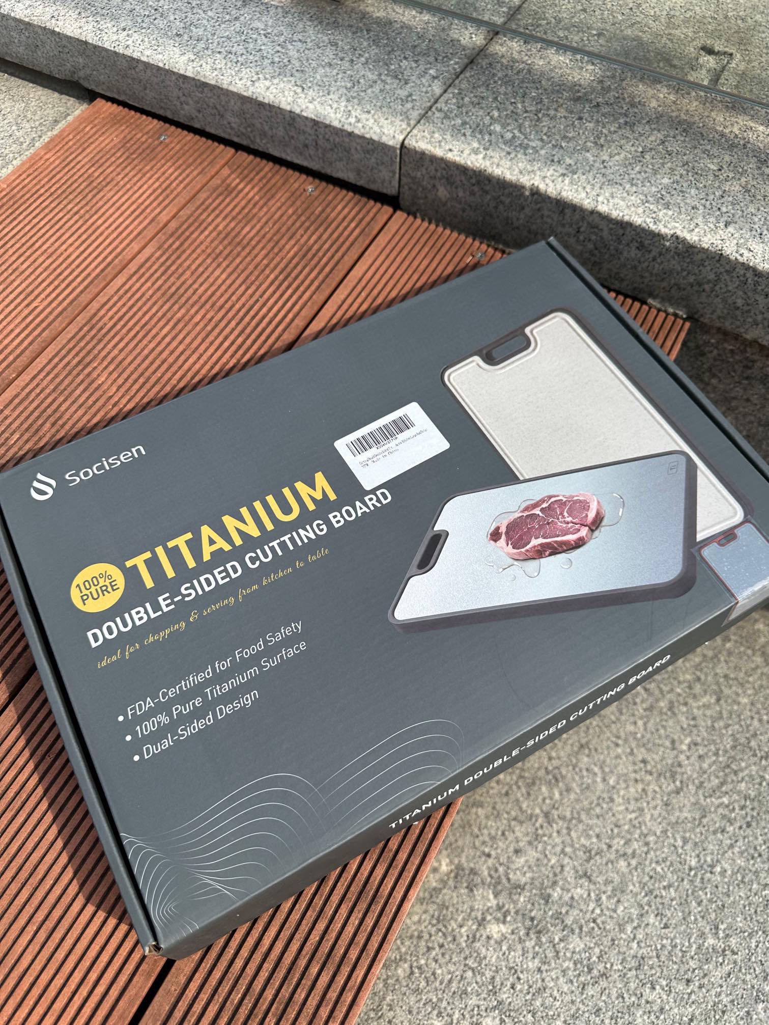 亚马逊售价49.99美金!纯钛!轻痕防滑双面材质抗菌防霉砧板(把手内嵌款大号)大号,48✖️31✖️2.2厘米,一面是pp板的一面是纯钛🉐️99%的钛!
