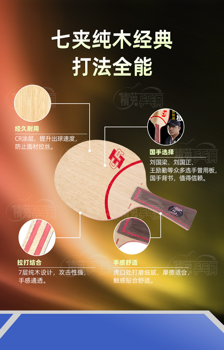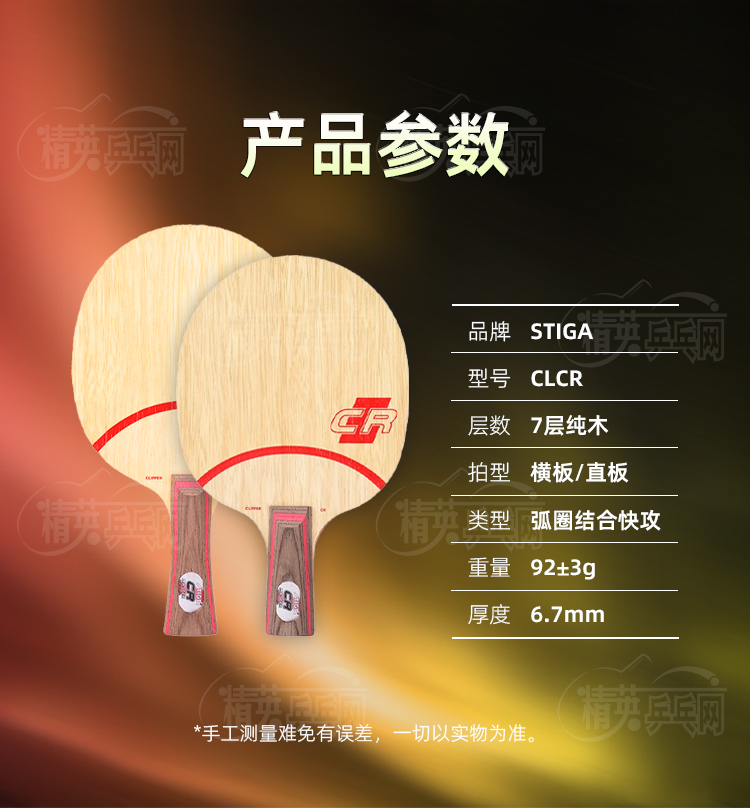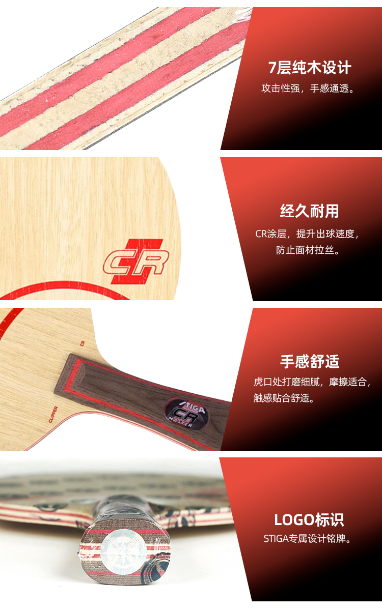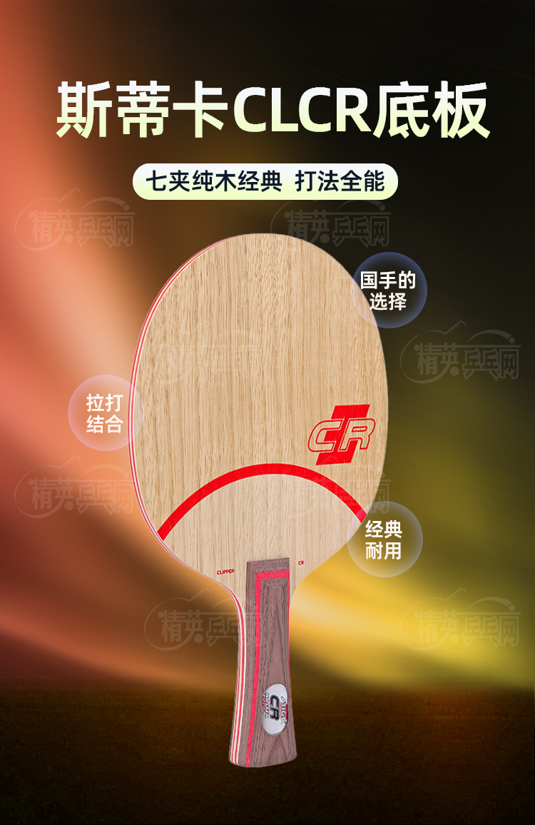 斯帝卡CLCR底板是七层纯木结构,采用CR技术提升出球速度,适合中近台快攻结合弧圈打法,具备高控制性和均衡性能。