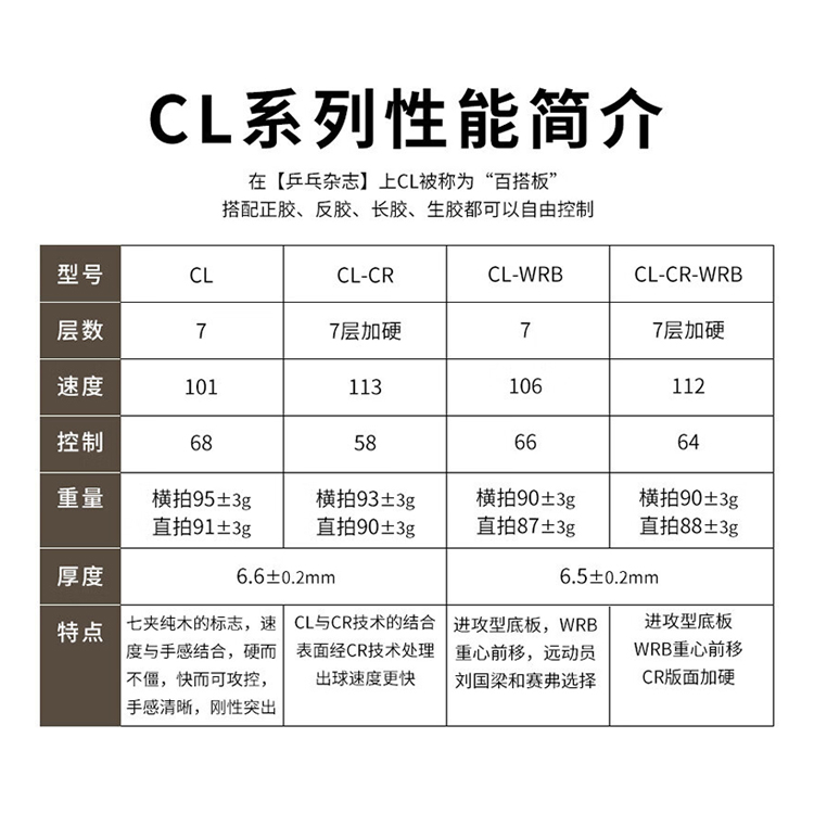职业选手背书:刘国梁、王励勤等曾使用CL系列取得佳绩,平野美宇2016年世界杯夺冠后带动CLCR销量飙升。