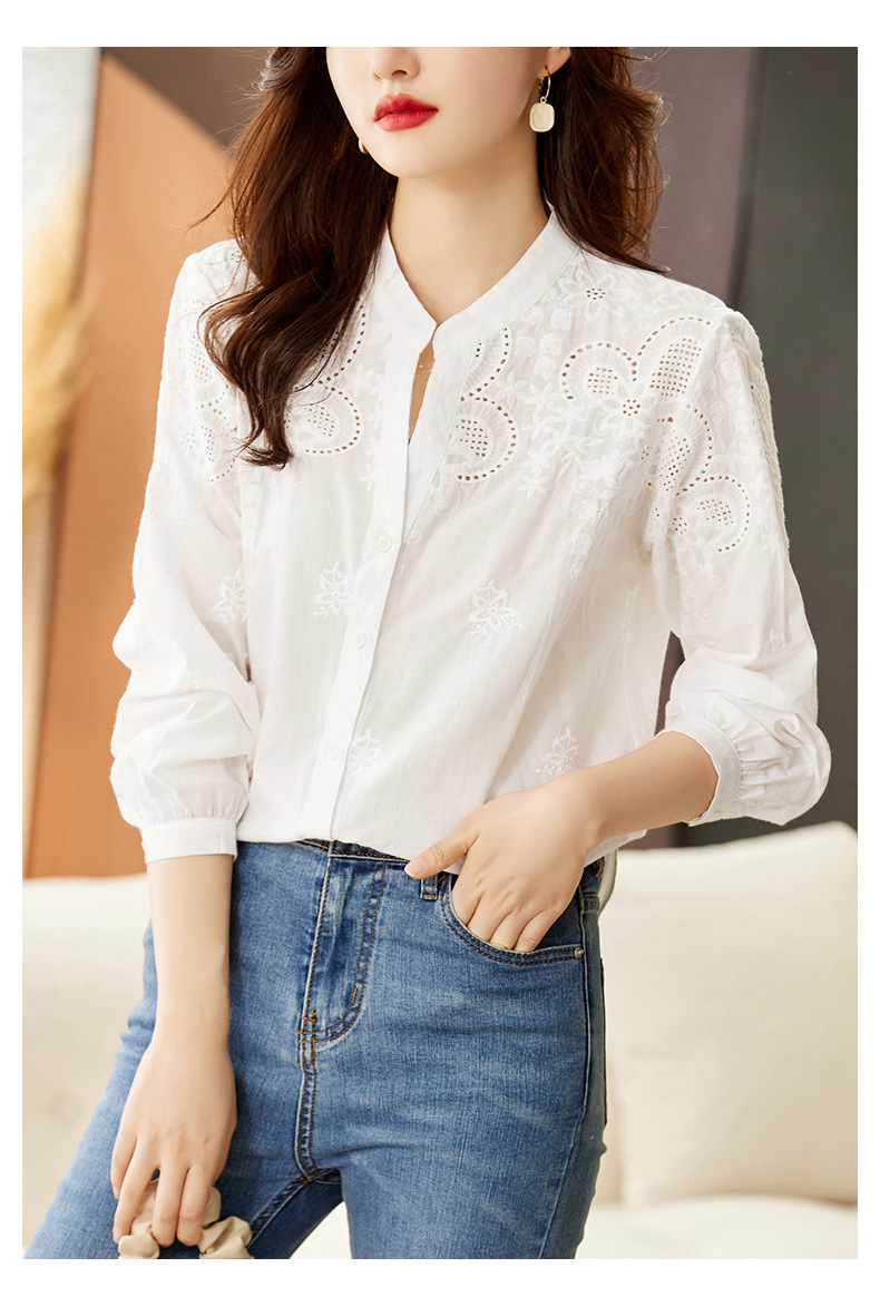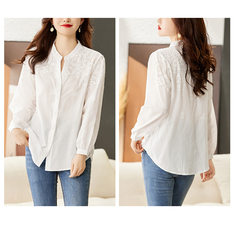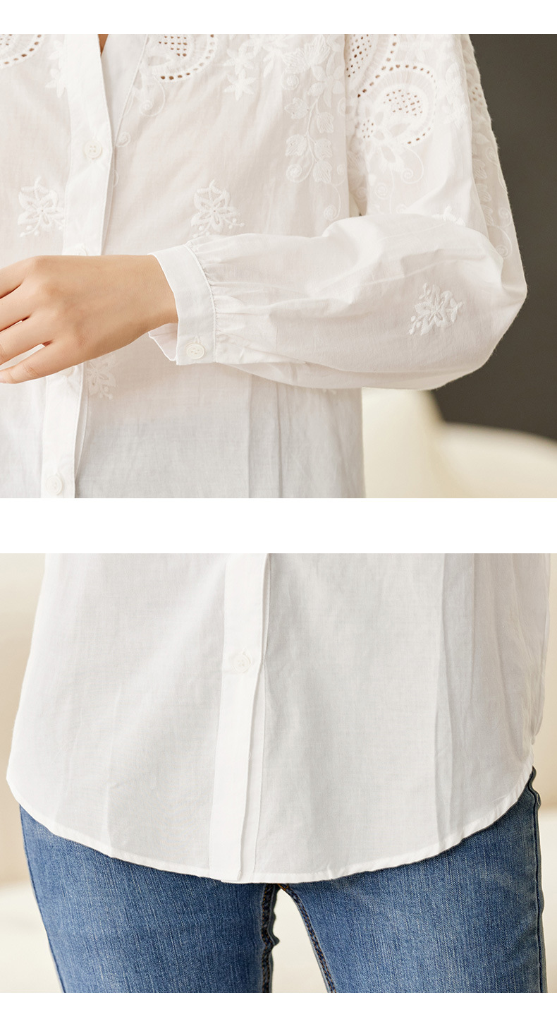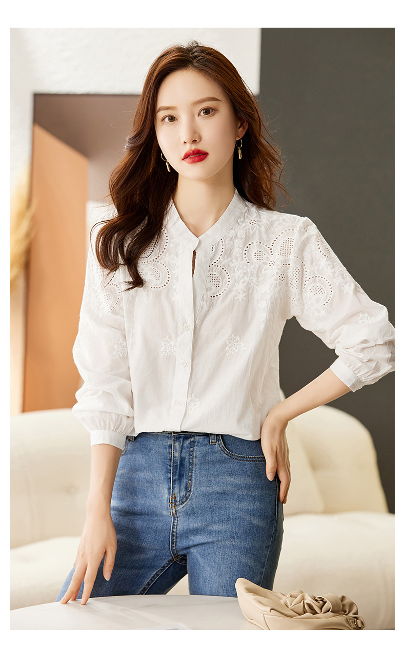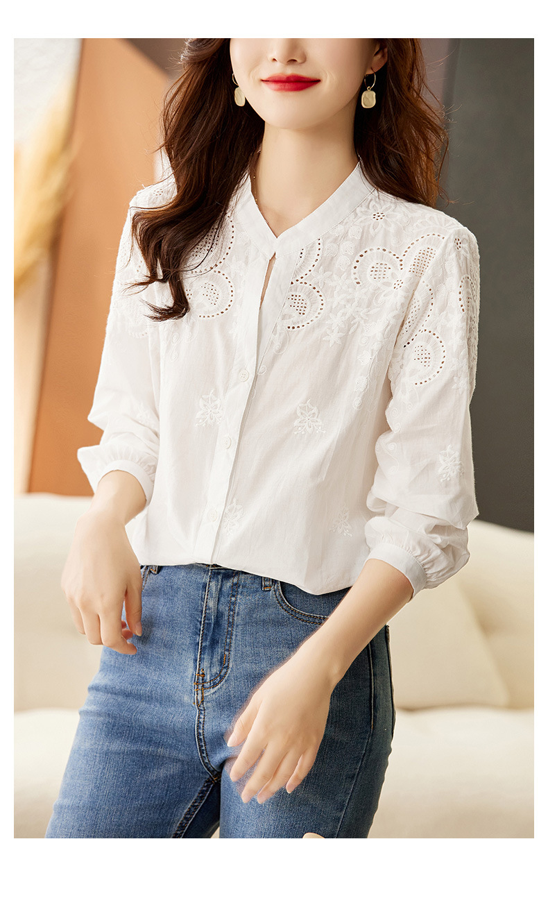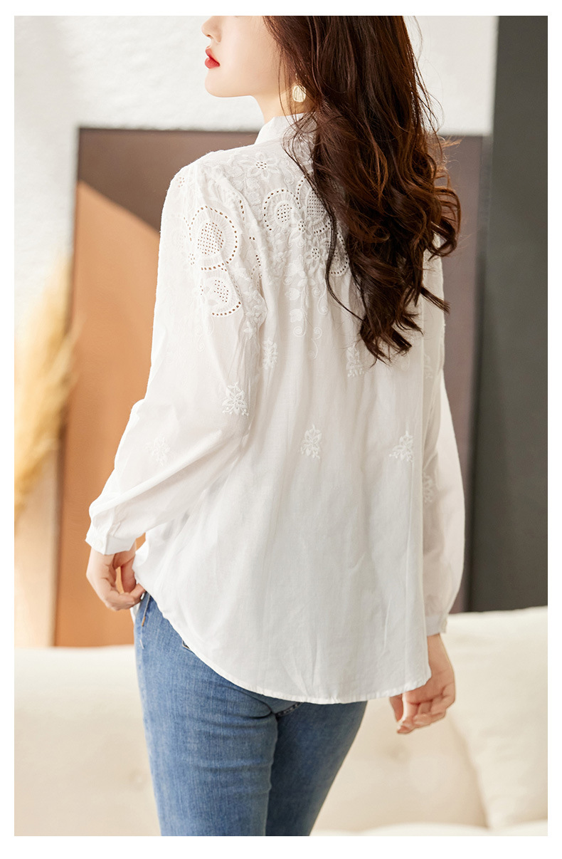 TZW-厂家直销刺绣花镂空白衬衫女长袖2023春新款v领别致上衣衬衣