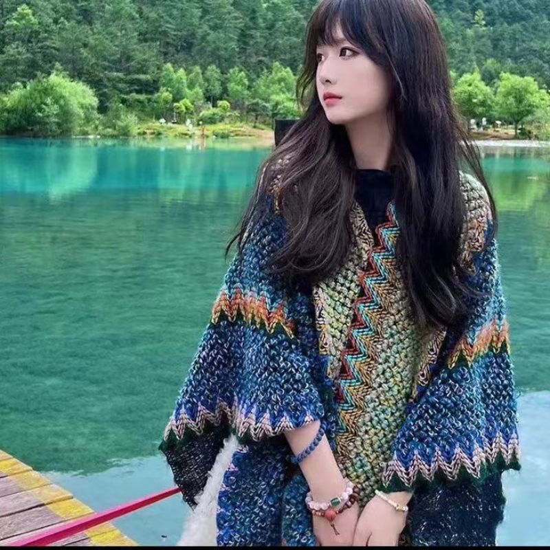 PG-KG001 云南丽江旅游外搭针织披肩民族风复古斗篷披风流苏围巾度假穿搭