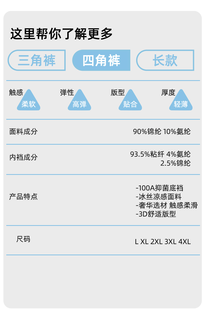 【善熙珍--男士高弹冰丝四角裤】面料亲肤柔软 吸湿透气丝滑超薄 U型立体囊袋设计 不夹臀不勒腿不闷热
