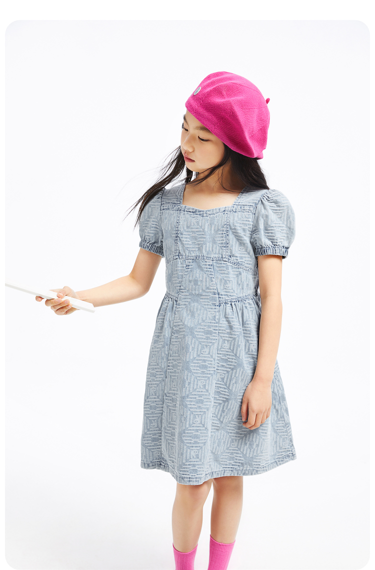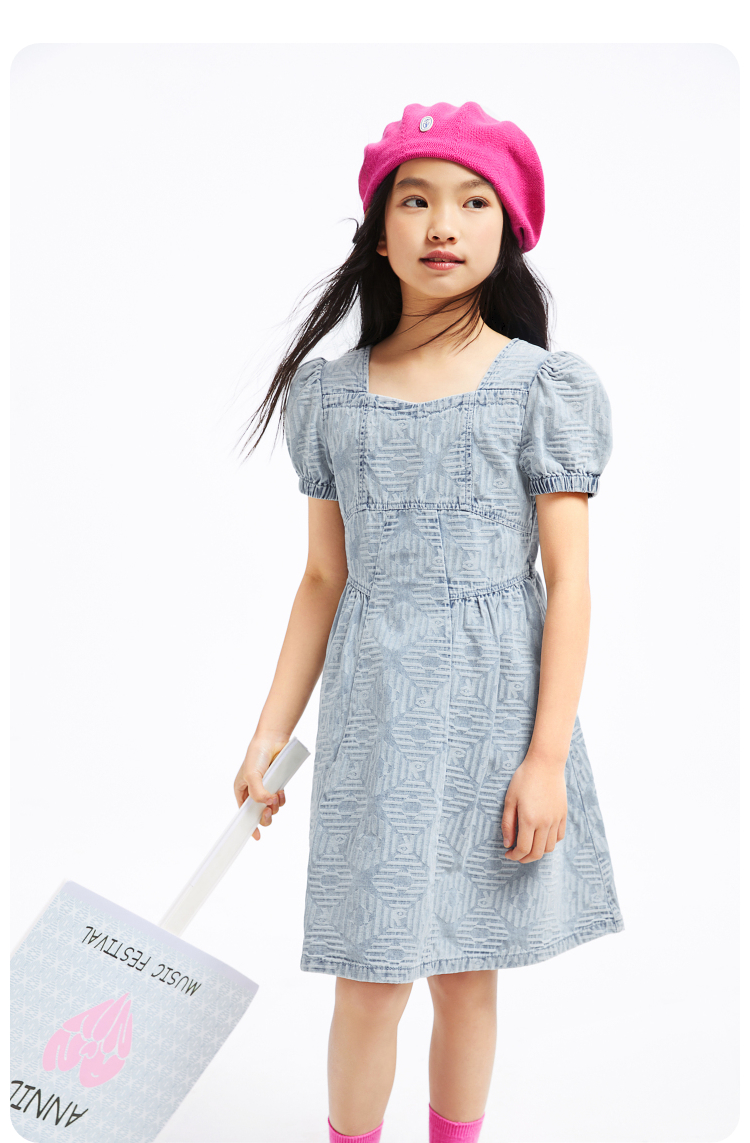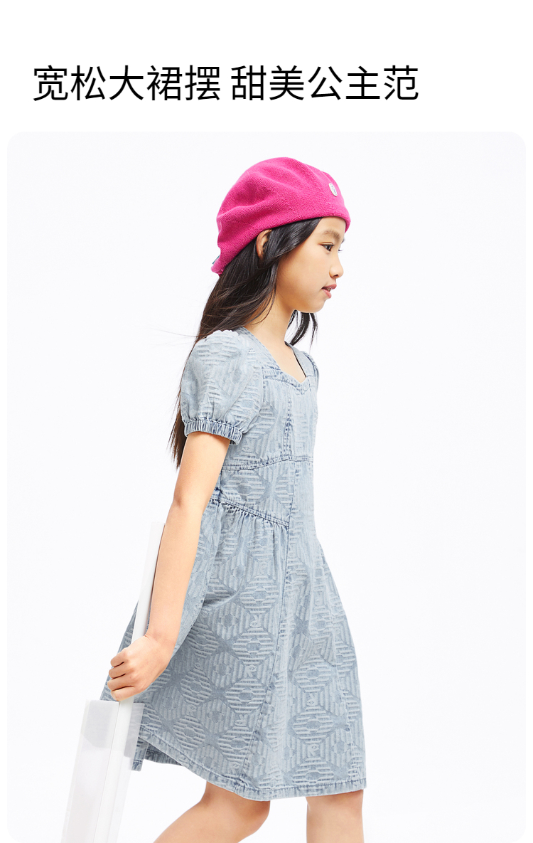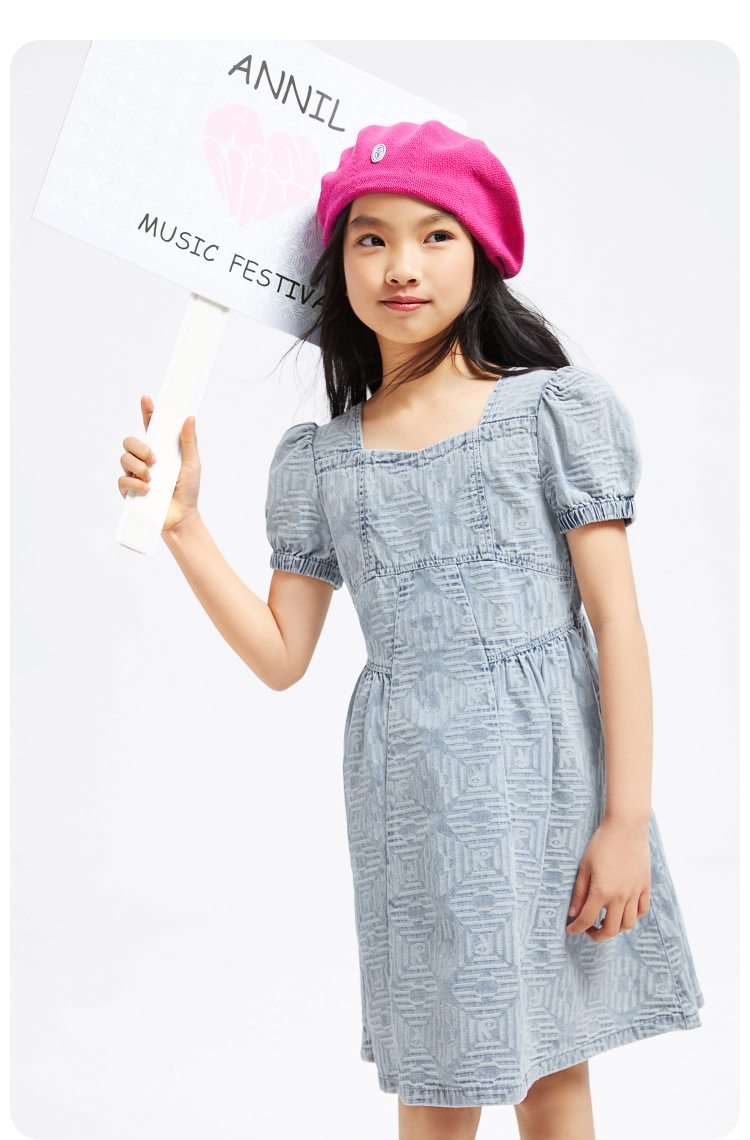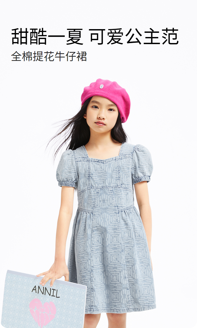 女童牛仔连衣裙新款夏纯棉简约纯色提花公主裙子安奈儿童装EG423079