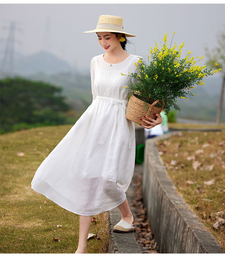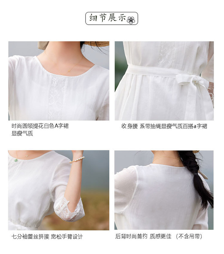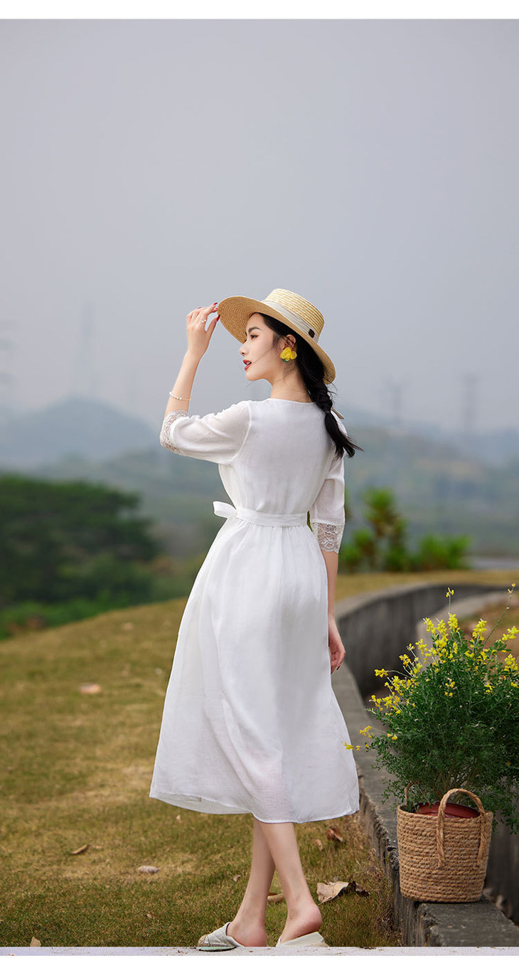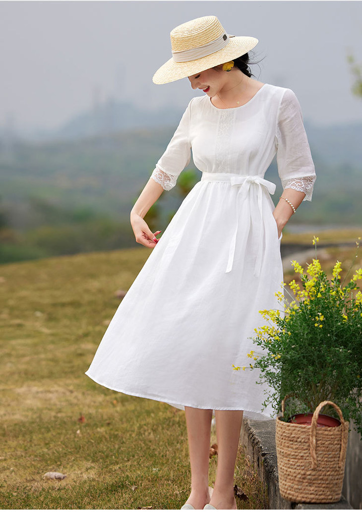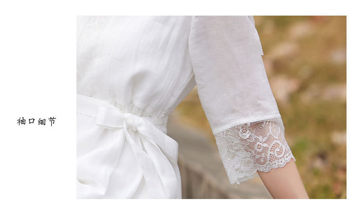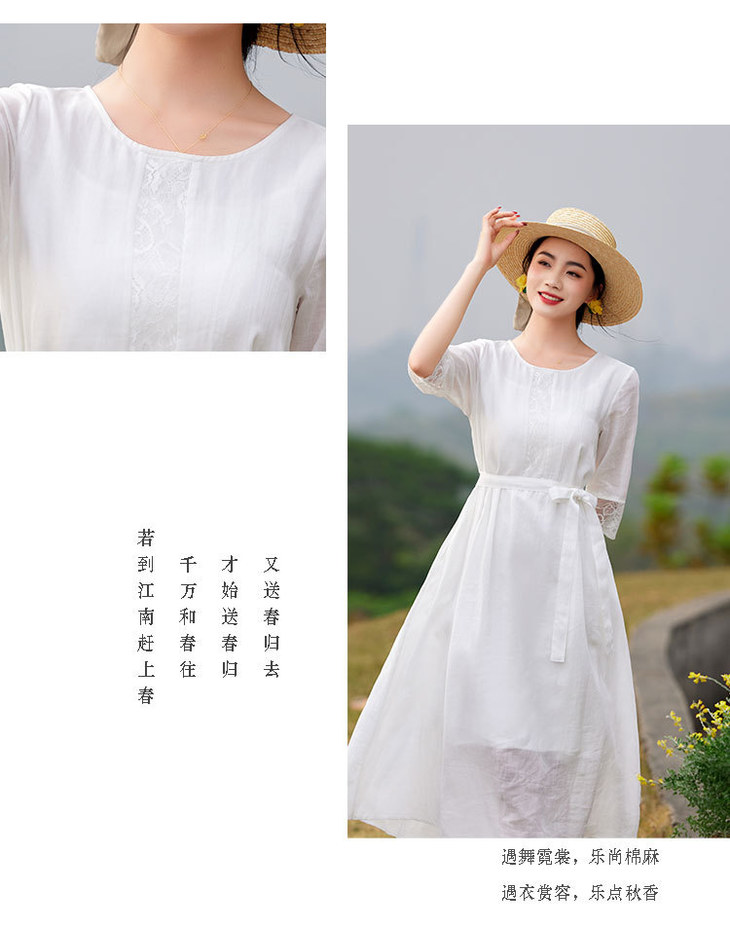 圆领七分袖系带,蕾丝拼接苎麻连衣裙TT96125