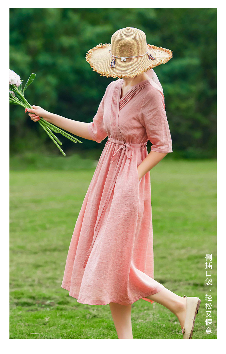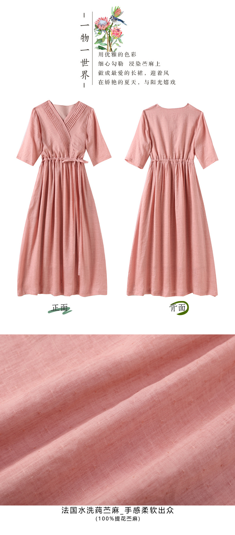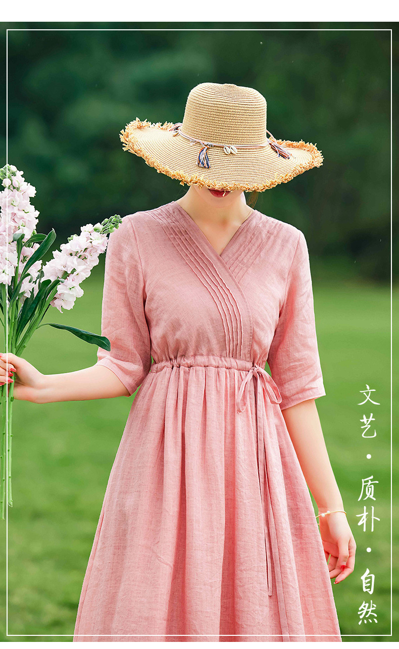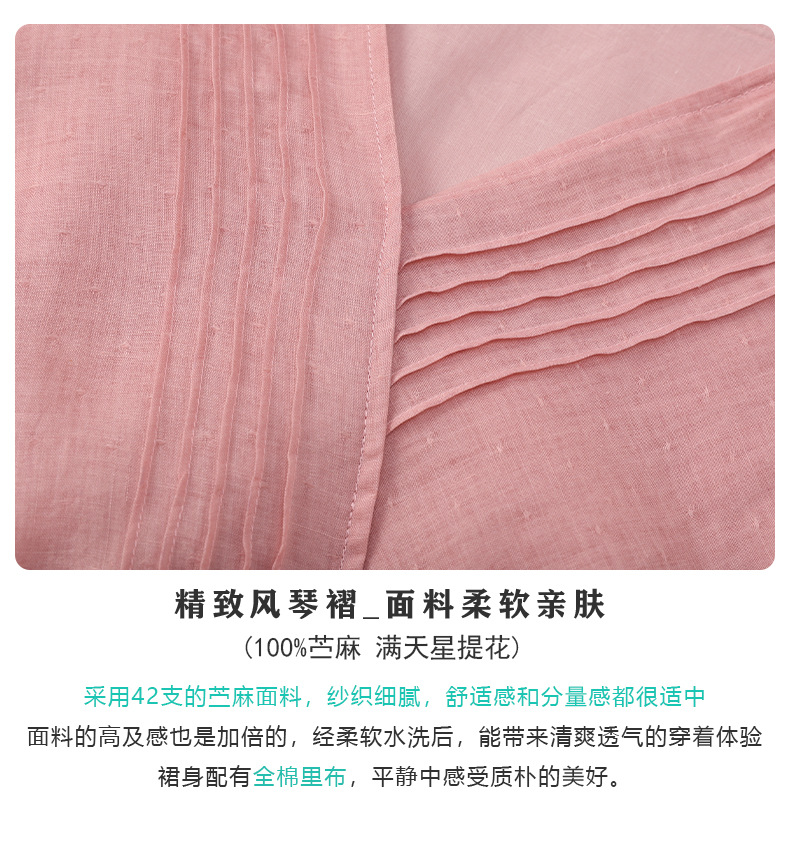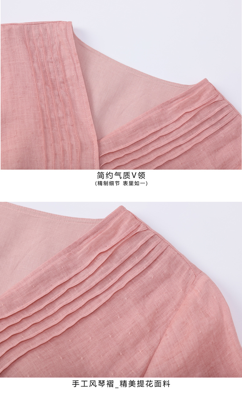 HM-C016春夏新款苎麻提花连衣裙文艺范气质V领风琴褶纯色大摆裙