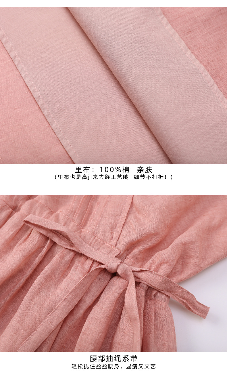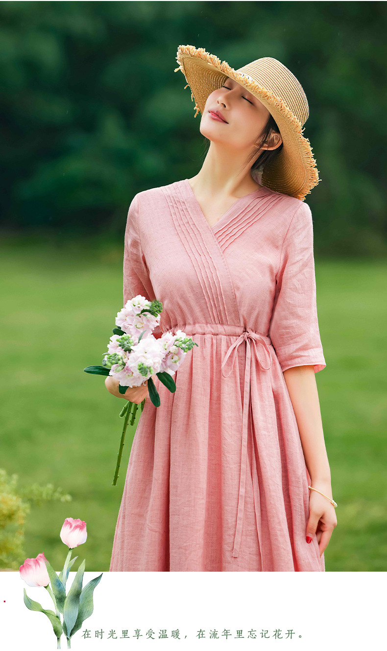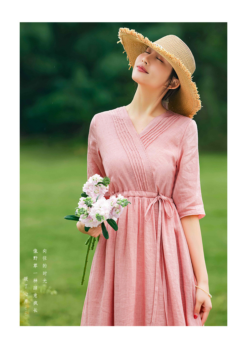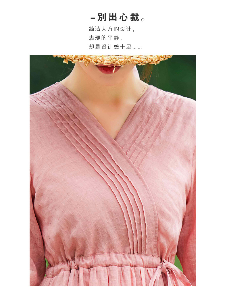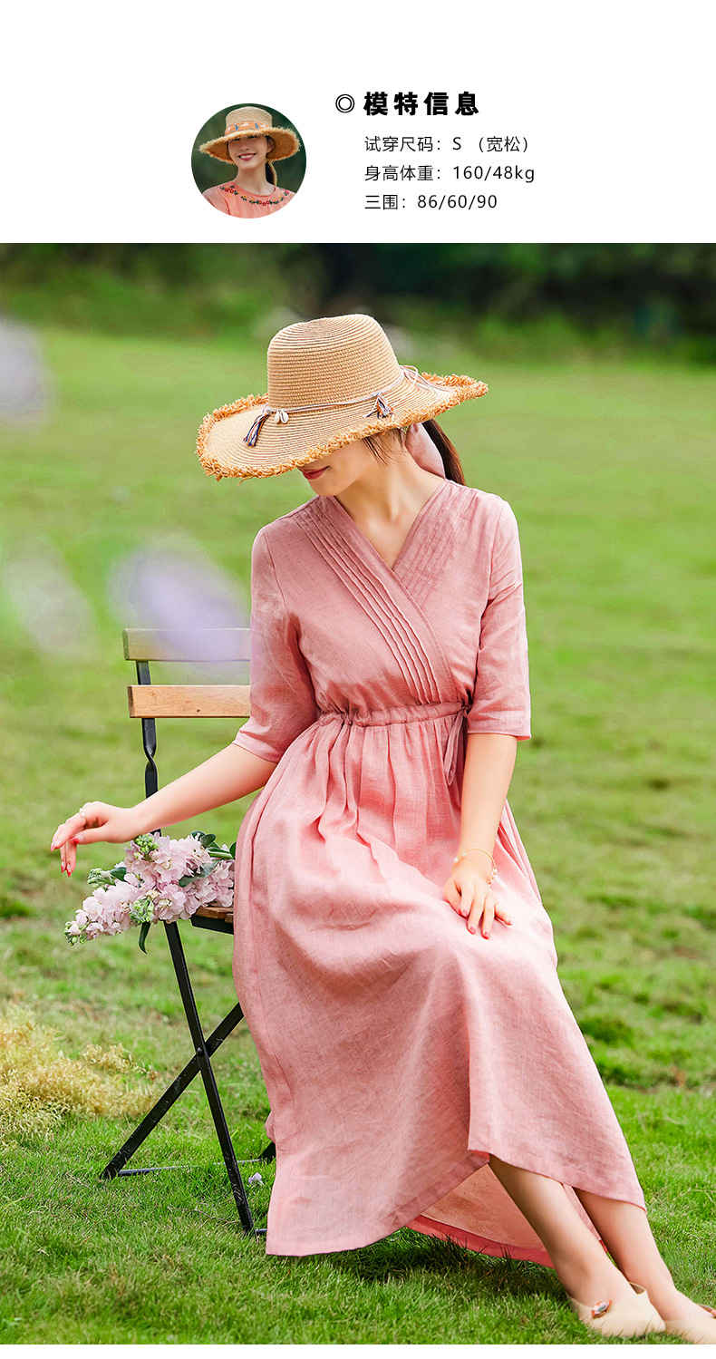 HM-C016春夏新款苎麻提花连衣裙文艺范气质V领风琴褶纯色大摆裙
