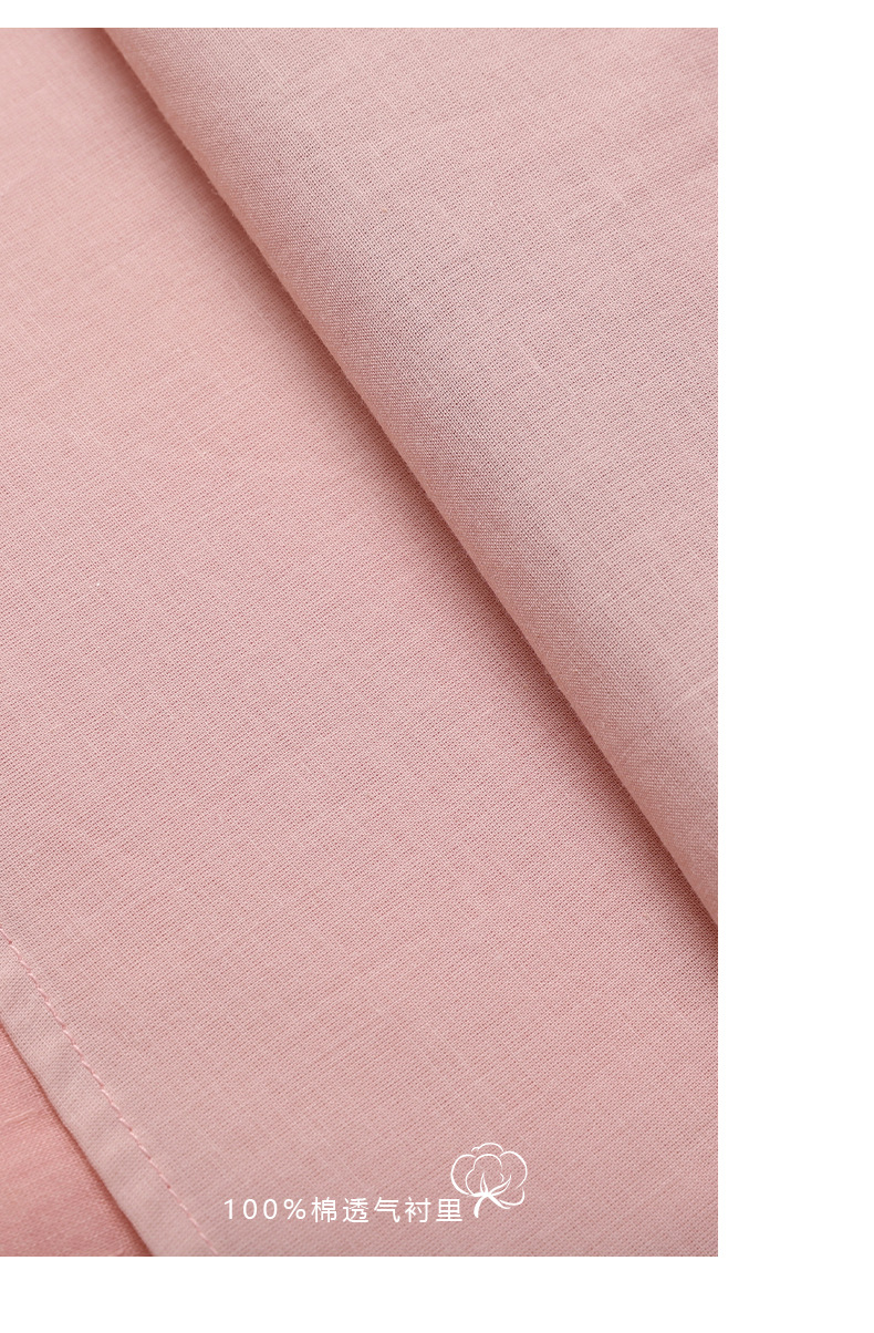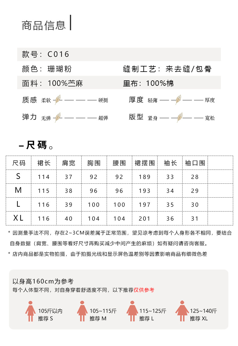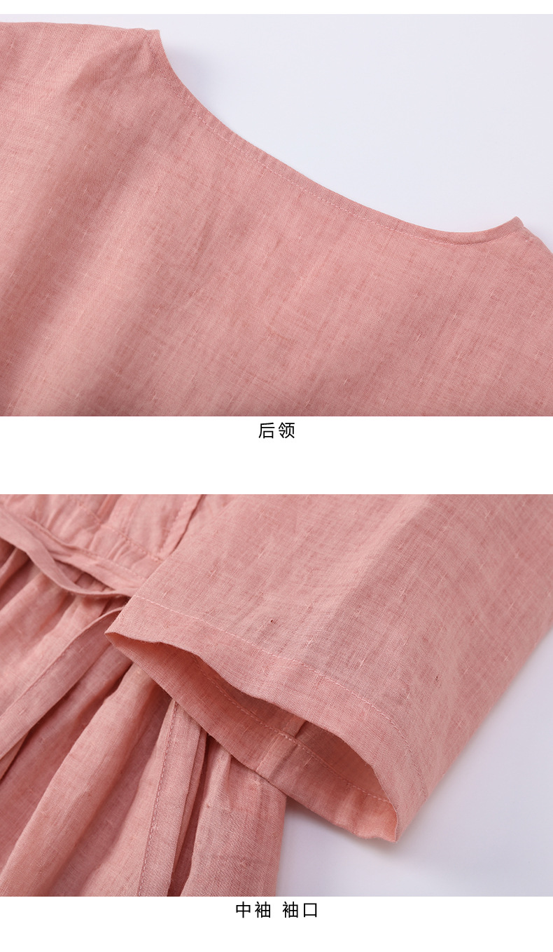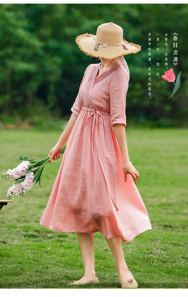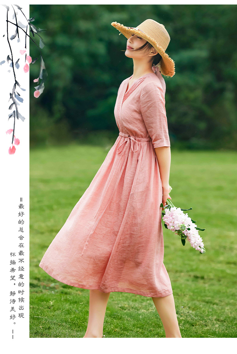 HM-C016春夏新款苎麻提花连衣裙文艺范气质V领风琴褶纯色大摆裙