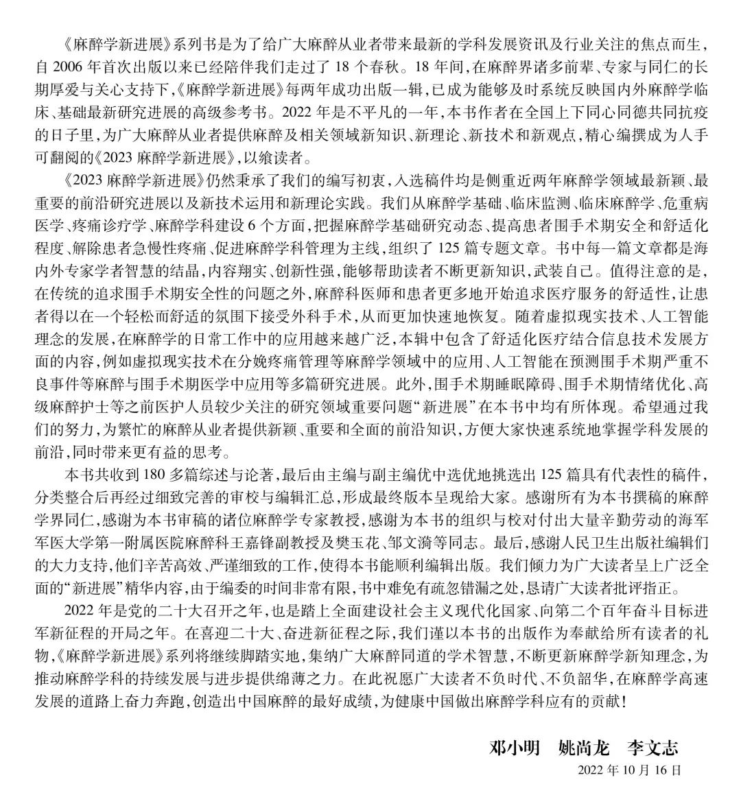 本书从麻醉学基础、临床监测、临床麻醉学、危重病医学、疼痛诊疗学、麻醉学科建设6个方面,把握麻醉学基础研究动态、提高患者围手术期安全和舒适化程度、解除患者急慢性疼痛、促进麻醉学科管理为主线,组织了125篇专题文章。书中每一篇文章都是海内外专家学者智慧的结晶,内容翔实、创新性强,能够帮助读者不断更新知识,武装自己。