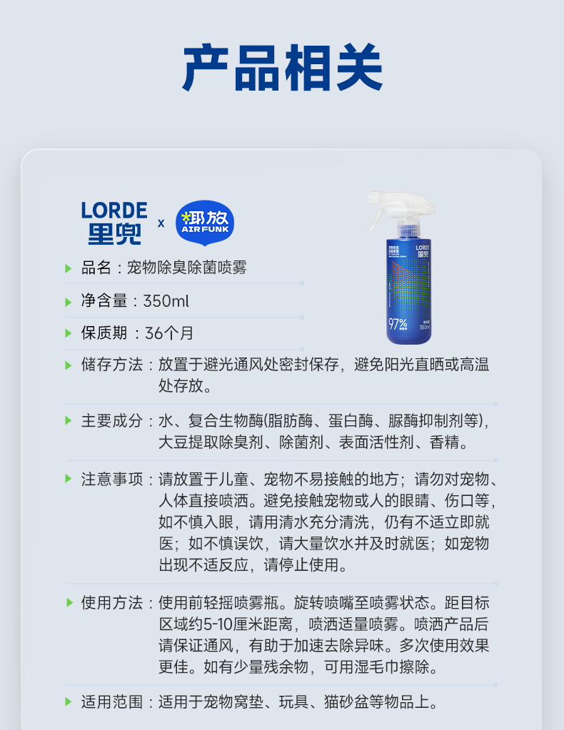 LORDE里兜宠物除臭剂生物酶分解剂除菌除味喷雾350ml