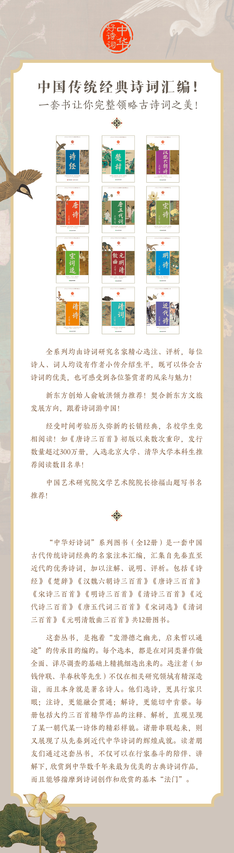 “中华好诗词”系列(全12册)囊括自先秦到近代各时期中国古诗词优秀作品,每一本都是由诗词研究名家精心选注、评析,读者们既可以从中体会古诗词的优美,也可以感受到各位鉴赏者的风采与魅力。可以说,这是一套更适合当代年轻人的诗词鉴赏入门书。