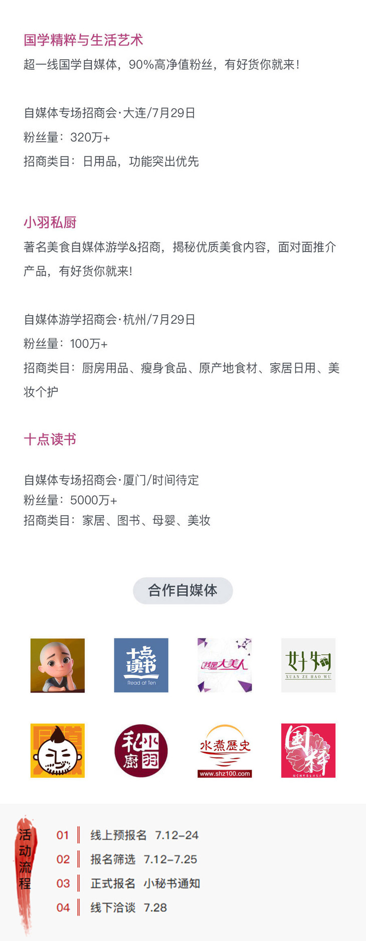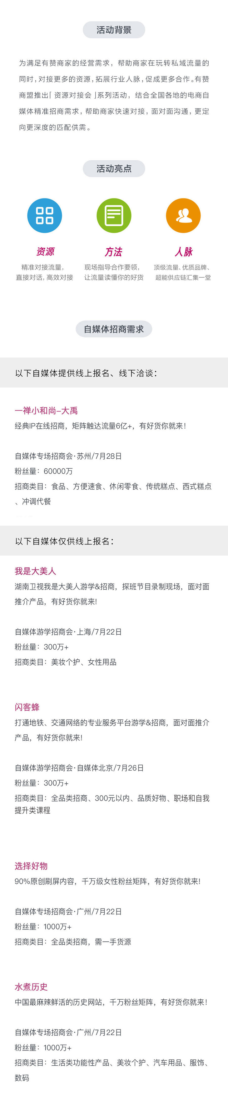 3、通过「一禅小和尚」选品的将会参加线下洽谈,与招商面对面沟通合作细节,苏州商盟将会收取399元门票,时间:7月28日,地点会在报名通过后通知。通过其他5家自媒体选品审核的,苏州商盟不组织线下洽谈,审核通过后各自媒体招商会联系沟通。