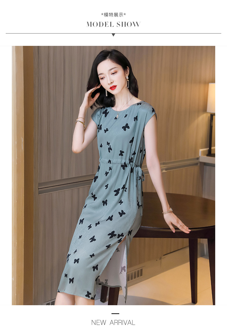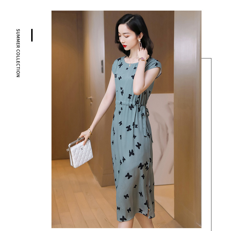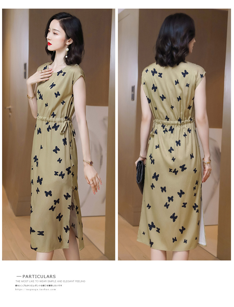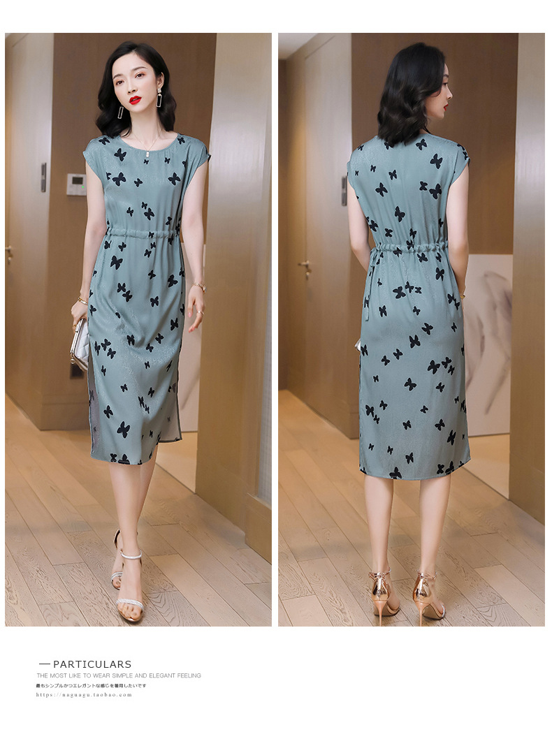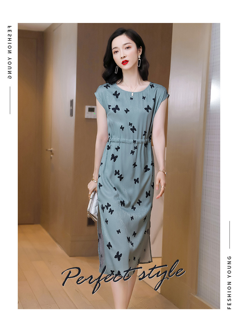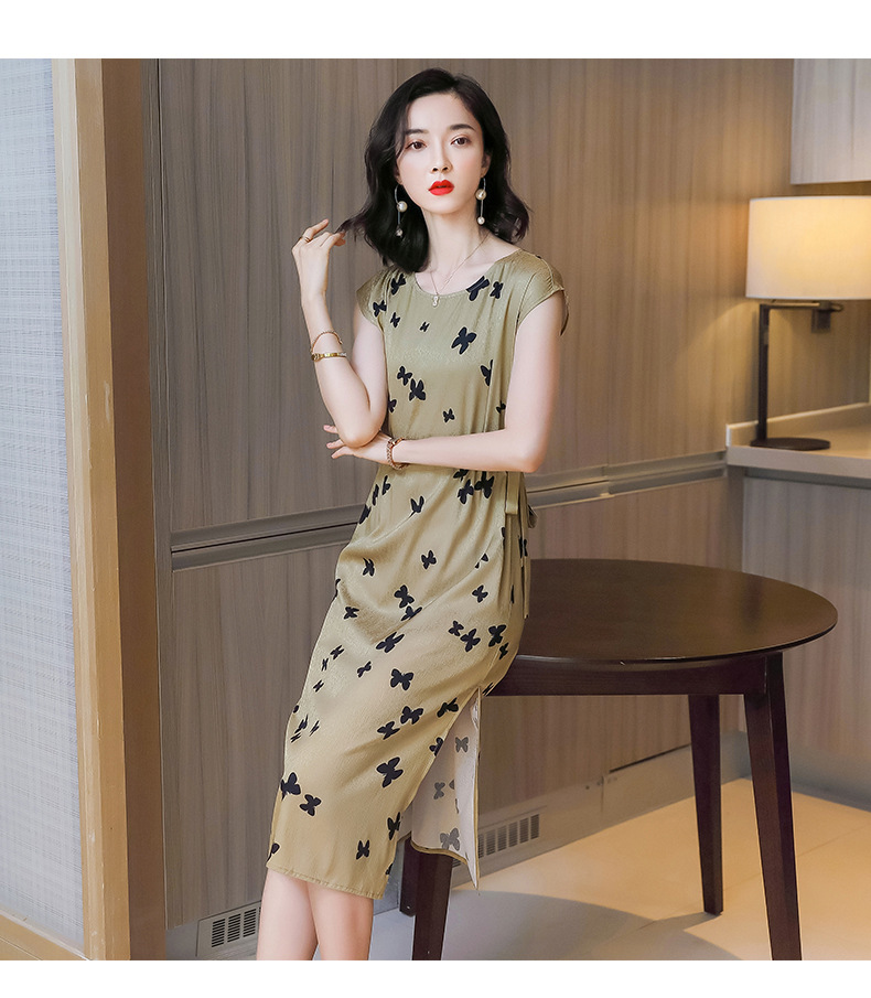 上海旗袍厂ASE-9115真丝连衣裙新款圆领蝴蝶印花优雅气质显瘦短袖桑蚕丝长裙