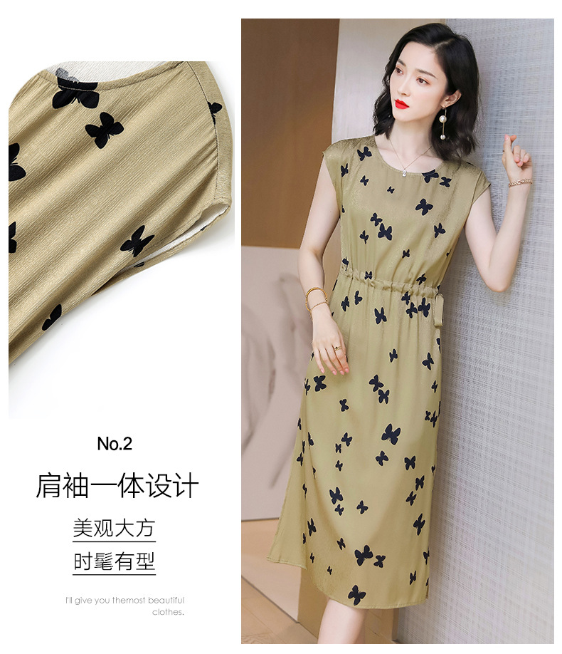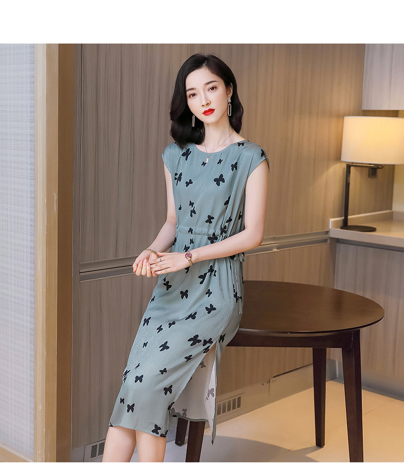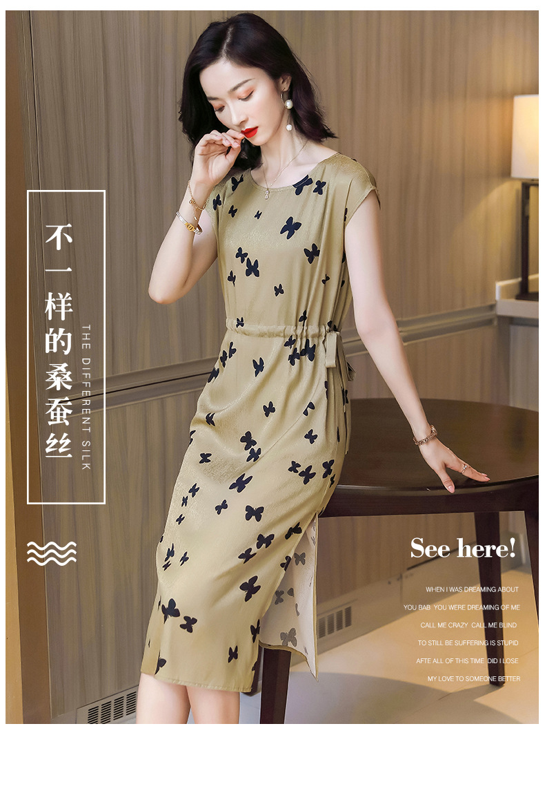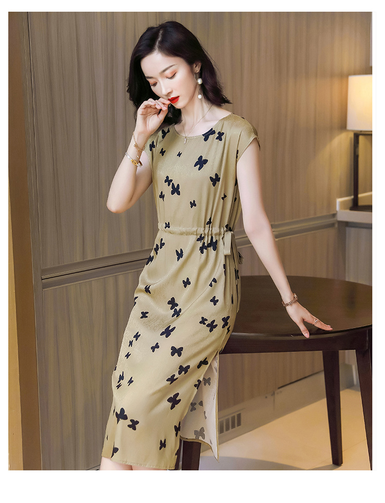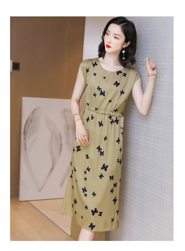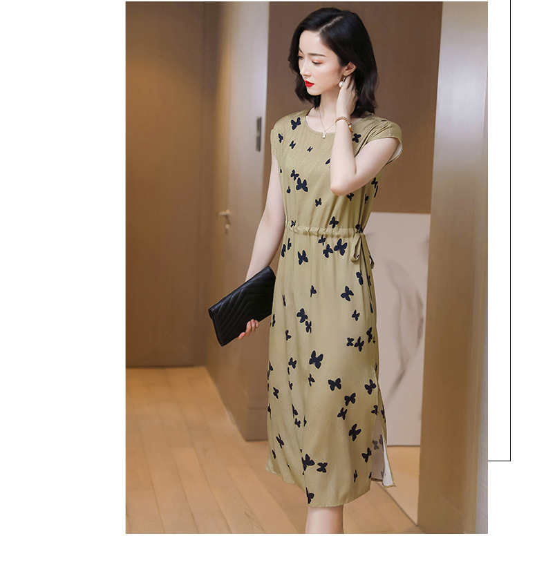 上海旗袍厂ASE-9115真丝连衣裙新款圆领蝴蝶印花优雅气质显瘦短袖桑蚕丝长裙