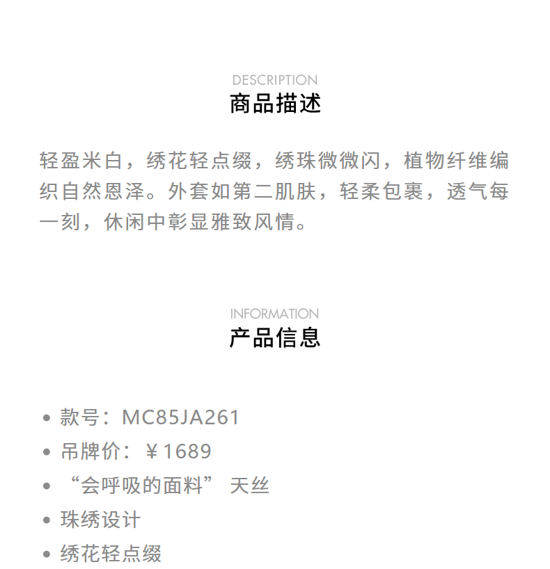 【海边度假-商场同款】MAXRIENY*休闲感重工珠绣轻盈外套(货号:MC85JA261)