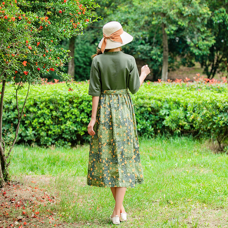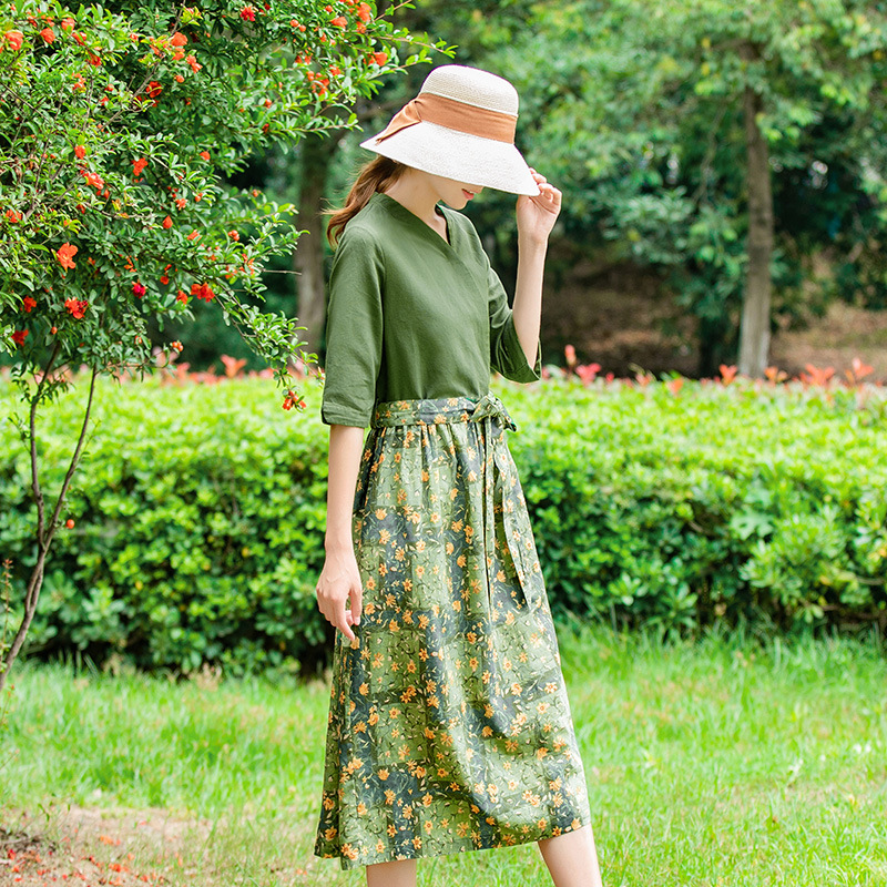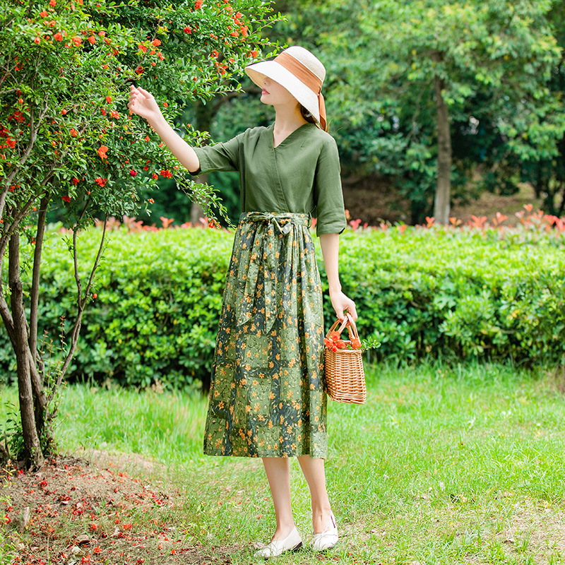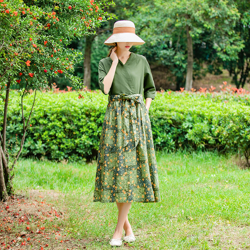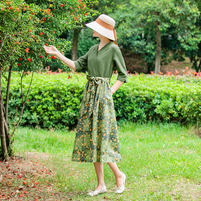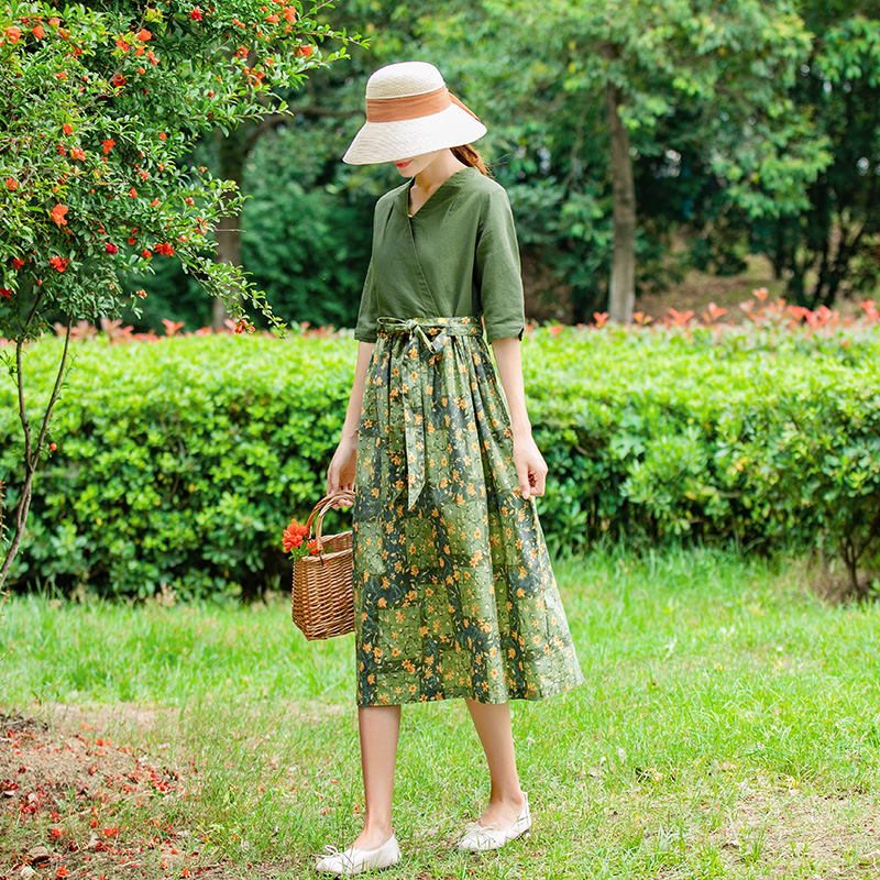 LT-025新款碎花亚麻连衣裙 夏季半袖系带修身A字长裙