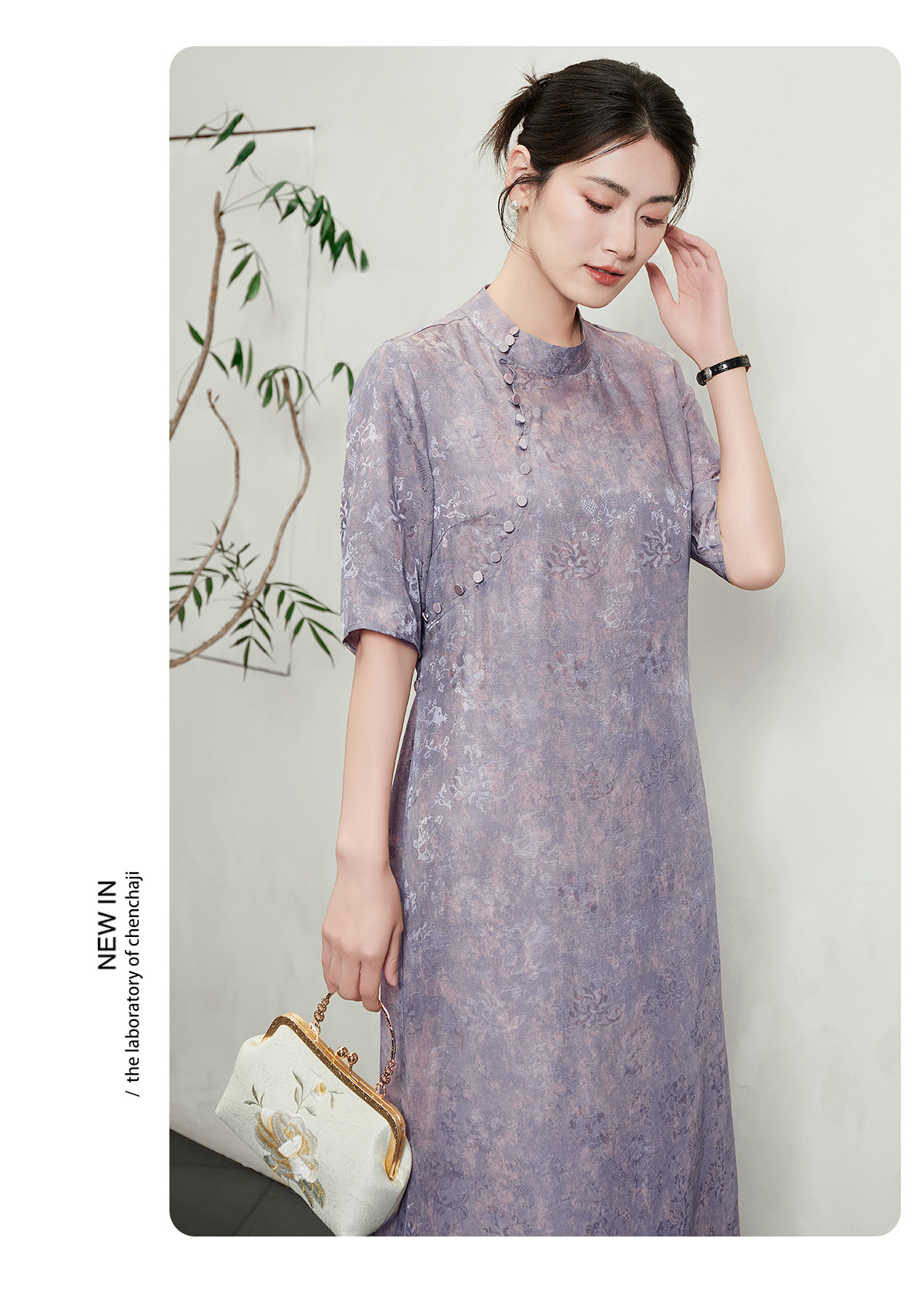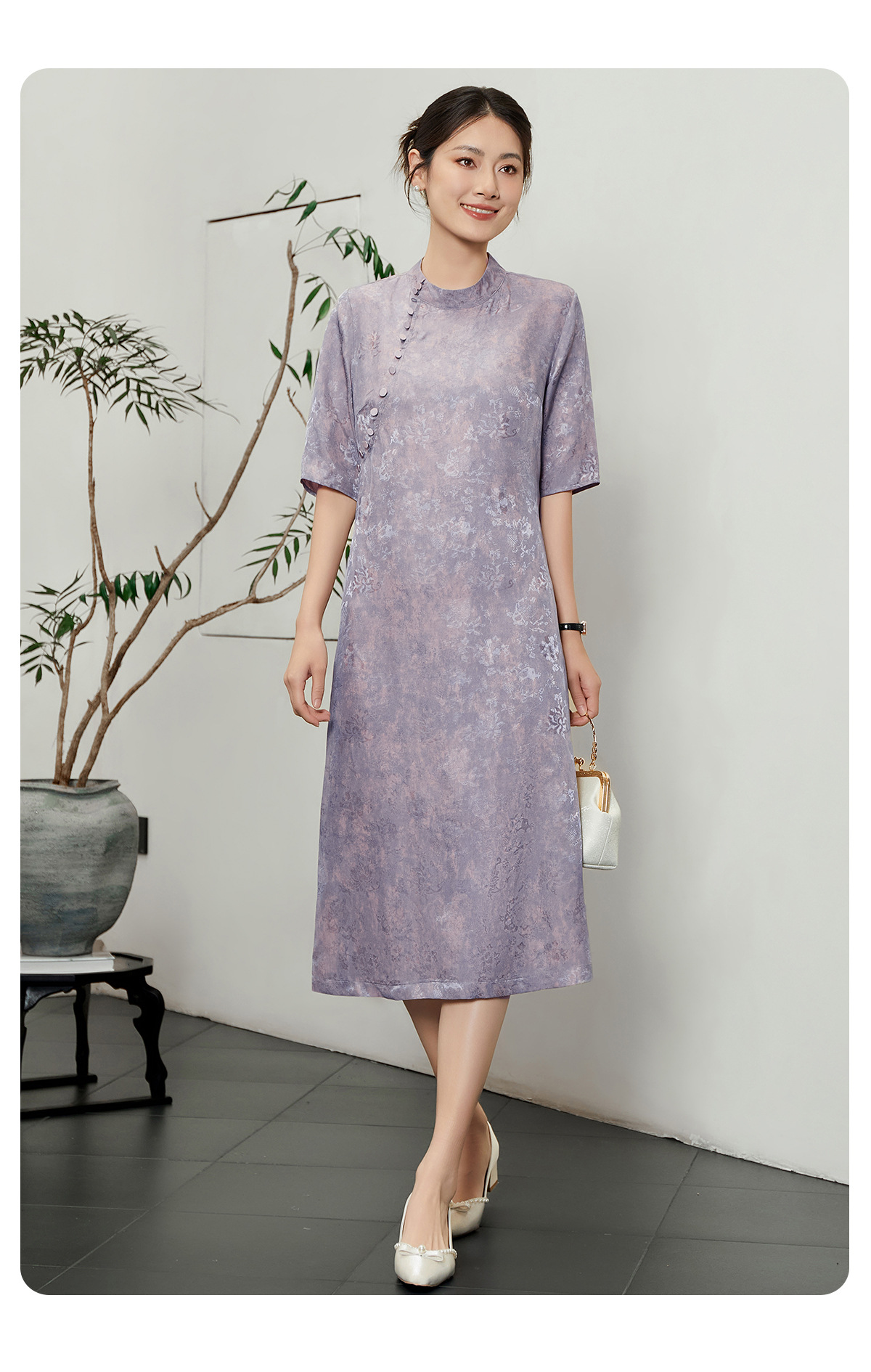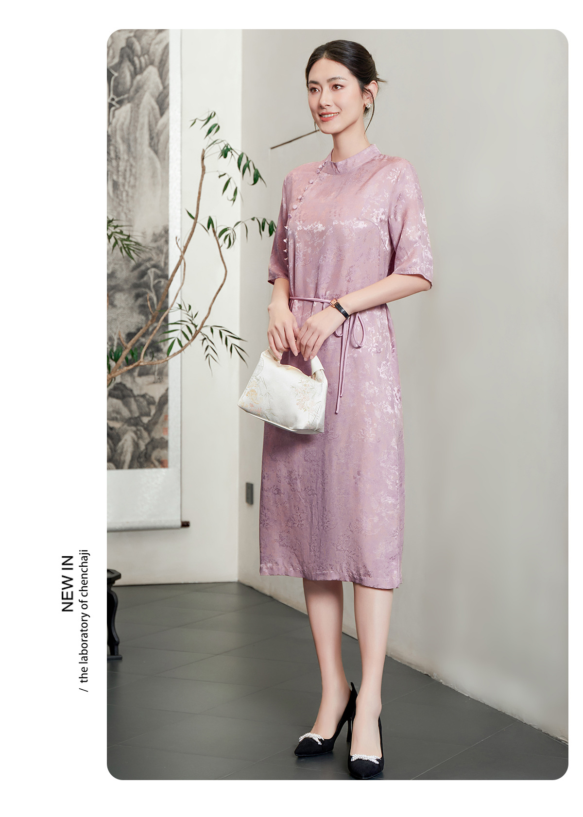 TC 54801改良新中式半高领显瘦复古暗纹提花桑蚕丝日常旗袍连衣裙 商品图0
