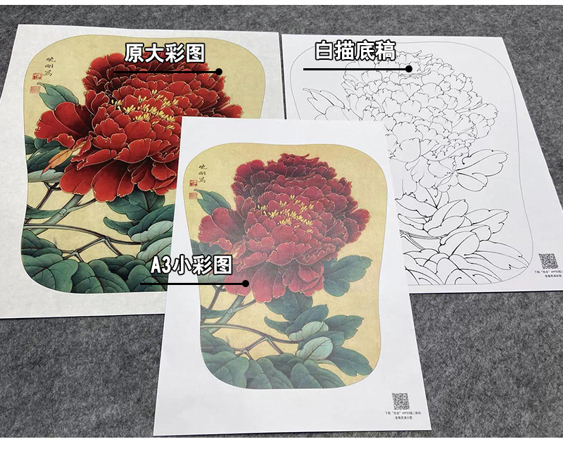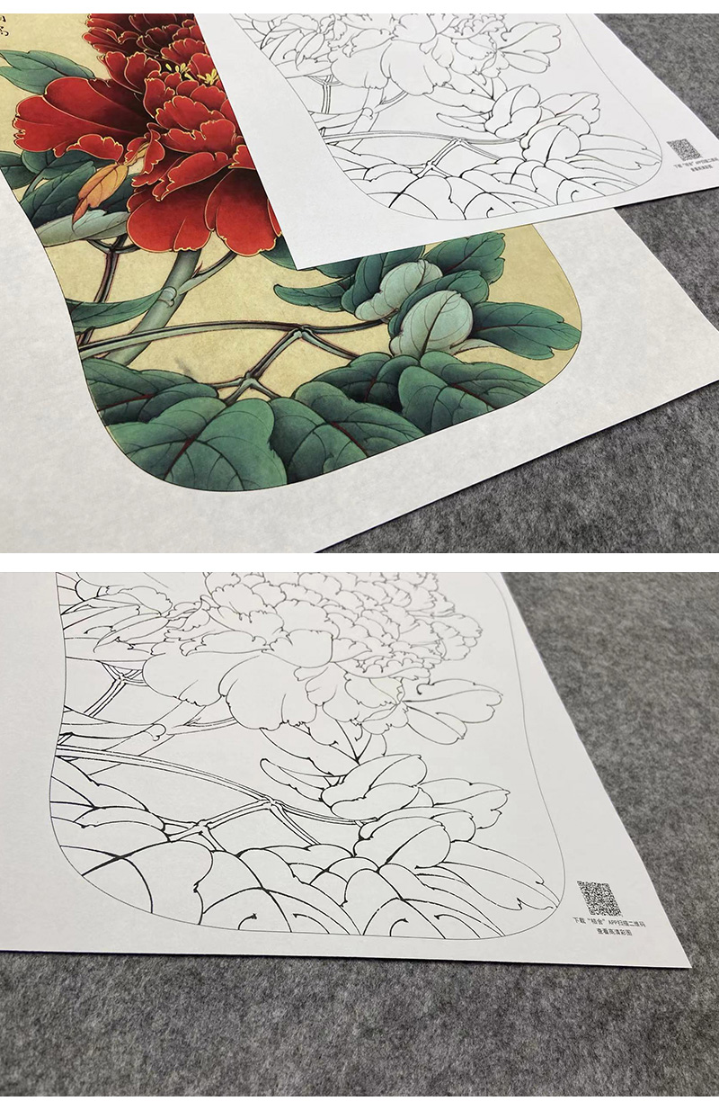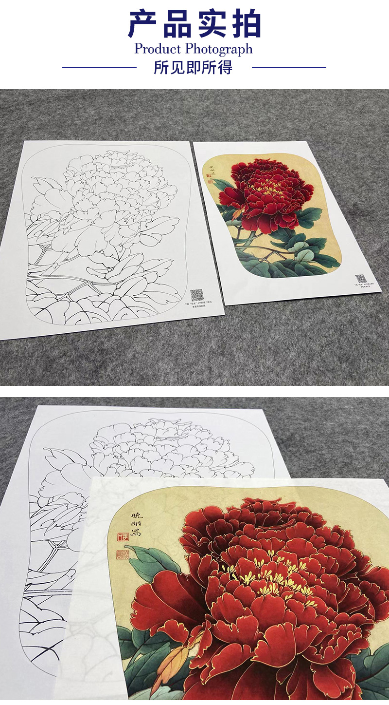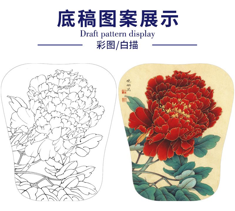 【大彩图】李晓明工笔画白描底稿宫扇《丹如火》牡丹临摹勾线花鸟线稿K008