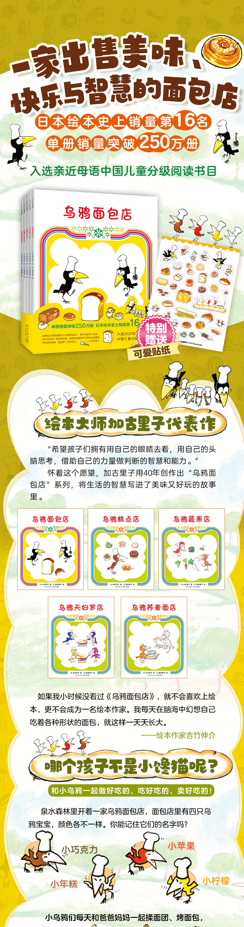 “乌鸦面包店”系列故事是绘本大师加古里子的代表作,自1973年在日本出版至今,单册销量突破250万册,累计印刷超过400次,是绘本·史·上的经典作品。加古里子将生活的智慧融入到美味又好玩的故事里,陪伴了一代又一代孩子成长。