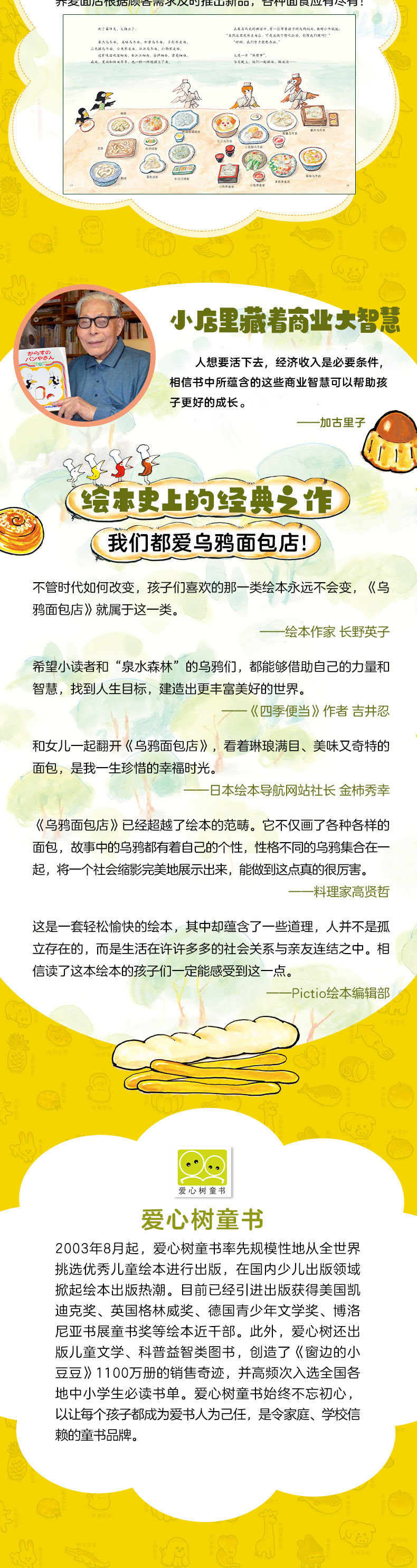 ★绘本大师加古里子的毕生愿望是:“希望孩子们拥有用自己的眼睛去看,用自己的头脑思考,借助自己的力量做判断的智慧和能力。”他用40年创作出“乌鸦面包店”系列绘本,将生活的智慧融入到美味又好玩的故事里,希望孩子从中学到必要的生存知识和经济常识,像小乌鸦一样乐观、勇敢地长大。