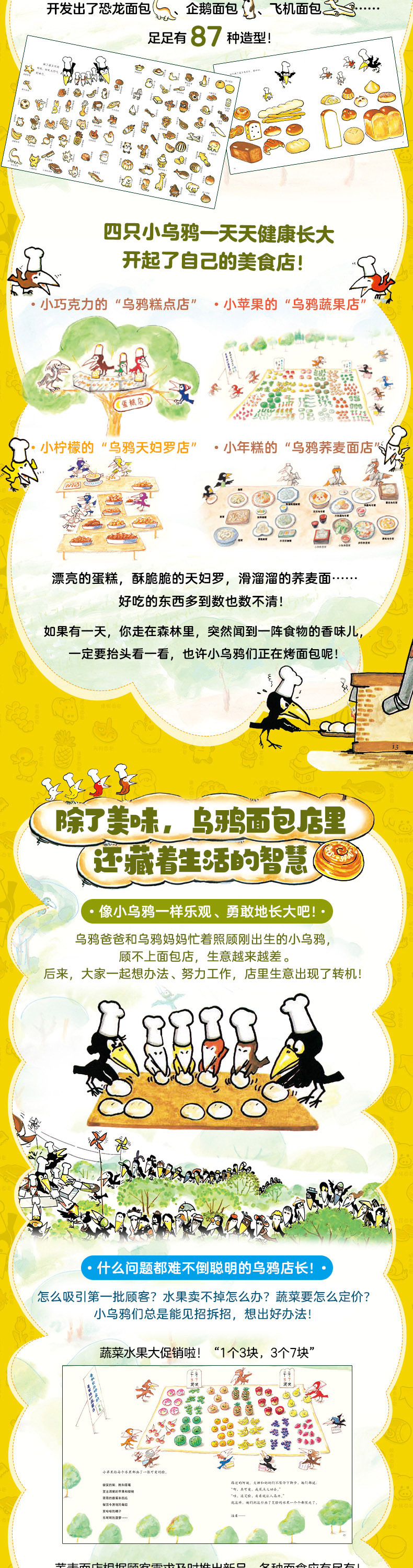 泉水森林里开着一家乌鸦面包店,店里有四只小乌鸦,分别叫小巧克力、小苹果、小柠檬和小年糕。乌鸦宝宝们每天和爸爸、妈妈一起揉面团、烤面包,开发出了恐龙面包、河马面包、企鹅面包、飞机面包……足足有87种造型!乌鸦面包店的生意越来越好,四只小乌鸦也***天健康长大,开起了自己的美食店……