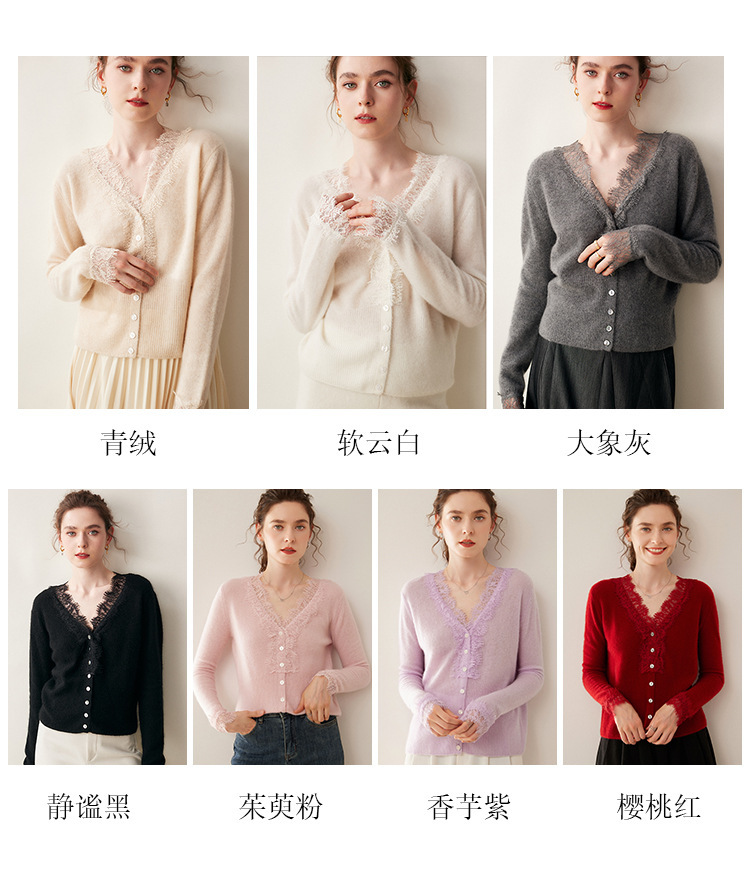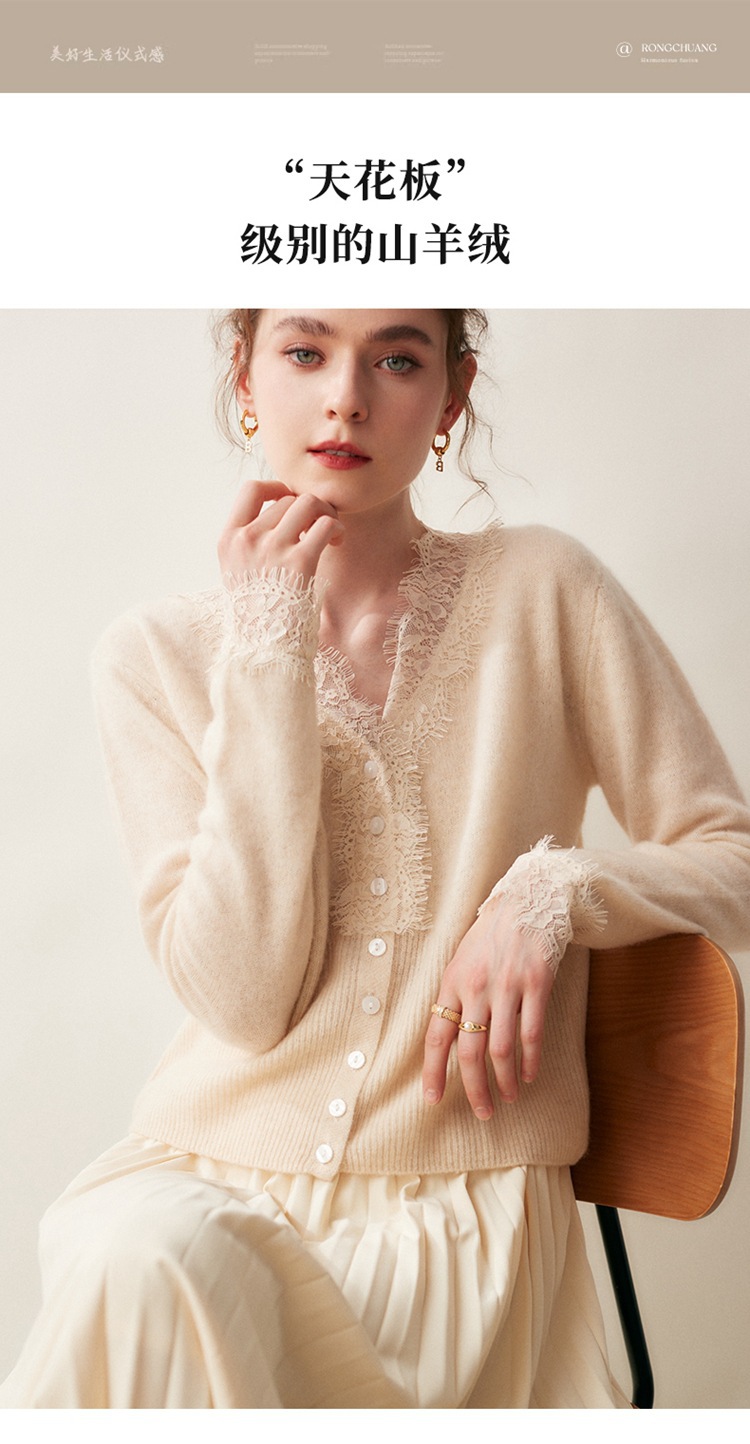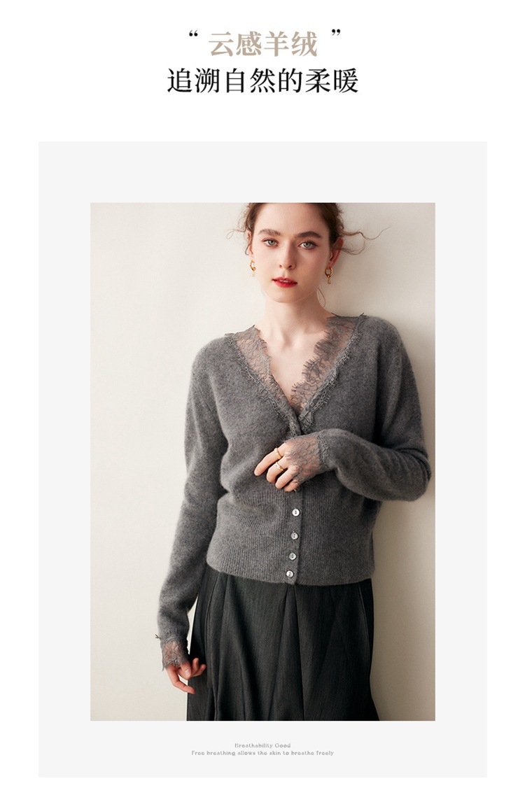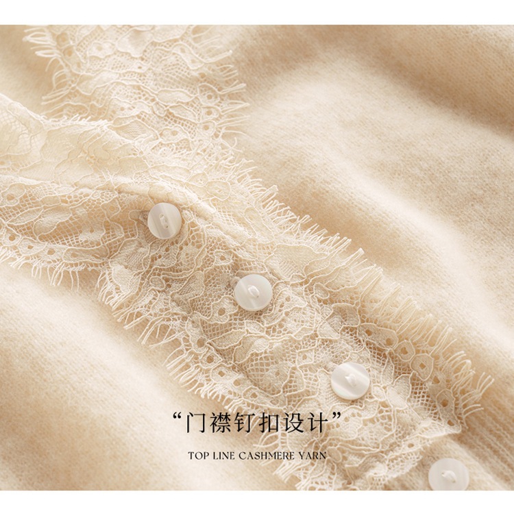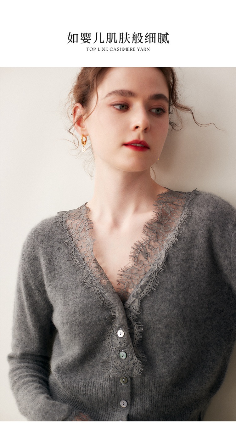 【自】全新升级【铂金会员422/天猫569/差价147】(21706) 洛诗琳鄂尔多斯100纯羊绒蕾丝花边V领针织羊绒开衫女