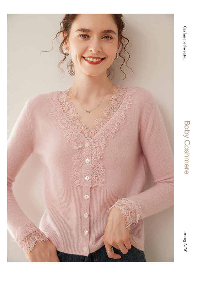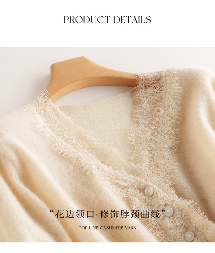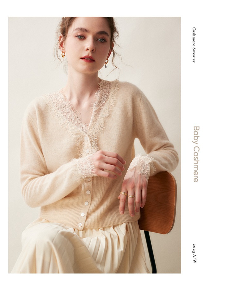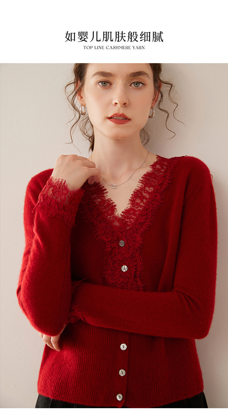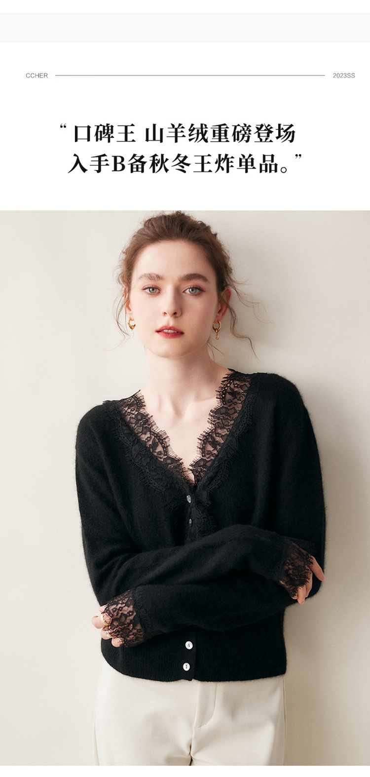 【自】全新升级【铂金会员422/天猫569/差价147】(21706) 洛诗琳鄂尔多斯100纯羊绒蕾丝花边V领针织羊绒开衫女