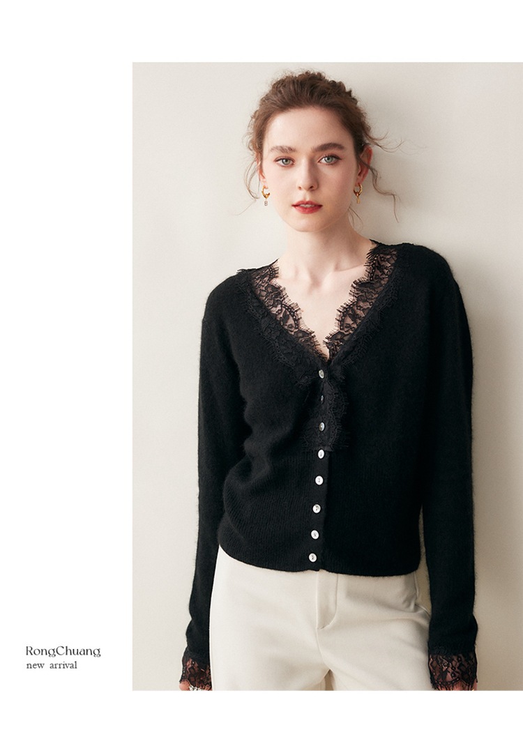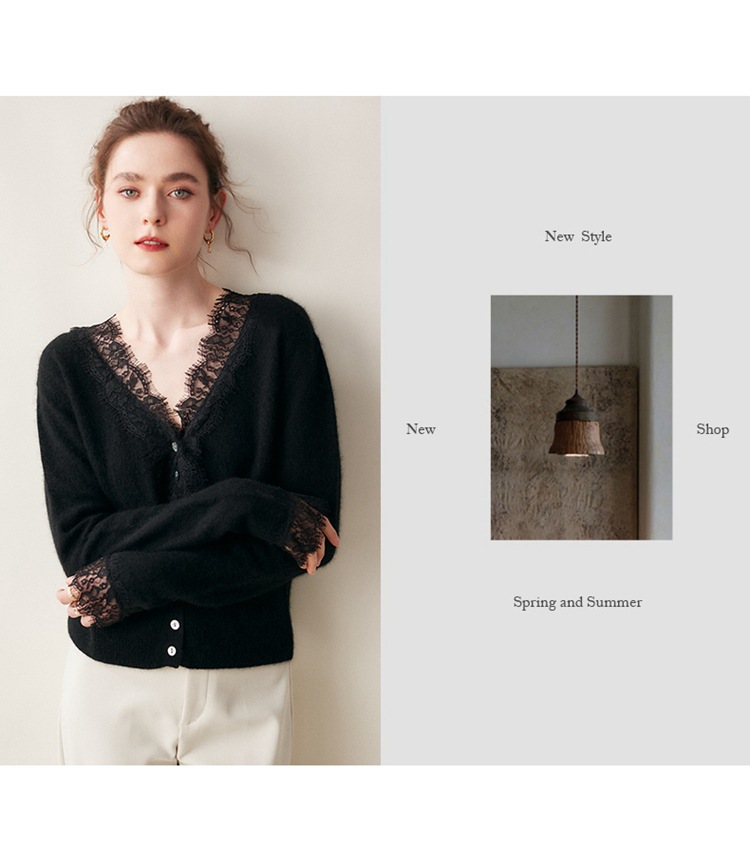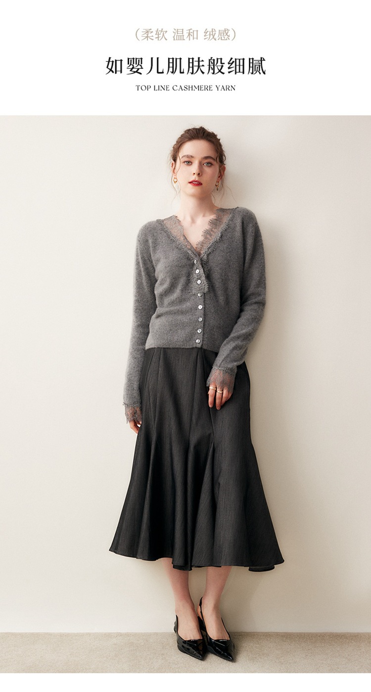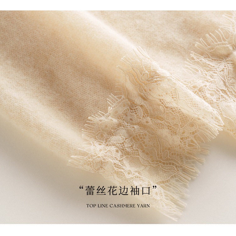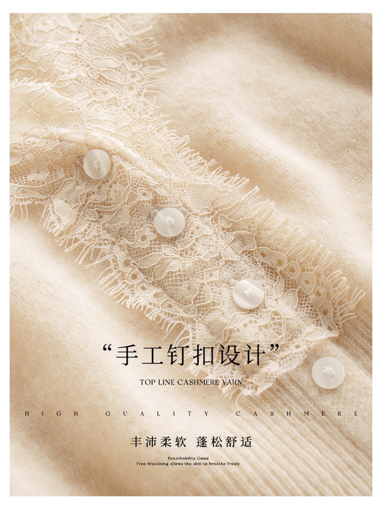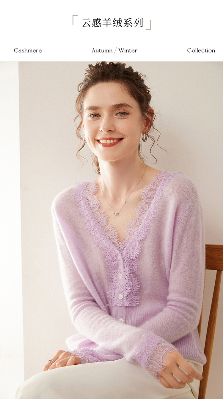 【自】全新升级【铂金会员422/天猫569/差价147】(21706) 洛诗琳鄂尔多斯100纯羊绒蕾丝花边V领针织羊绒开衫女