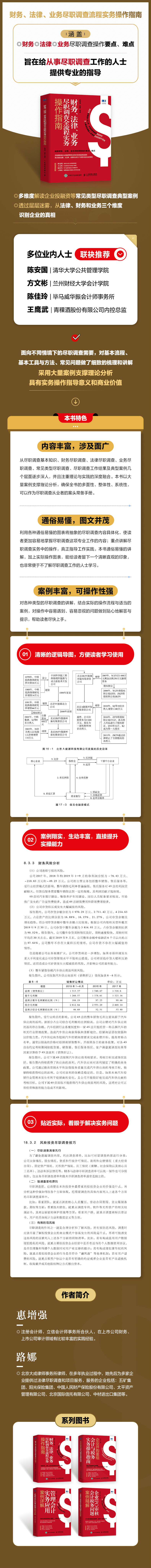 1. 内容丰富 金融机构和各类非金融企业在目前经济下行的趋势下面临潜在风险,须对商业合作对象进行尽职调查,获取详尽的企业数据,从而规避风险。本书在对尽职调查流程、基本方法与工具进行阐述的基础上,对财务、法律以及其他常见类型的尽职调查进行展开介绍。旨在为开展尽职调查工作的专业人员和经管类在校本科生提供一套易于理解且能快速上手的尽职调查系统知识,为信用服务提供资料参考。 2.精彩案例 本书第六篇详细介绍了尽职调查工作底稿的撰写、分类阐述尽职调查工作报告,并展示了尽职调查综合案例。通过案例的形式,可以把尽职调查理论要求具体化到日常的业务处理之中,是把理论与实务连接在一起的桥梁与纽带。 3.深入分析实战 在很多情况下,只是被动了解尽职调查的重要性,是很难理解其作用及其本质要求的,也很难做到灵活的应用。本书从实战出发,处处进行深度分析,不仅向读者阐述怎么办,更是强调说明为什么这么做,帮助开展尽职调查工作的专业人员和经管类在校本科生进行应用。