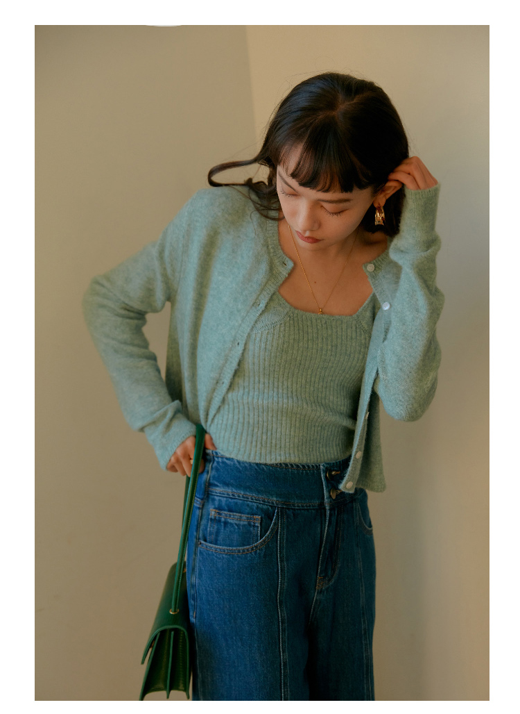 新开版了店铺同款针织开衫套装——Tiffany蒂芙尼绿 时尚活力!更加具有春天的气息 两件式设计,可分为短款开衫+U领小吊带 这两件分开单穿还是一起与外套叠穿 都是特别时髦的穿法 (小背心四季通吃,可以单穿搭配西装,衬衫..也可以和 开衫一起叠穿到大衣风衣里)