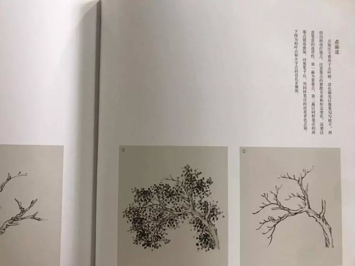 设色浅先以墨笔勾写枝干,再沿出枝处打墨点,