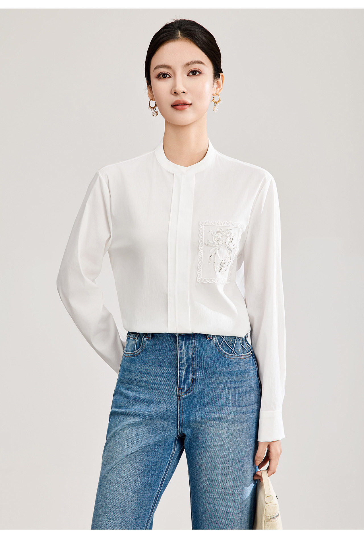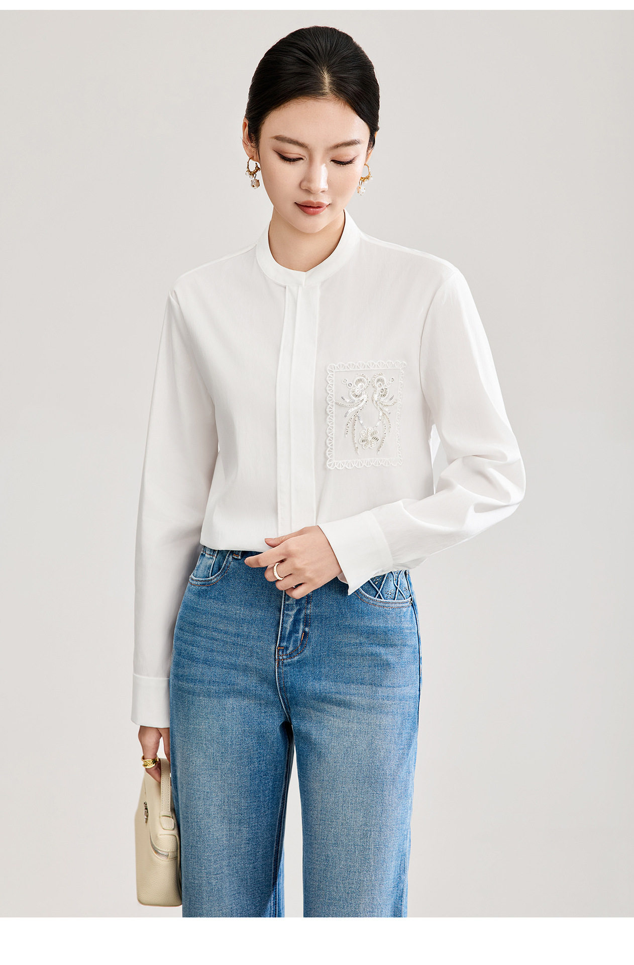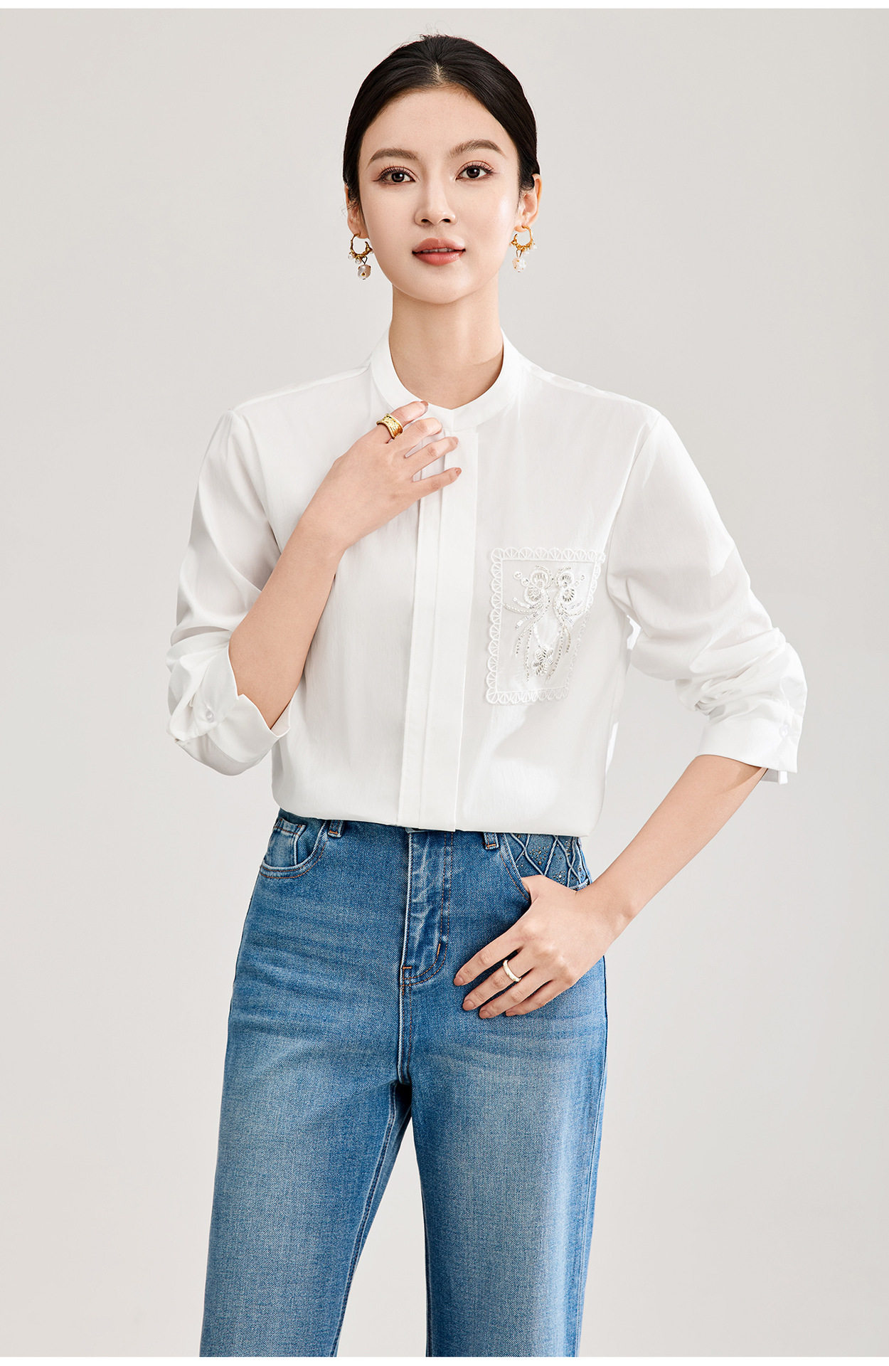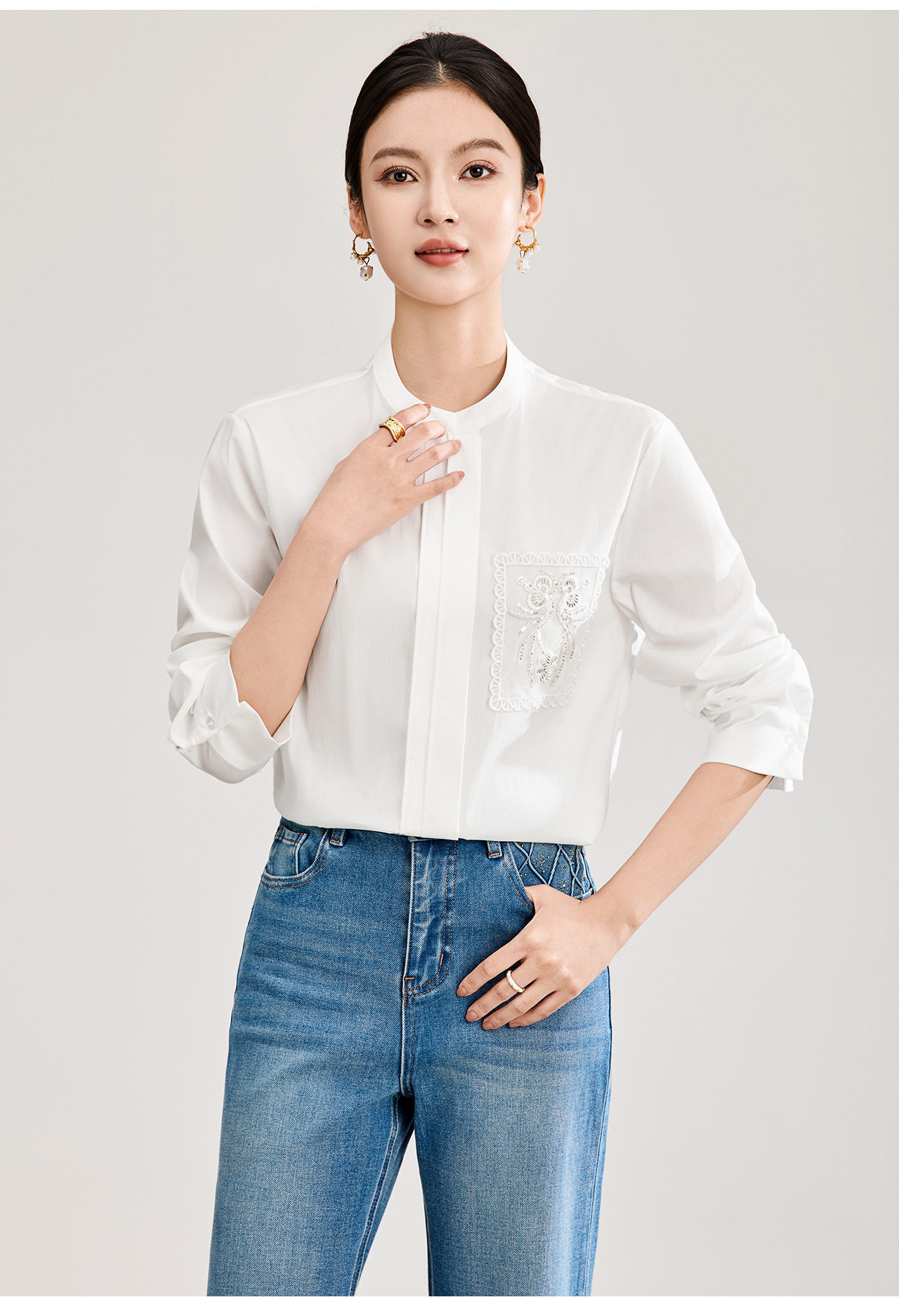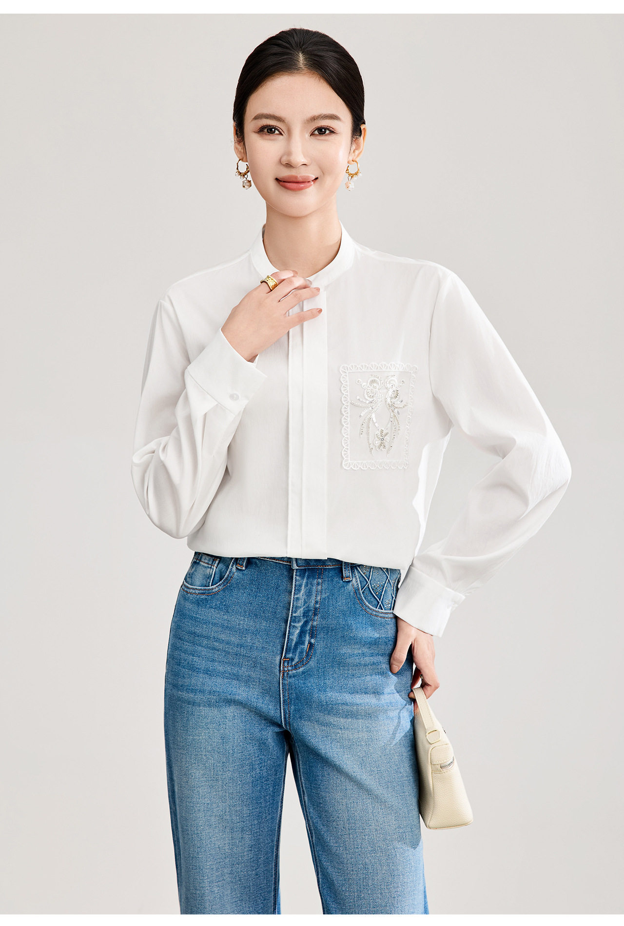 「高货wl」全新升级【铂金会员275/天猫369/差价94】(12230)洛诗琳2026春季新款简约淡雅天丝棉钉珠亮片刺绣长袖衬衫