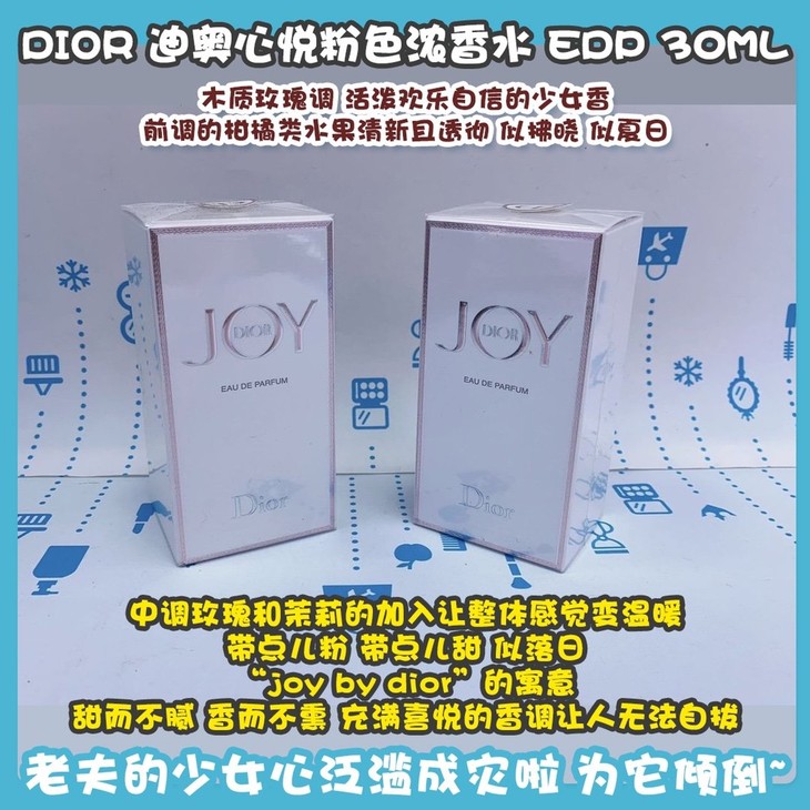 DIOR 迪奥心悦粉色浓香水 EDP 30ML👍木质玫瑰调,活泼欢乐自信的少女香😝。前调的柑橘类水果清新且透彻,似拂晓,似夏日☀。中调玫瑰和茉莉的加入让整体感觉变温暖,带点儿粉,带点儿甜,似落日🌥。“joy by dior”的寓意,甜而不腻,香而不熏,充满喜悦的香调让人无法自拔😘,情不自禁~整体香气清澈,充满层次感👯。粉嫩香水透过晶莹剔透的瓶身,老夫的少女心泛滥成灾啦💓,为它倾倒~