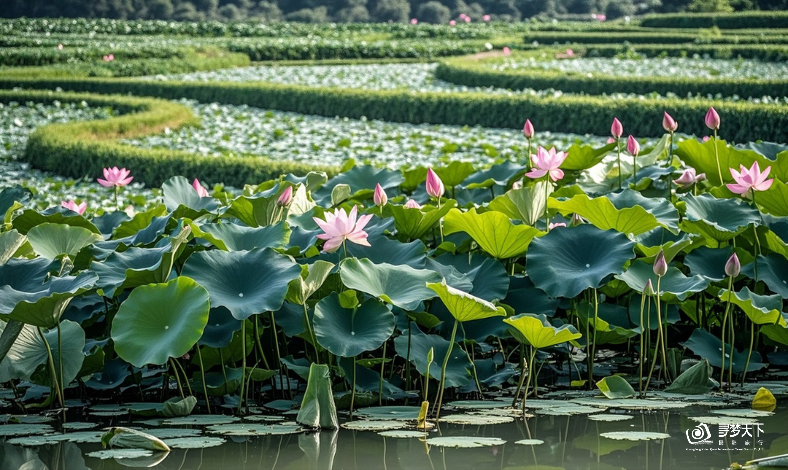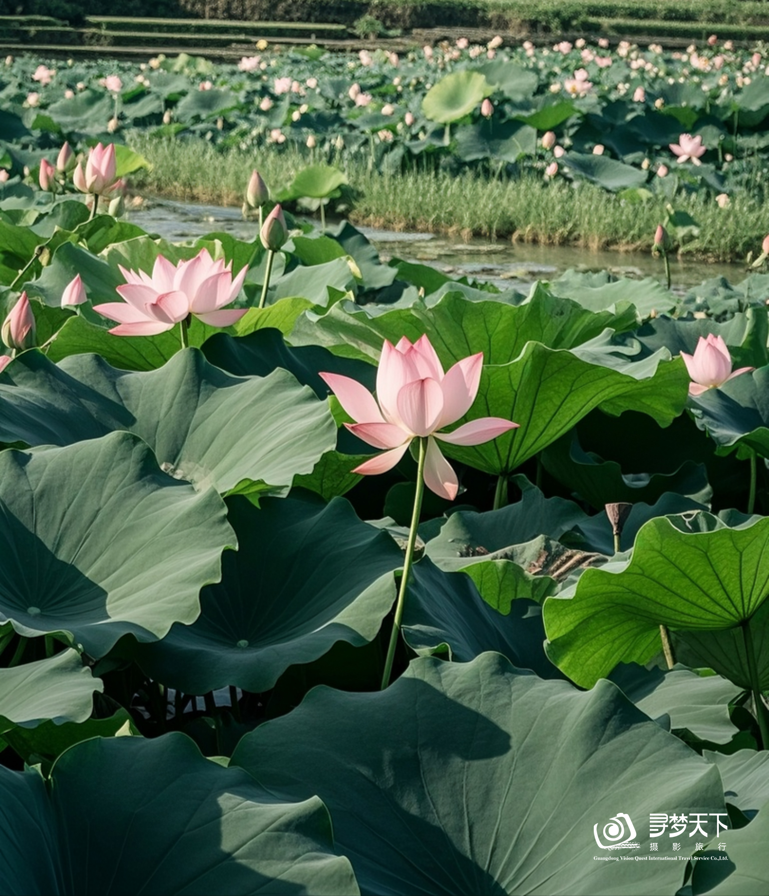 荷花季(6-8月):千亩荷花盛开,晨雾缭绕。