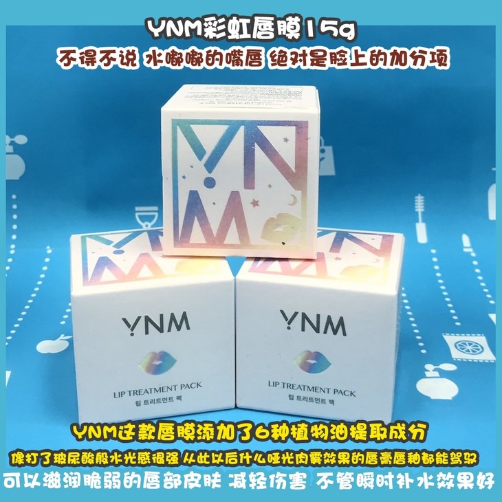 YNM彩虹唇膜15g👍不得不说,水嘟嘟的嘴唇💦绝对是脸上的加分项!YNM这款唇膜添加了6️⃣种植物油提取成分,在去死皮的同时🙅,可以滋润脆弱的唇部皮肤👄,减轻伤害。不管瞬时补水效果好,它的保湿持久度也很经得起考验🕓!有效改善受损和角质严重堆积的双唇,给受损的唇部集中护理✔,就像打了玻尿酸般水光感很强✨,从此以后什么哑光肉雾效果的唇膏唇釉都能驾驭🐴~