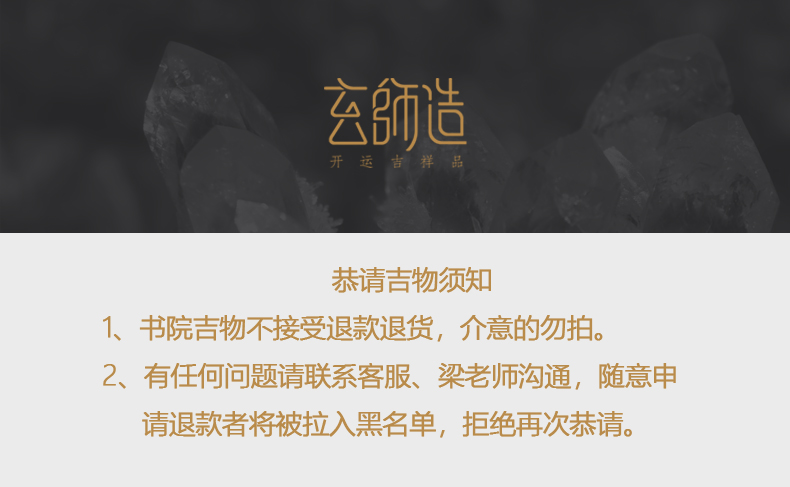 4、本书院灵符、吉物不接受退款、退货、中差评,介意的勿拍!不能接受天然水晶有缺陷问题的、在本书院申请过退款退货成功的、好评率低于99.8%的缘主请勿拍!
